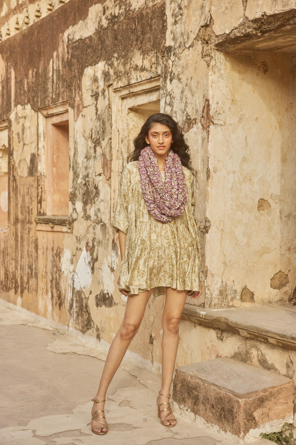 The ivory deer printed short dress is crafted from pure chiniya silk with delicacy of gathering details. Here's to celebrating the small everyday joys with this short dress.