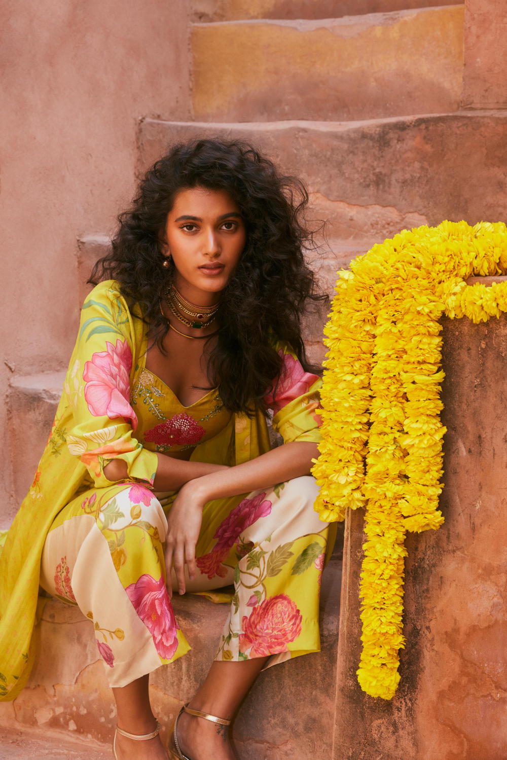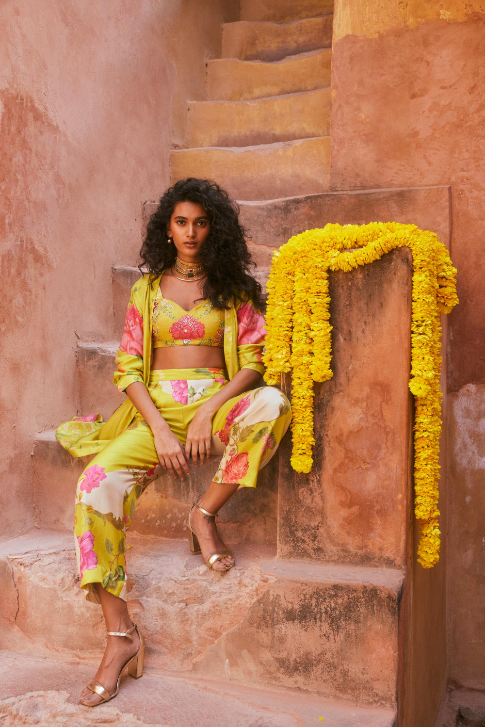 The lime yellow robe jacket set is cheerful and fresh with its color combinations and placement, blouse is adorned with print hand highlighted embroidered details. Pair this easy set with stack of gold chunky jewellery and you are ready to go for modern haldi day on a hot summer morning.