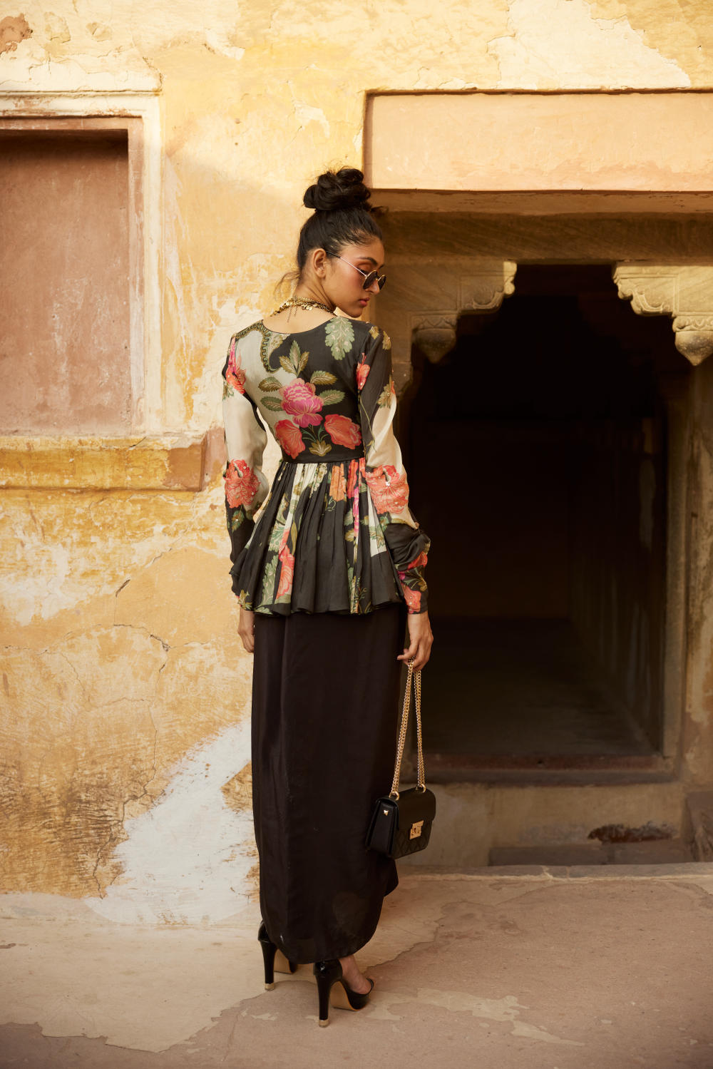 Our black peplum is crafted in beautiful pink and orange floral printed pure habutai silk fabric. It is intricately hand embroidered with zardosi technique along with ivory pearl beads all over the yoke and sleeves with beautiful drawstring tassel details, it is paired with pre draped skirt.