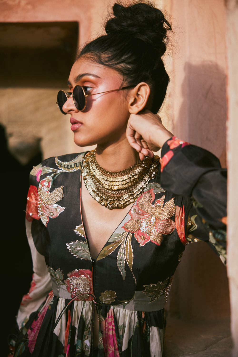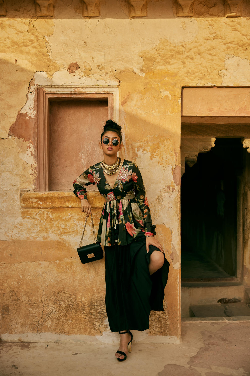 Every collection begins long before the garment is stitched: months of research into India’s rich craft traditions, followed by the painstaking creation of detailed illustrations. These artworks are then scanned, enhanced with jewel-toned palettes and touches of rich gold, and finally translated onto fabric. The result is a visual language so distinct that their name has become synonymous with print, colour, and the kind of glamour that still feels feather-light.
