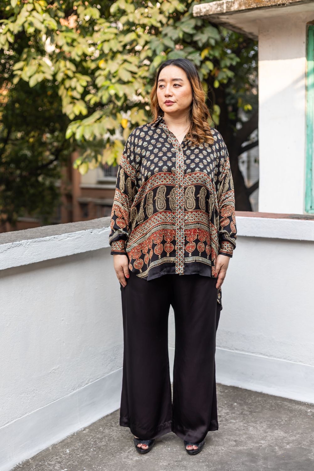 Black Ajrakh hand-block printed satin hi–low shirt with coordinated pants.