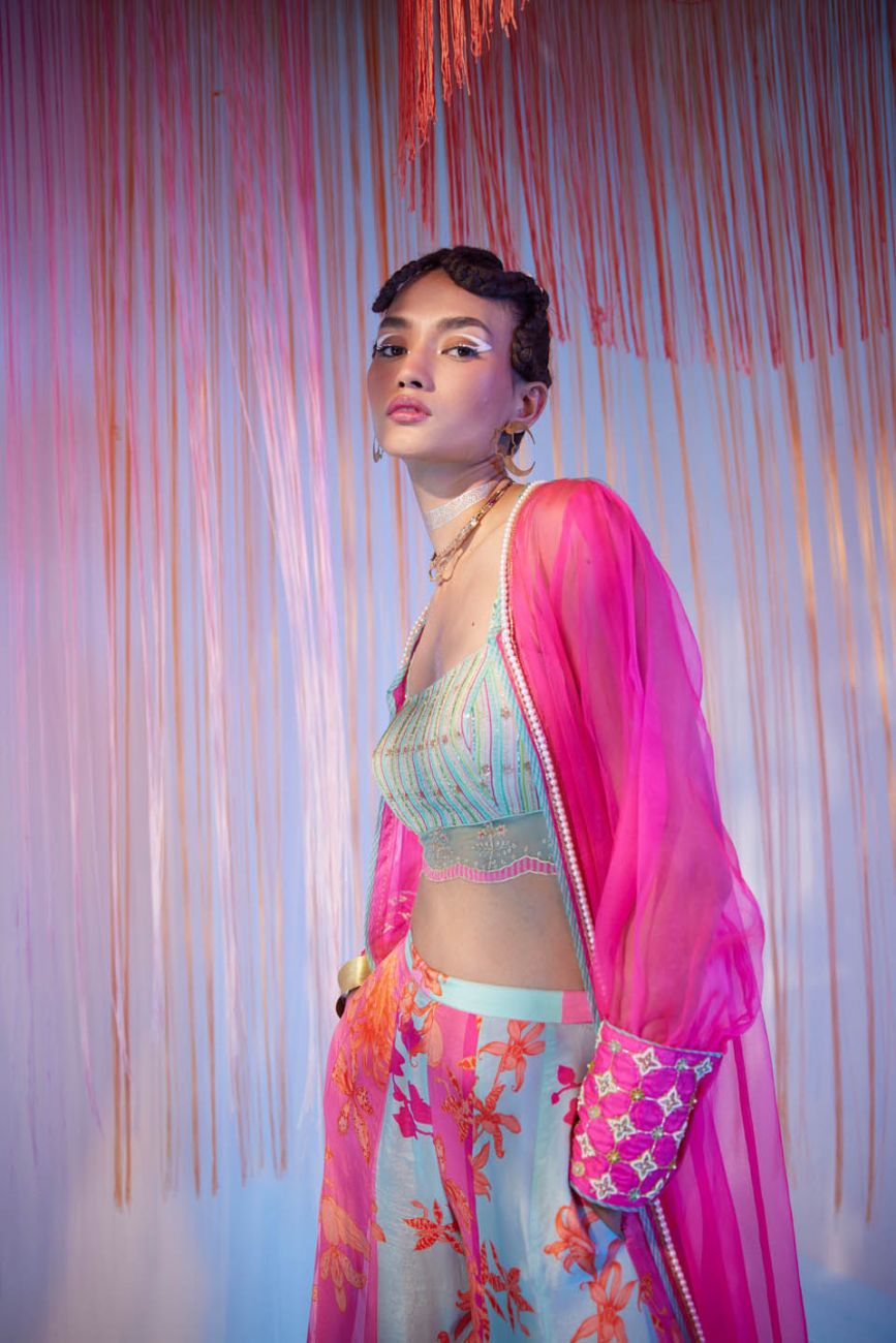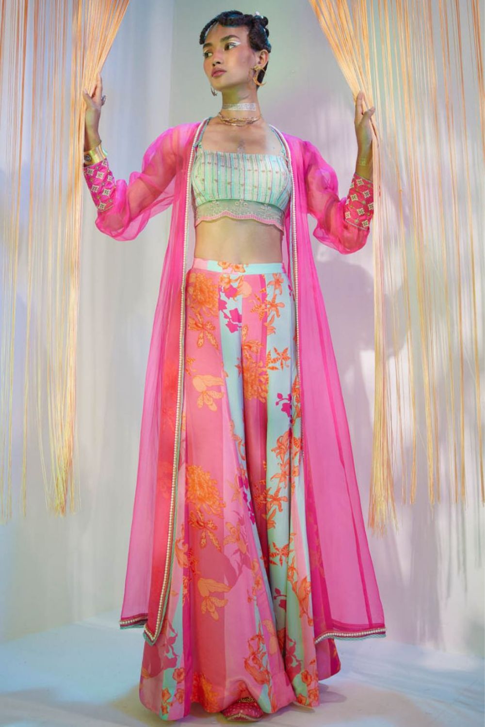 Hot pink silk organza jacket with hand embroiderd cuffs and bustier. Along with pink printed crepe flaired sharara pants.