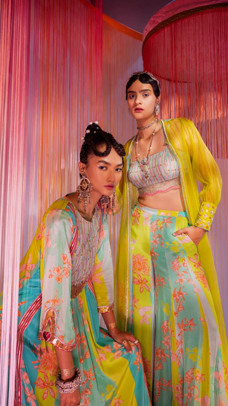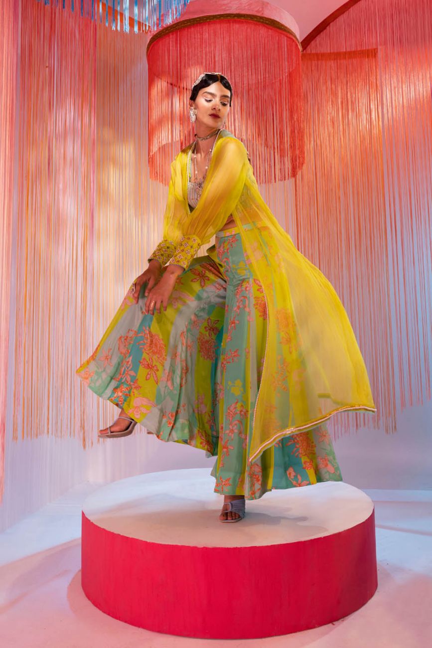 Lime green silk organza jacket with hand embroiderd cuffs and bustier. Along with ferozy printed crepe flaired sharara pants.