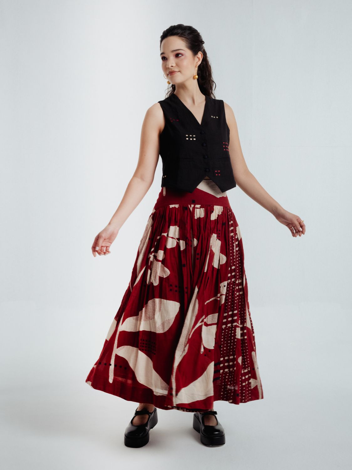 This bohemian black waistcoat showcases delicate embroidery in contrasting red and beige hues that beautifully complement the skirt. Crafted from fine handwoven organic cotton spun in Bengal, it features a lined interior for a crisp, structured fit.Versatile and elegant, this waistcoat pairs effortlessly with the skirt or can be styled with various pieces from your wardrobe.