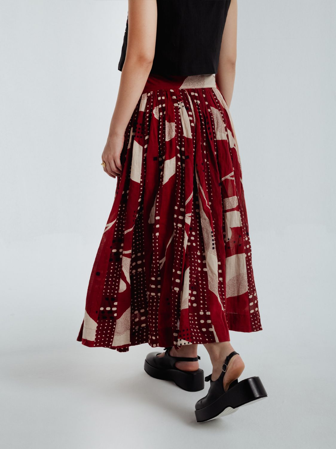 This bohemian skirt features 40 delicate panels with two contrasting prints that gently cascade into a subtly textured fabric, enhancing its overall structure. A broad waistband skirt provides a fitted look at the waist, allowing the skirt to fall beautifully and create graceful volume.