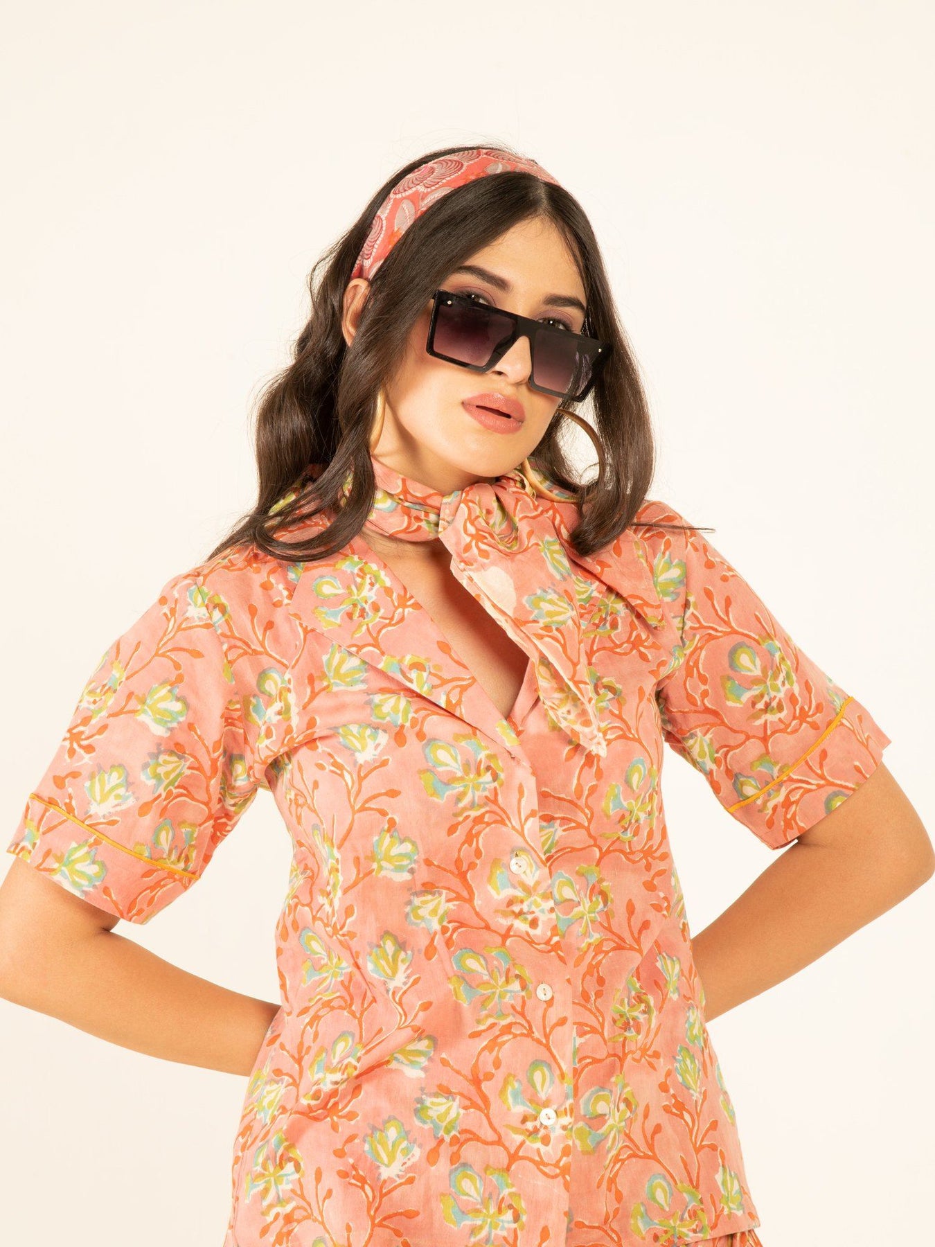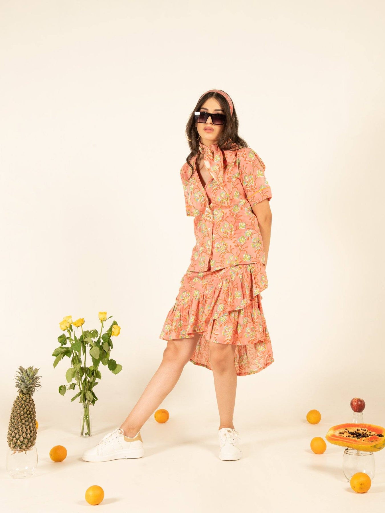 Chic co-ord set with afro-inspired blooms hand printed on a cotton base. Ruffle detailed skirt with shirt style button up top. Perfect companion for those beach holidays.