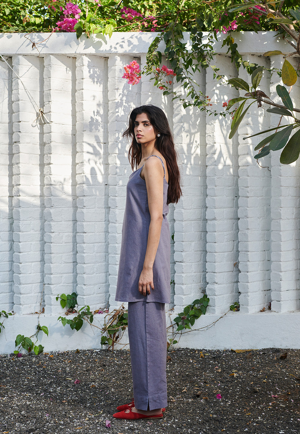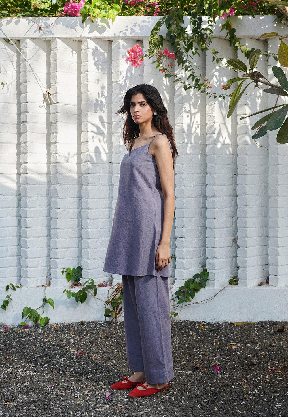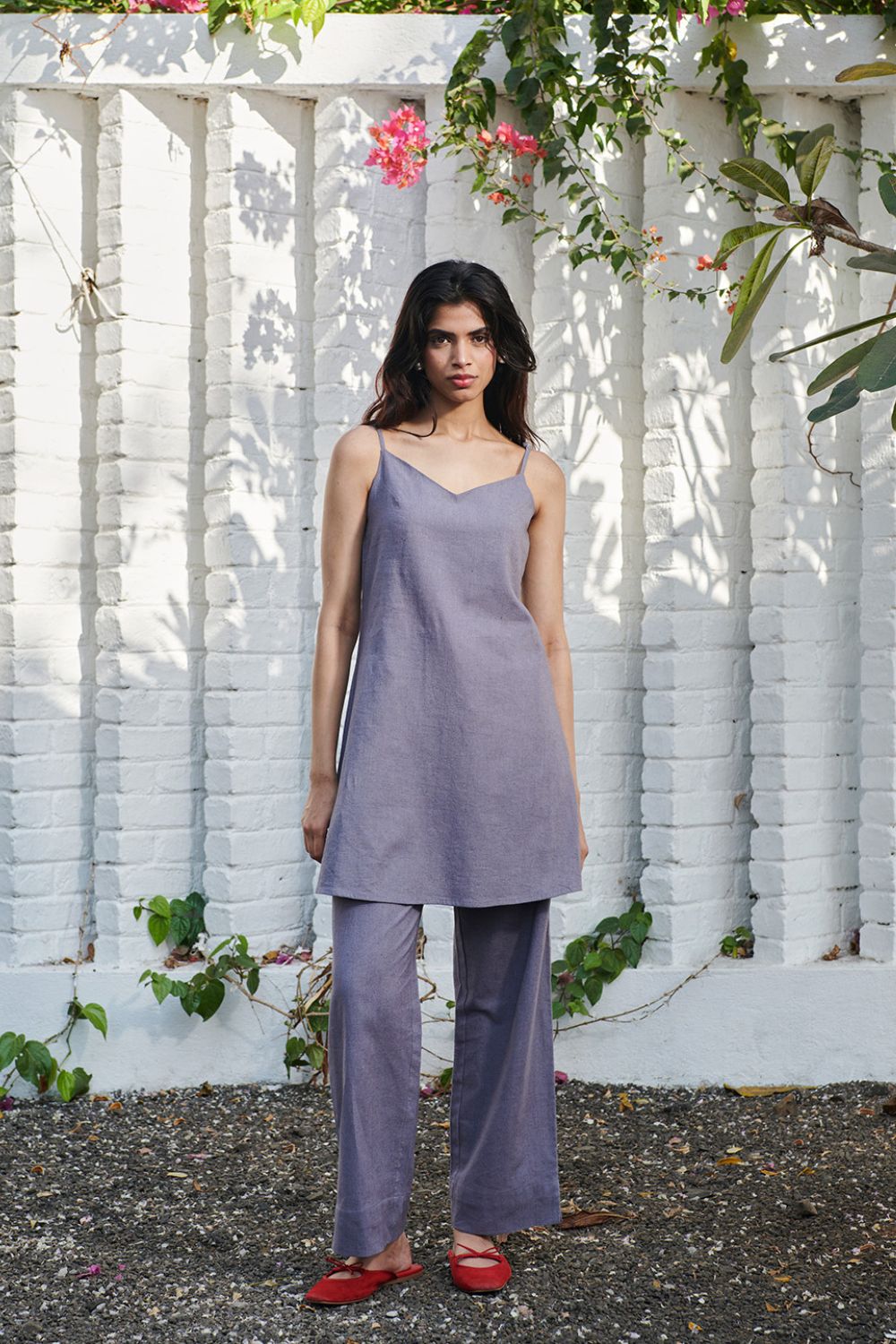 A minimal co-ord set featuring a sleek slip kurta with delicate straps and straight-leg pants for effortless elegance. Designed with a relaxed silhouette and subtle side slits, it blends comfort with understated sophistication.