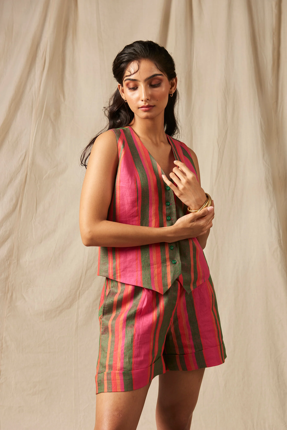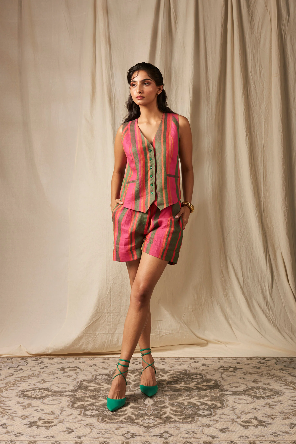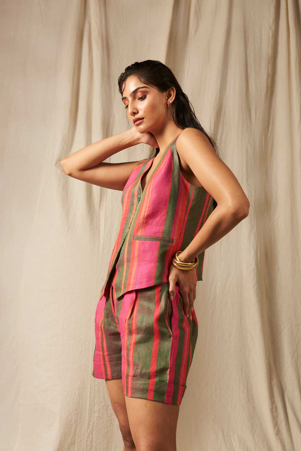 The timeless waistcoat gets a new rendition in pure linen this season. Self-lined with fabric button detailing, teamed to perfection with our high-waisted shorts. A piece so versatile you can re-wear it with a pair of denims or a skirt to create diverse silhouettes.