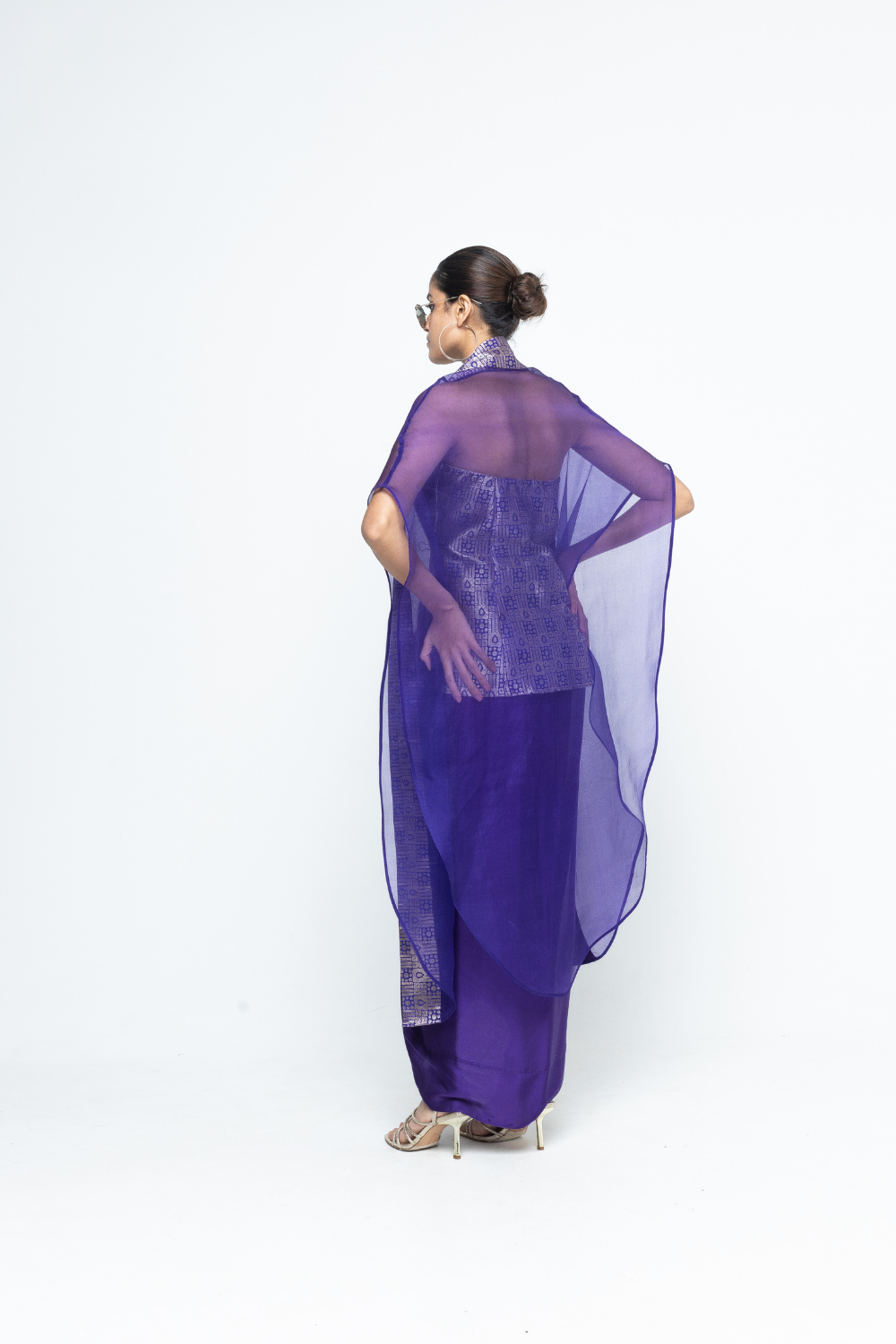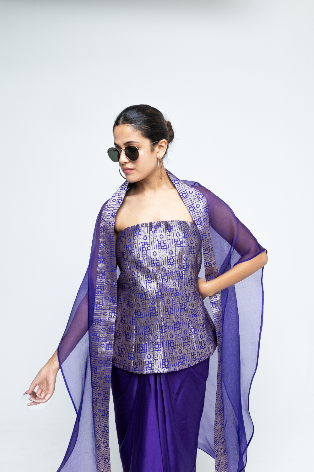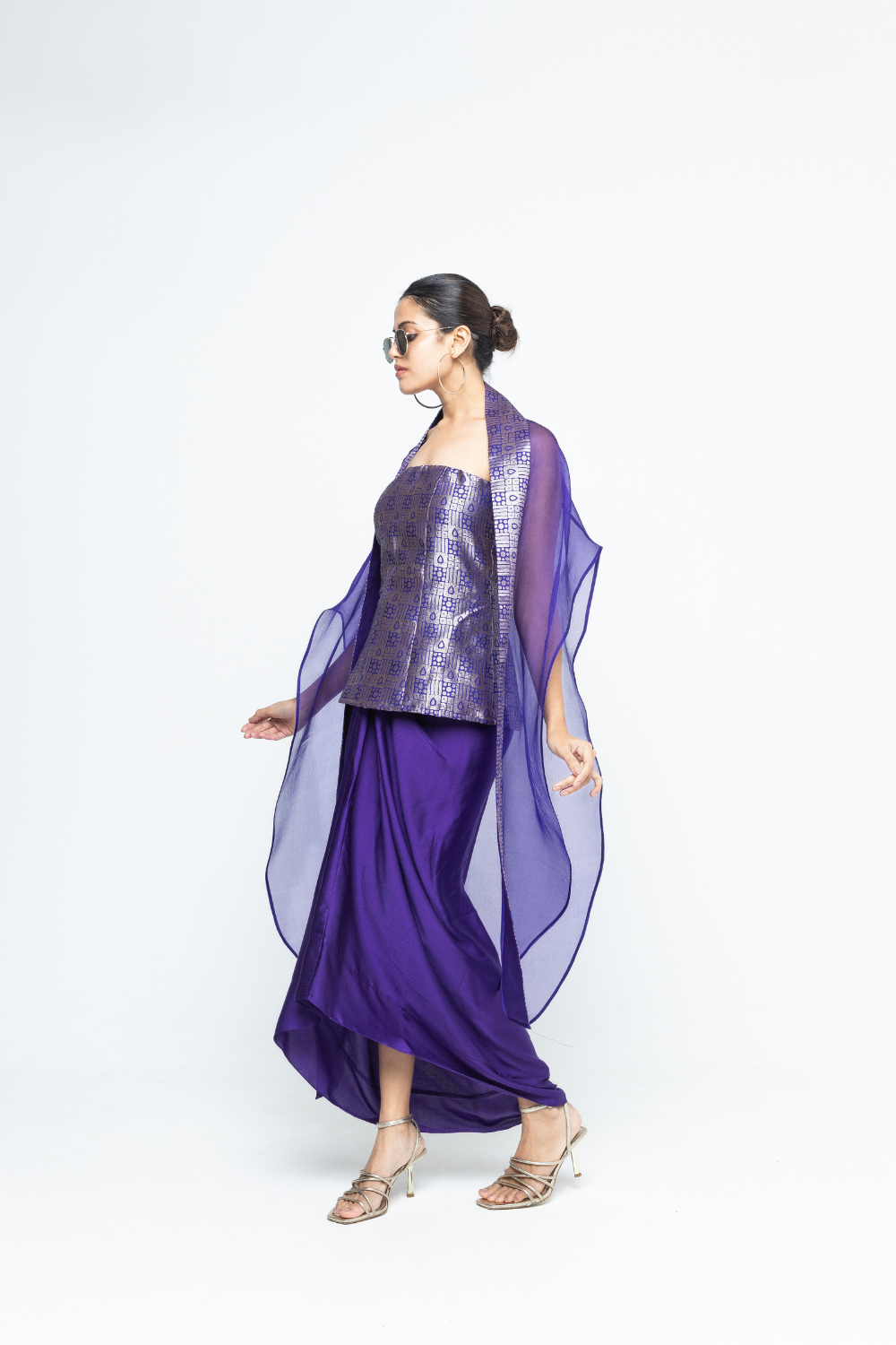 Statement Brocade strapless top paired with draped skirt and organza cape with brocade details.