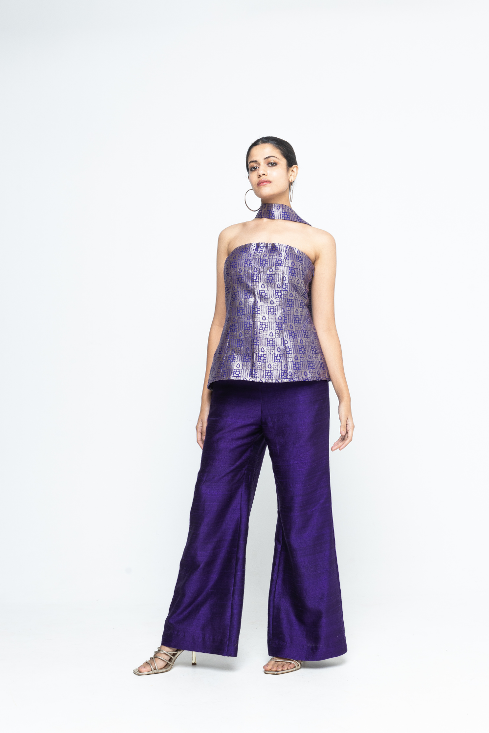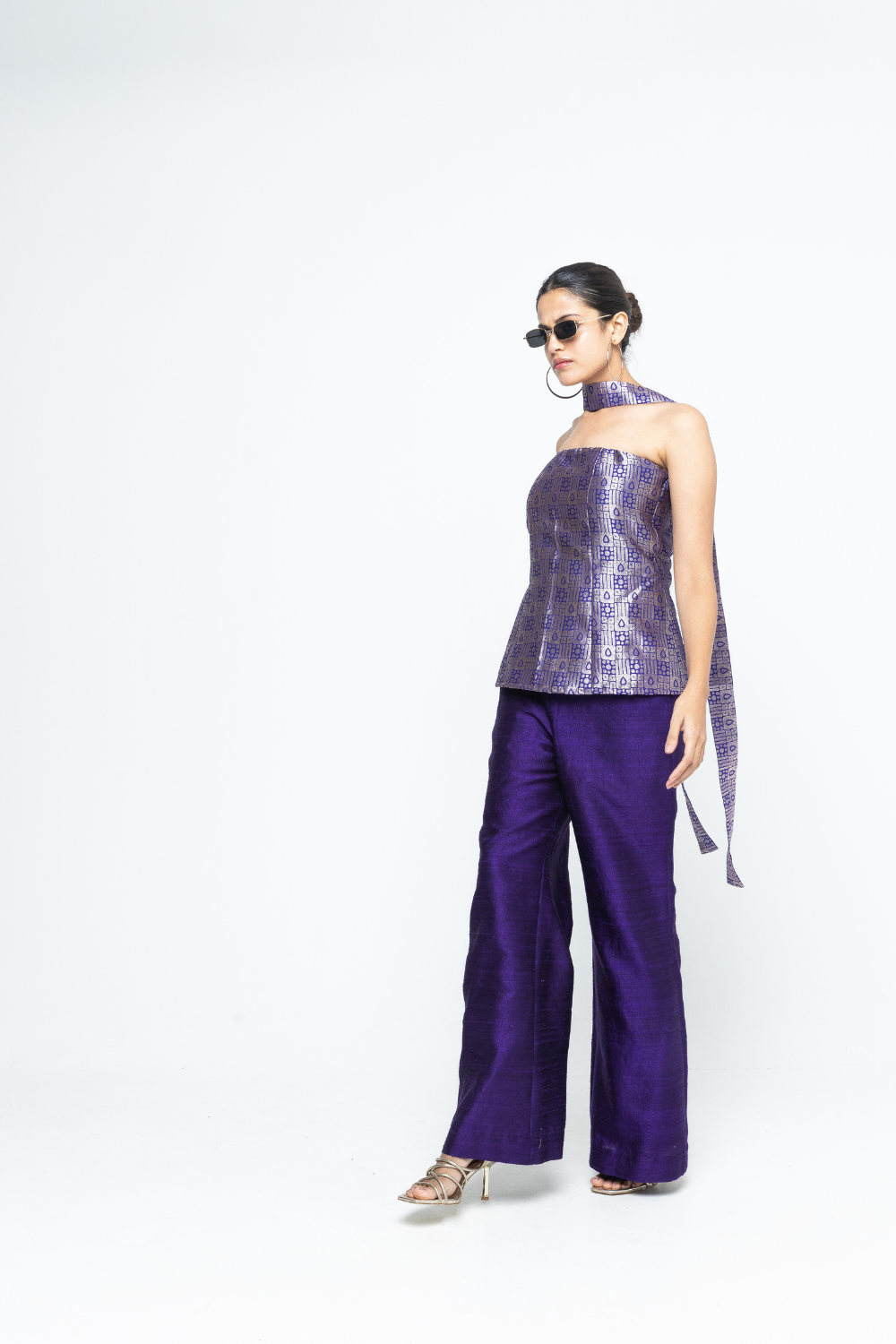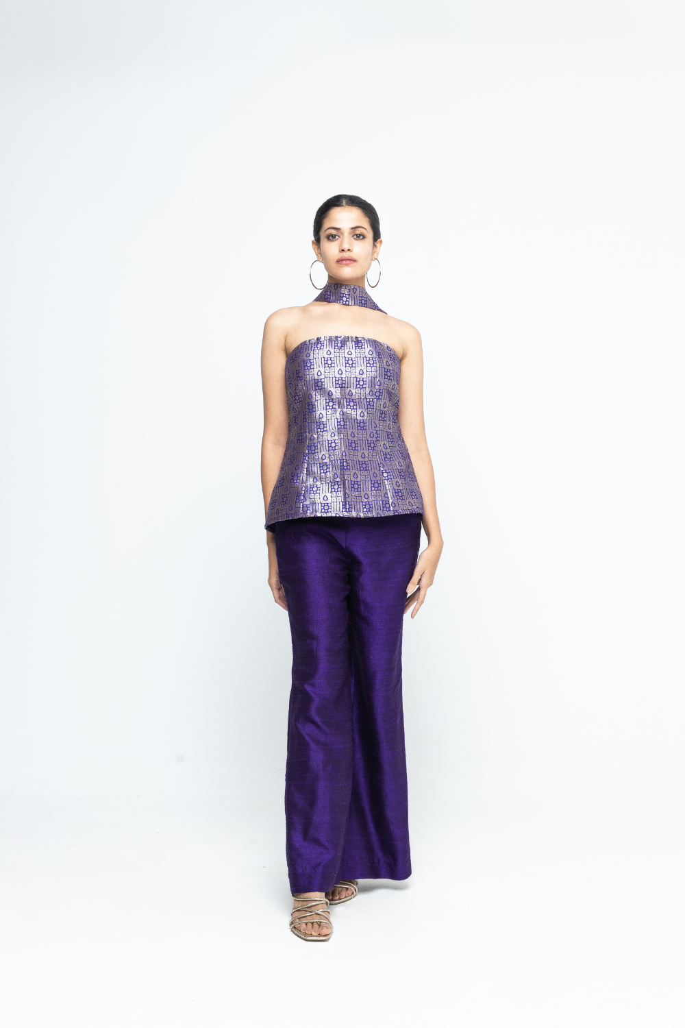 Statement Purple Brocade strapless top paired with raw silk pants to give a sleek look.