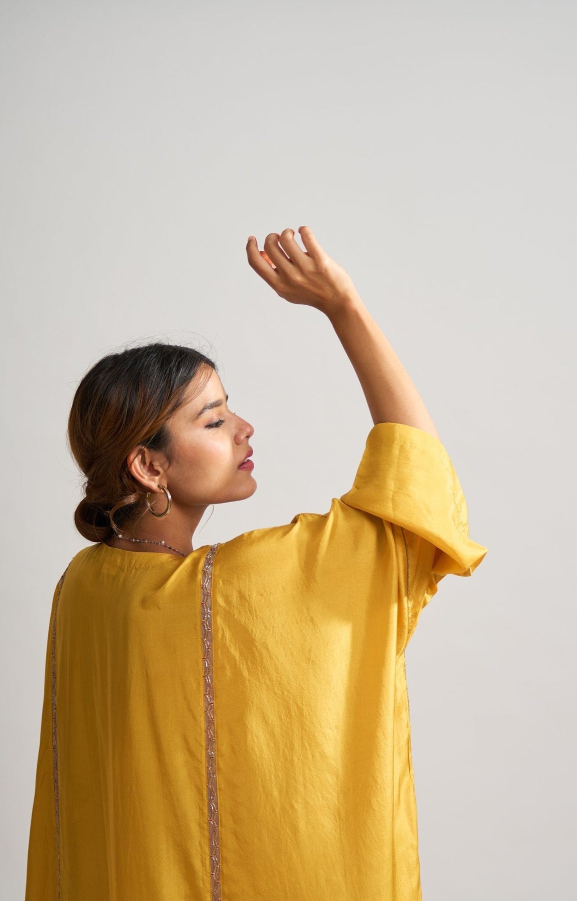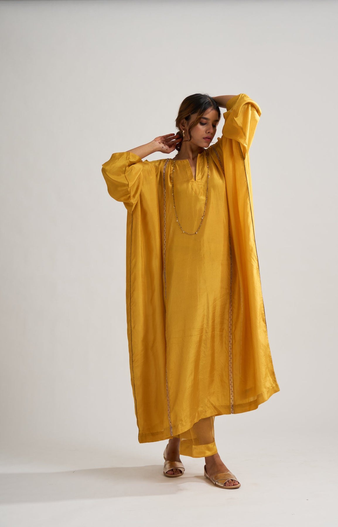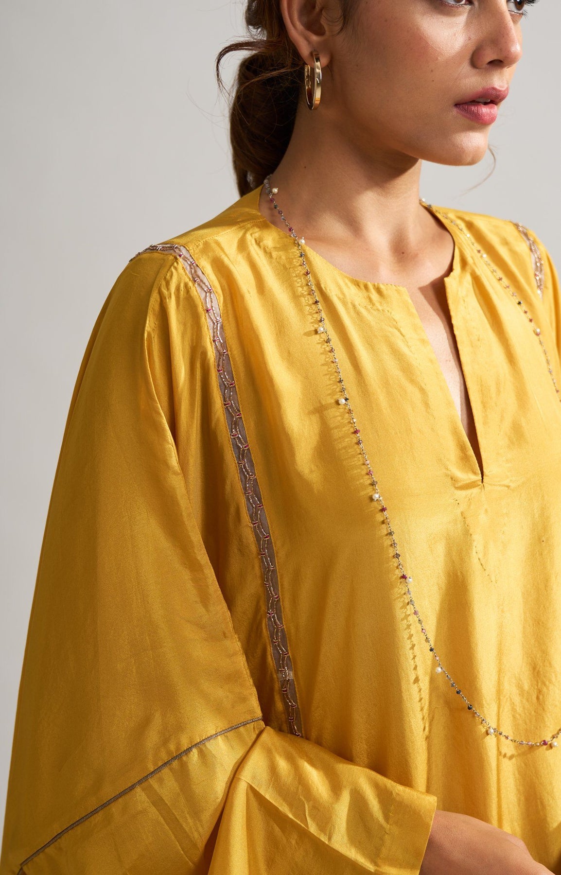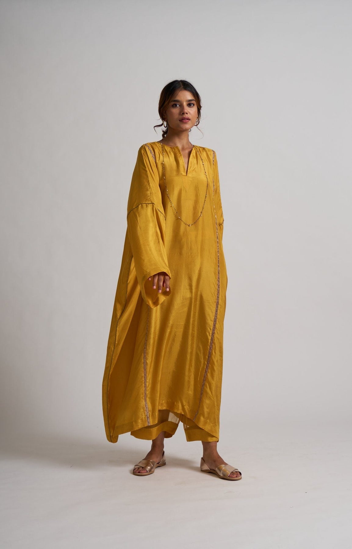 The kurta is made in Habutai silk- a fine weave which is renowned for its soft and lightweight material. Adding to this delicate mix, is the intricate Nakshi embroidery with resham threads. Paired with organza pants, this piece is luxury matched with everyday ease.