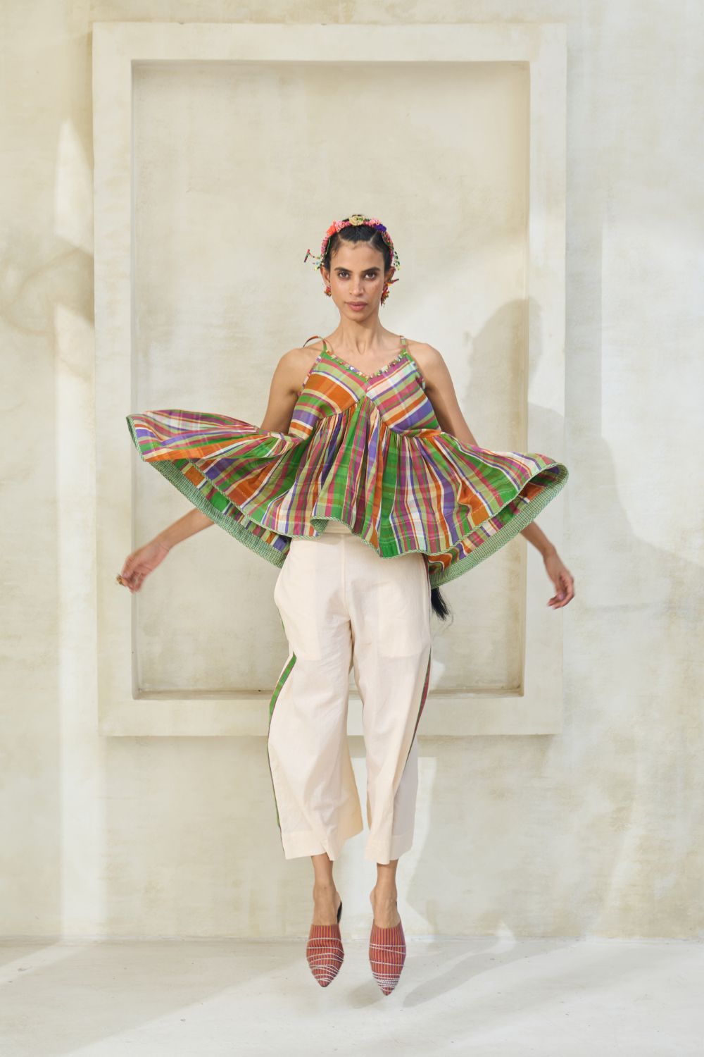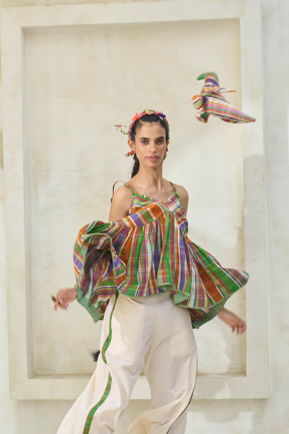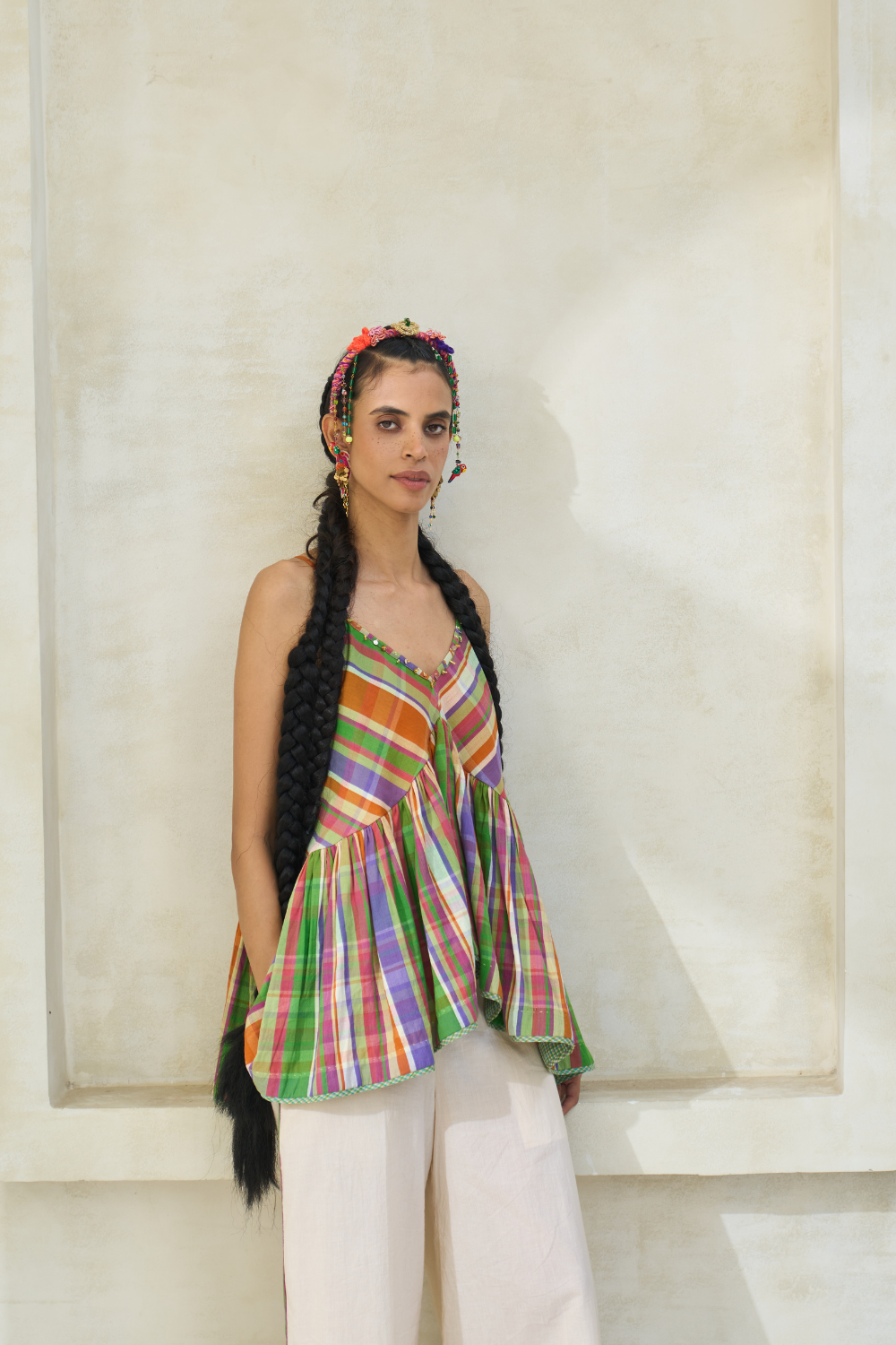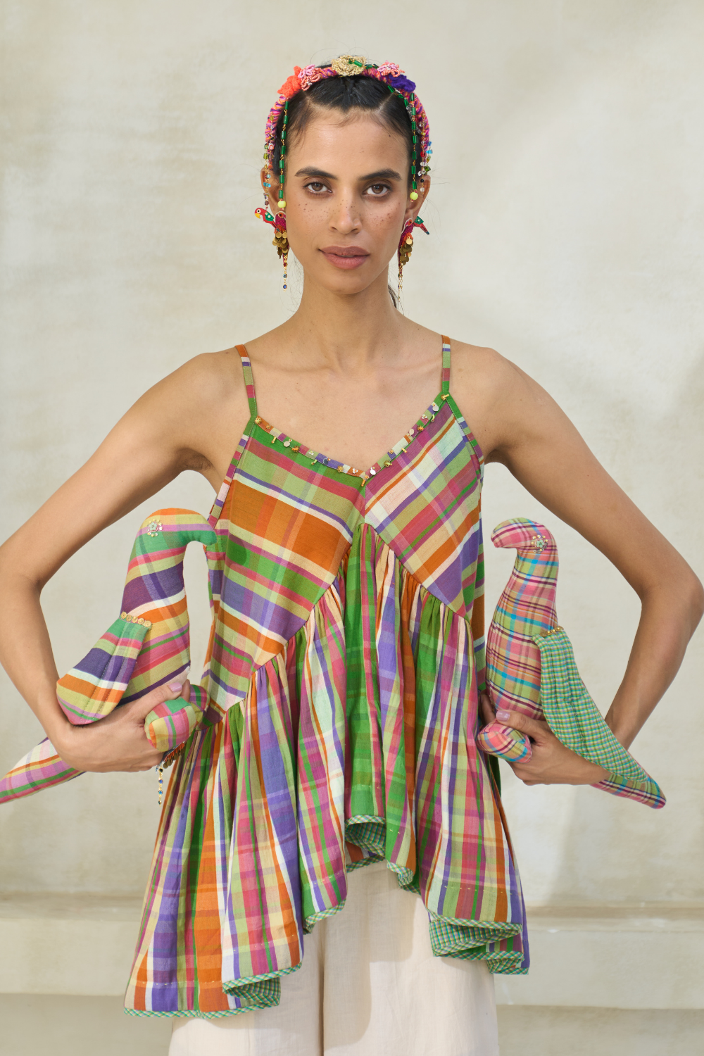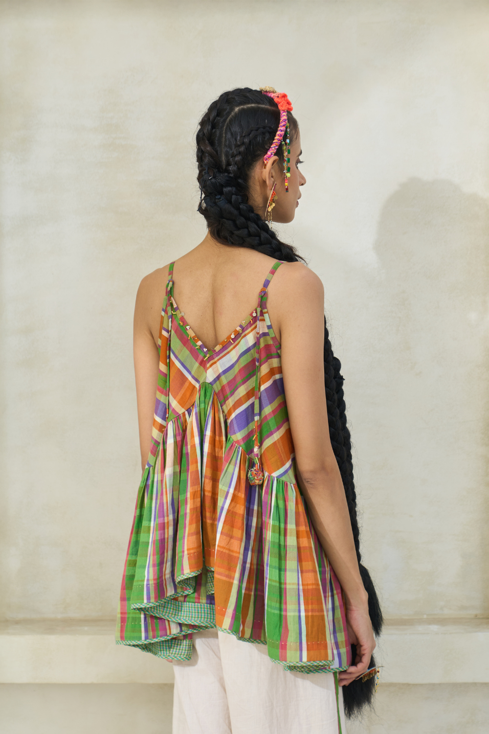 Frill V-neck top with spaghetti straps and tassel pom-pom details, crafted in handwoven, yarn-dyed Bengal 100% cotton irregular Playful Pop Multi check, with 100% cotton Spring Green very small check accents.