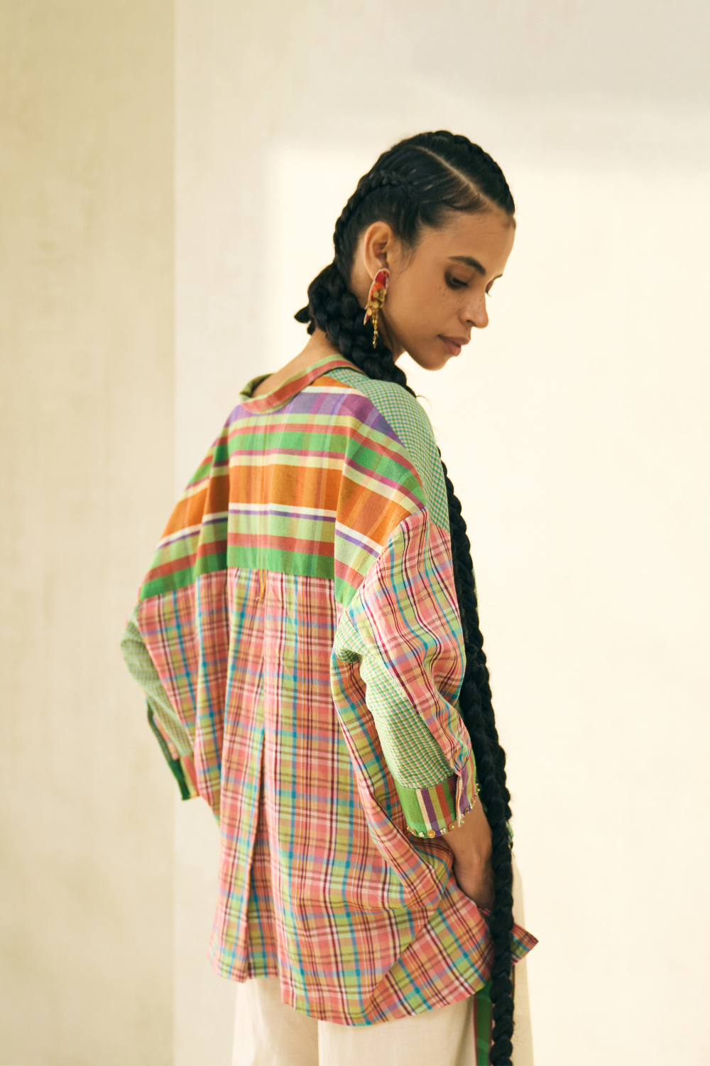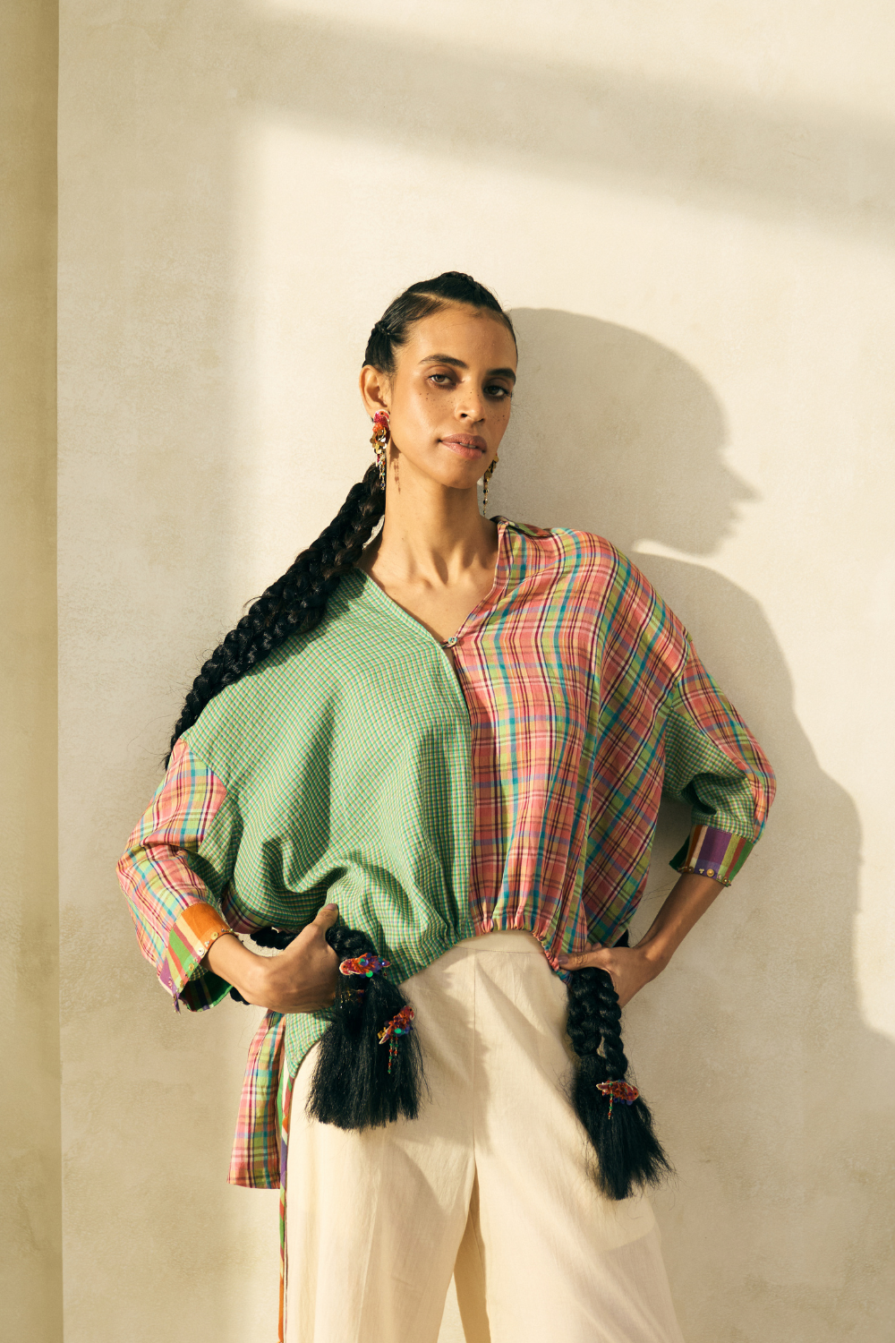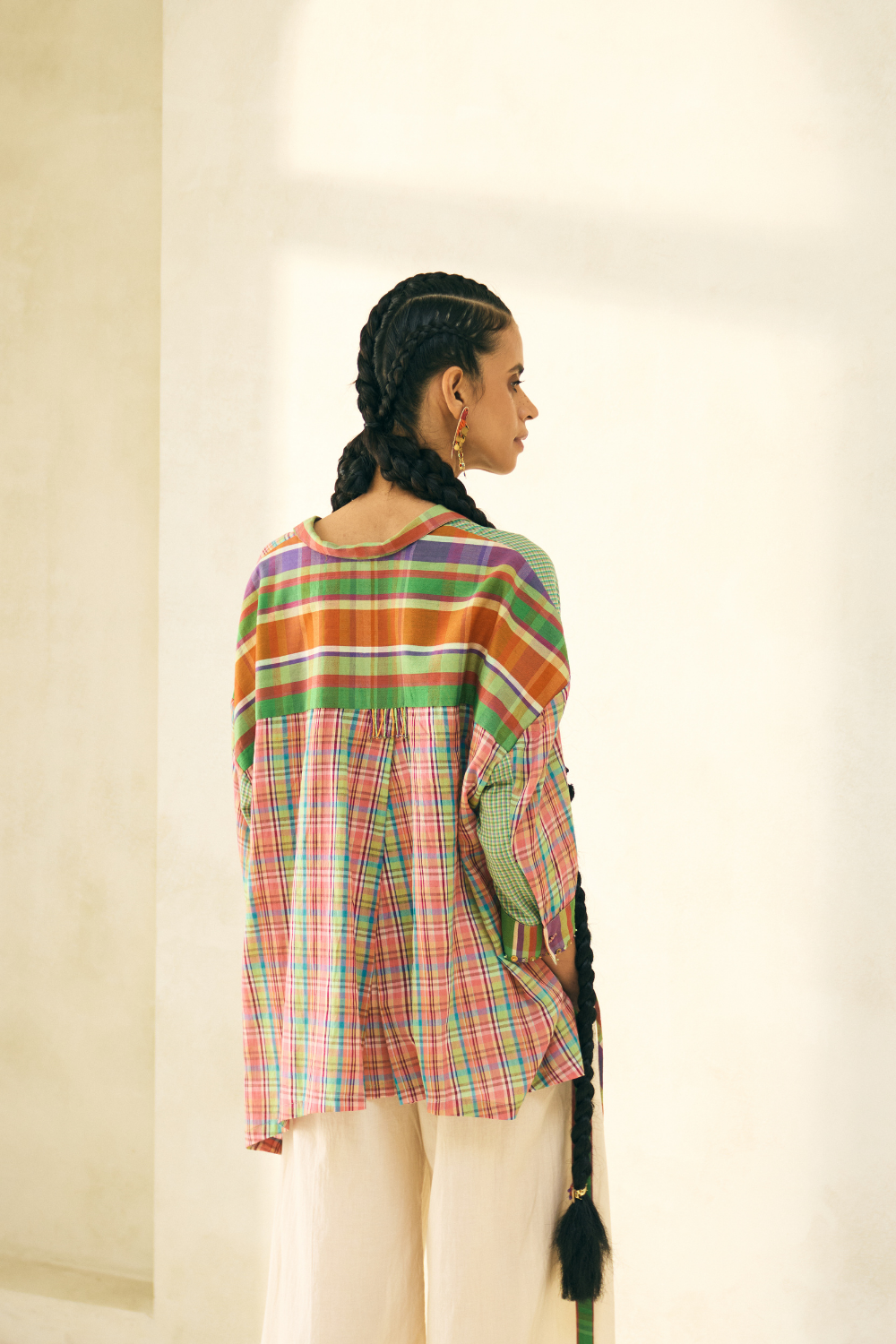 High Low shirt with drawstrings and hand done beaded details in 100% cotton bengal check in multi color