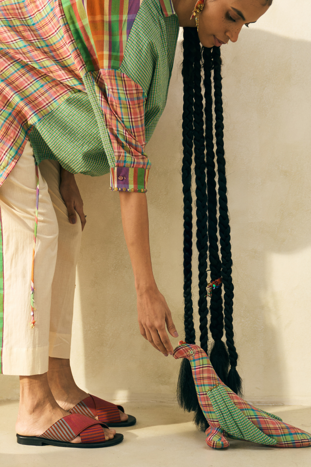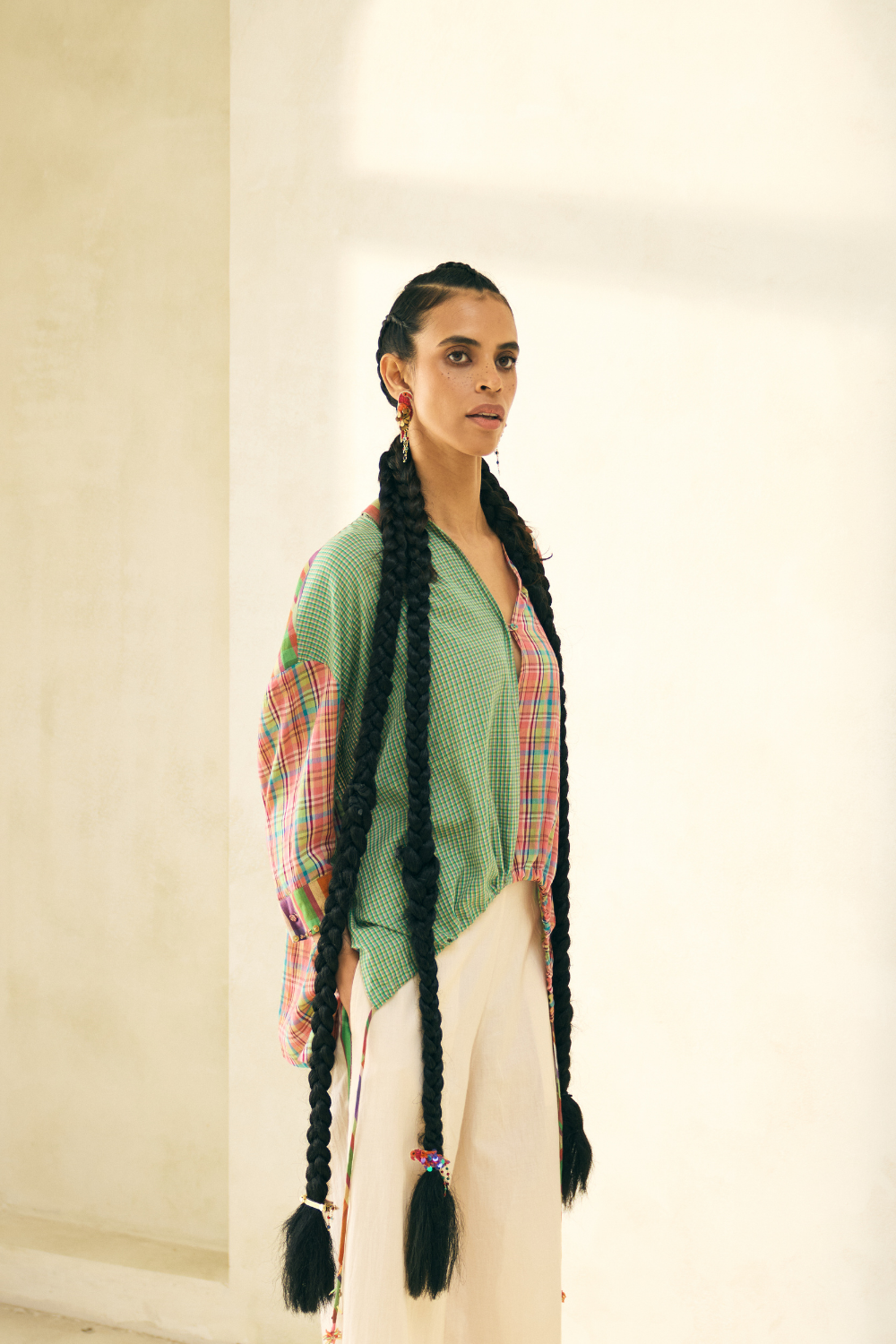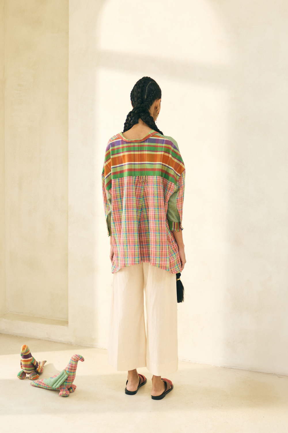 High Low shirt with drawstrings and hand done beaded details in 100% cotton bengal check in multi color