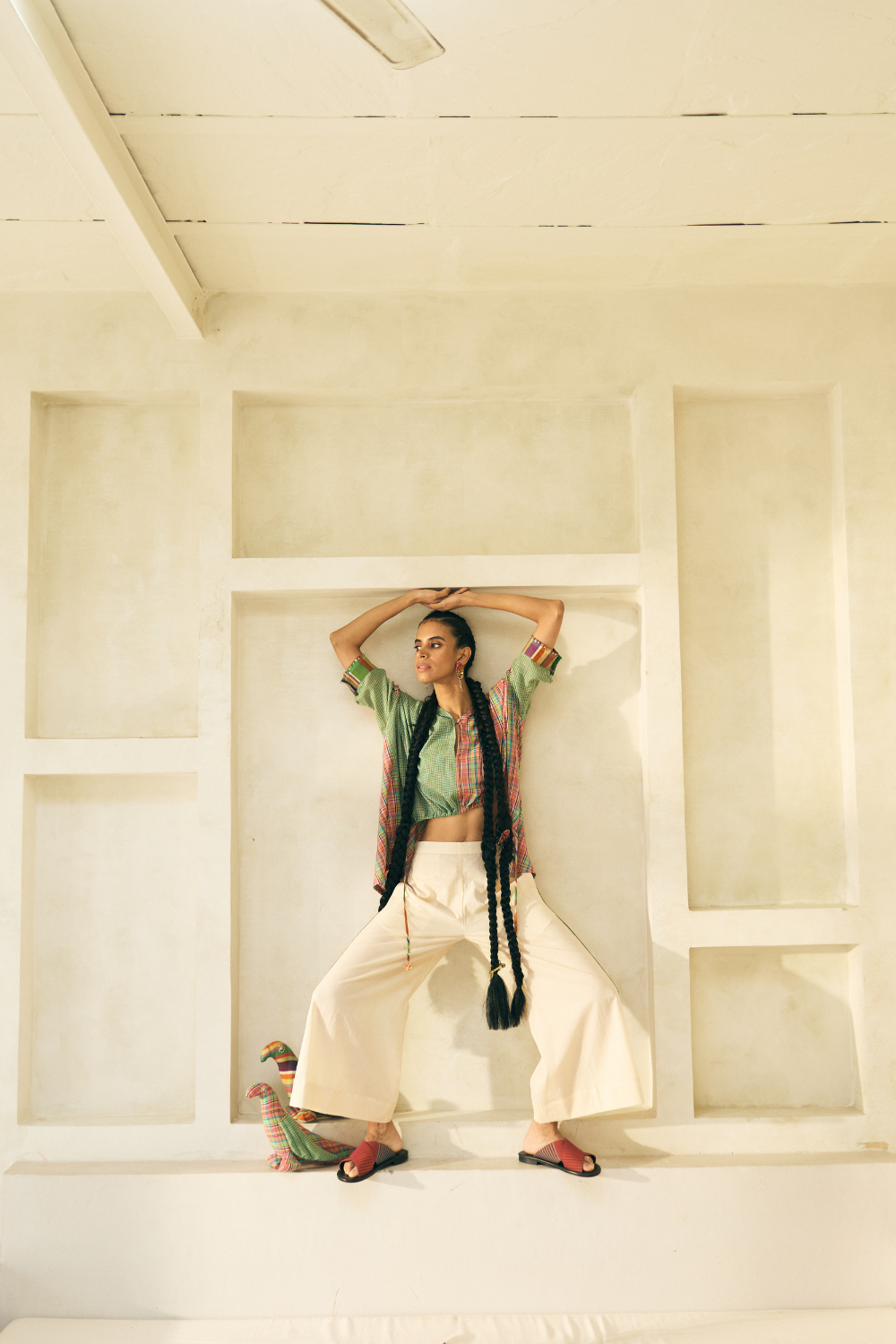 Her handwoven cotton becomes a meditation on breath and movement — airy, tactile, shaped into silhouettes that relax the body instead of commanding it.