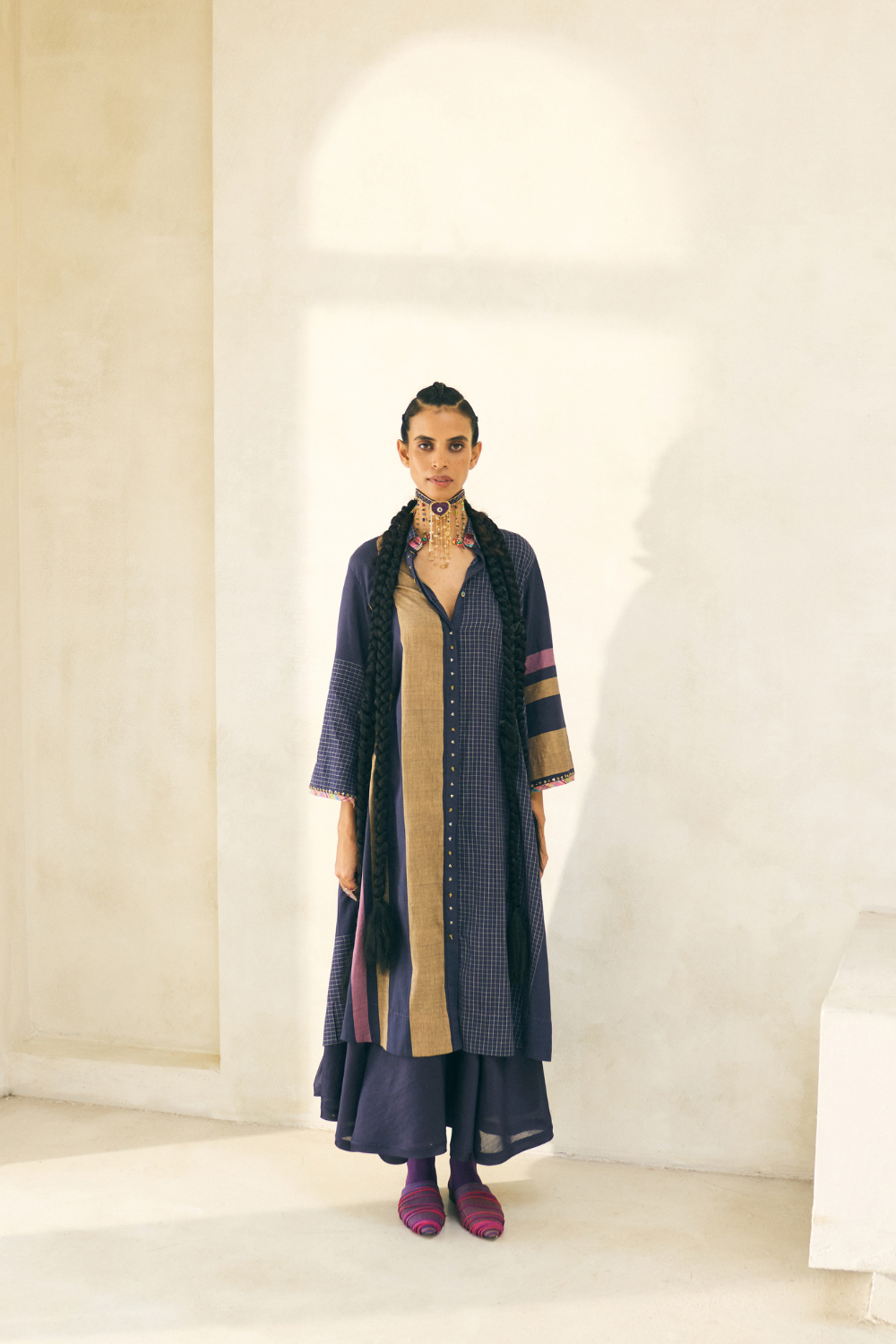 What sets Swatti Kapoor apart is the way she treats textiles as living beings — each with its own temperament, rhythm, and voice. Her garments don’t impose; they evolve. They drape the way water slips over stone. They hold the kind of ease that comes only from deep respect for material and maker.