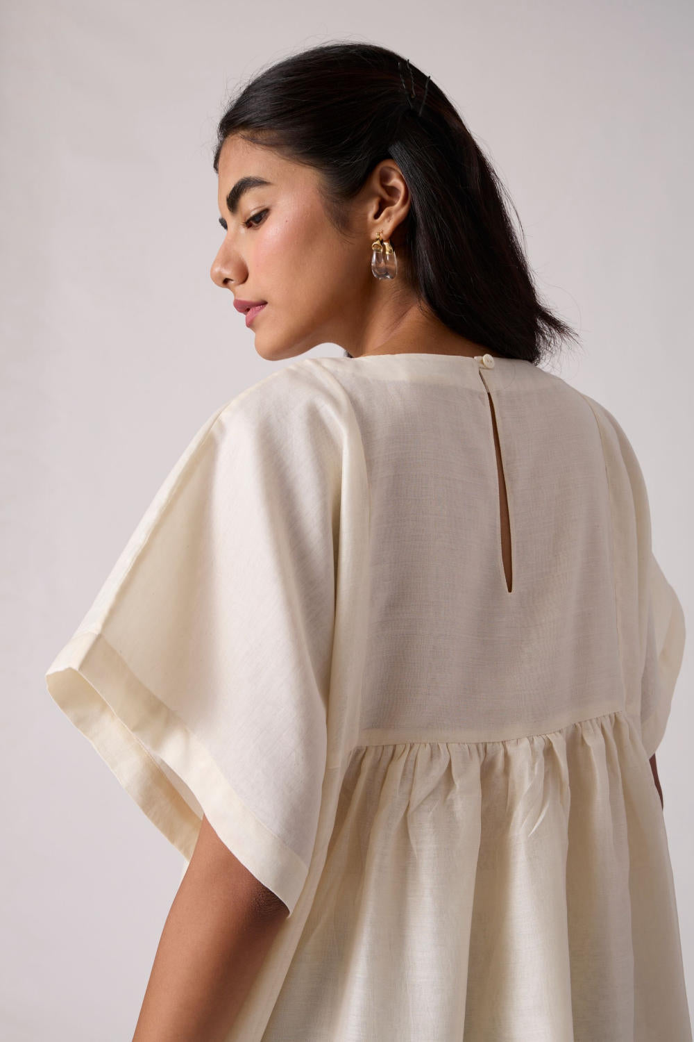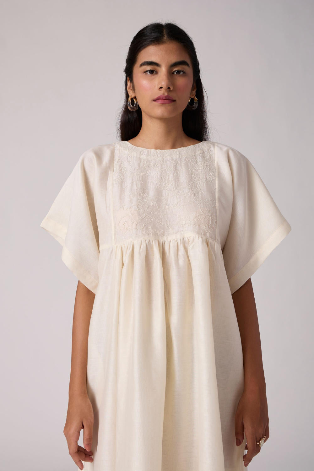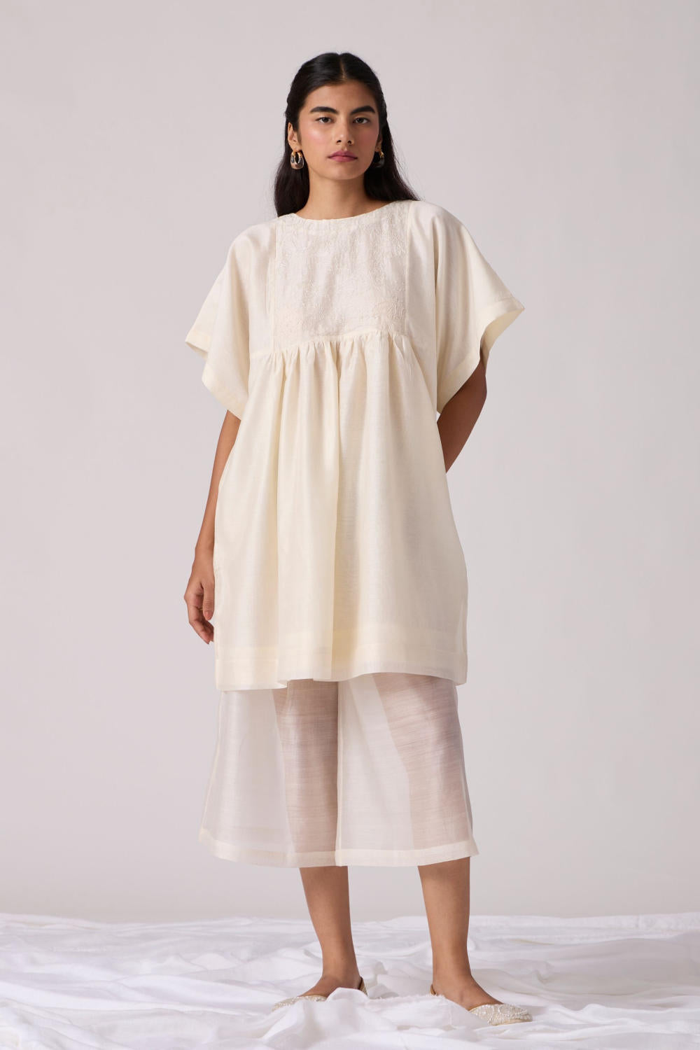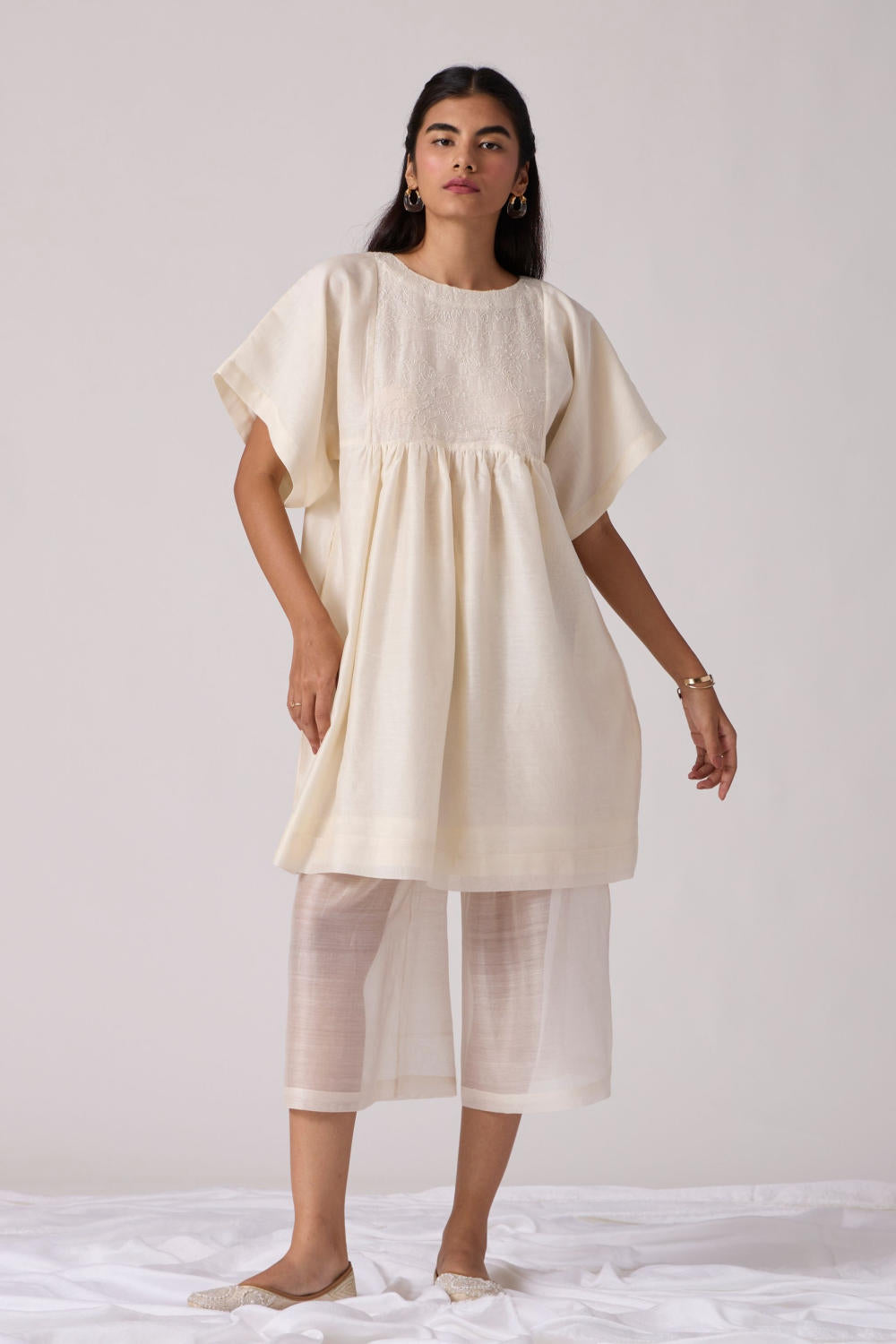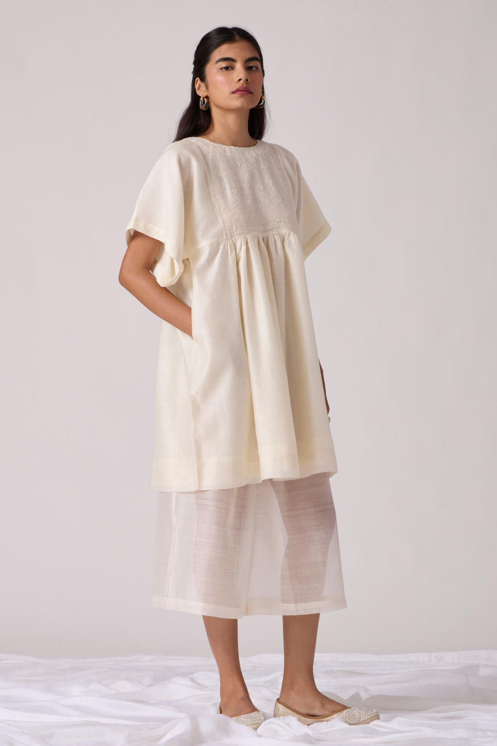 A charming knee-length dress meticulously crafted from handwoven chanderi fabric. This elegant piece showcases delicate embroidery on the yoke, subtle gathering along the yoke seam, and a sophisticated back loop button fastening. To enhance comfort and style, the dress is fully lined, making it perfect for any special occasion.Completing the ensemble are cropped handwoven chanderi pants, featuring an elasticated waistband for the perfect blend of sophistication and ease. Note : Slight irregularities in embroidery and subtle embroidery markings are inherent and speak to the hand processes involved.
