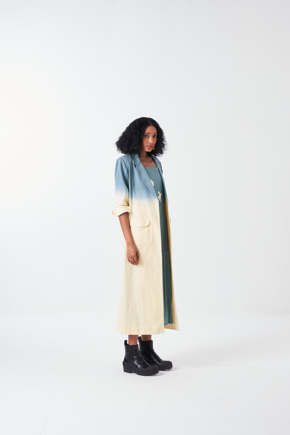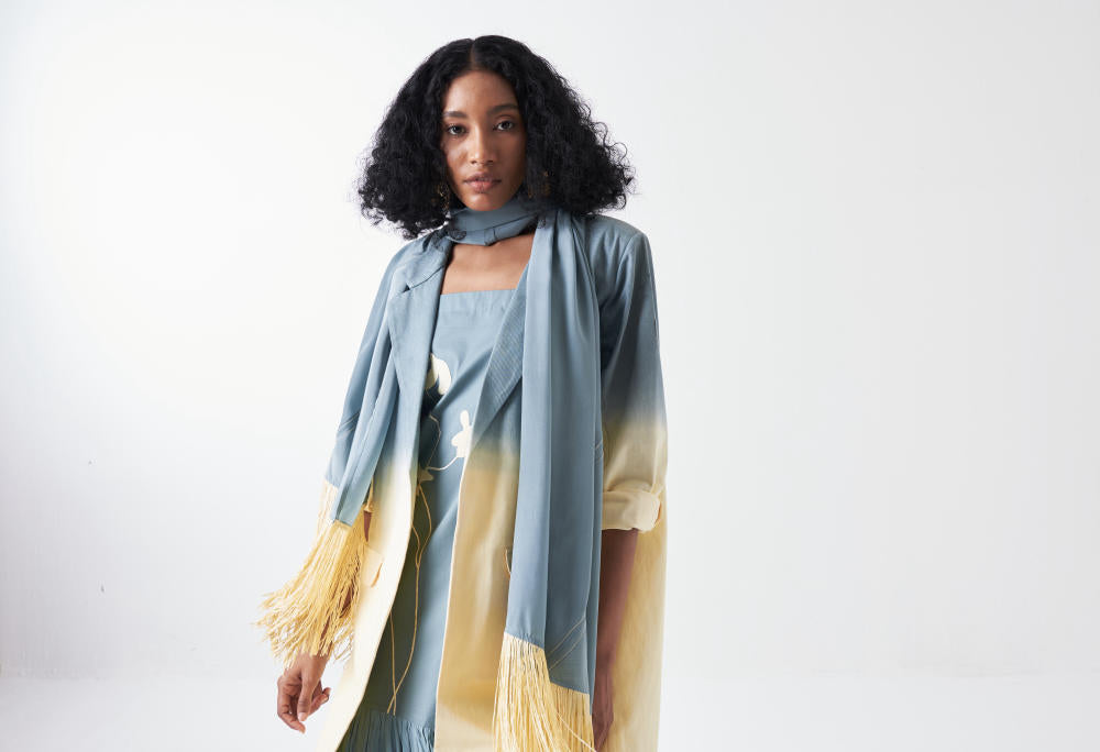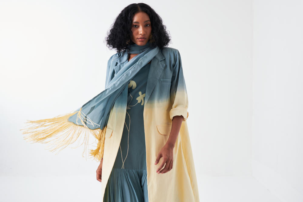 Product Type: Co-ord Set (DIP DYE JACKET + POPPY APPLIQUE BOTTOM FRILL DRESS + SCARF)