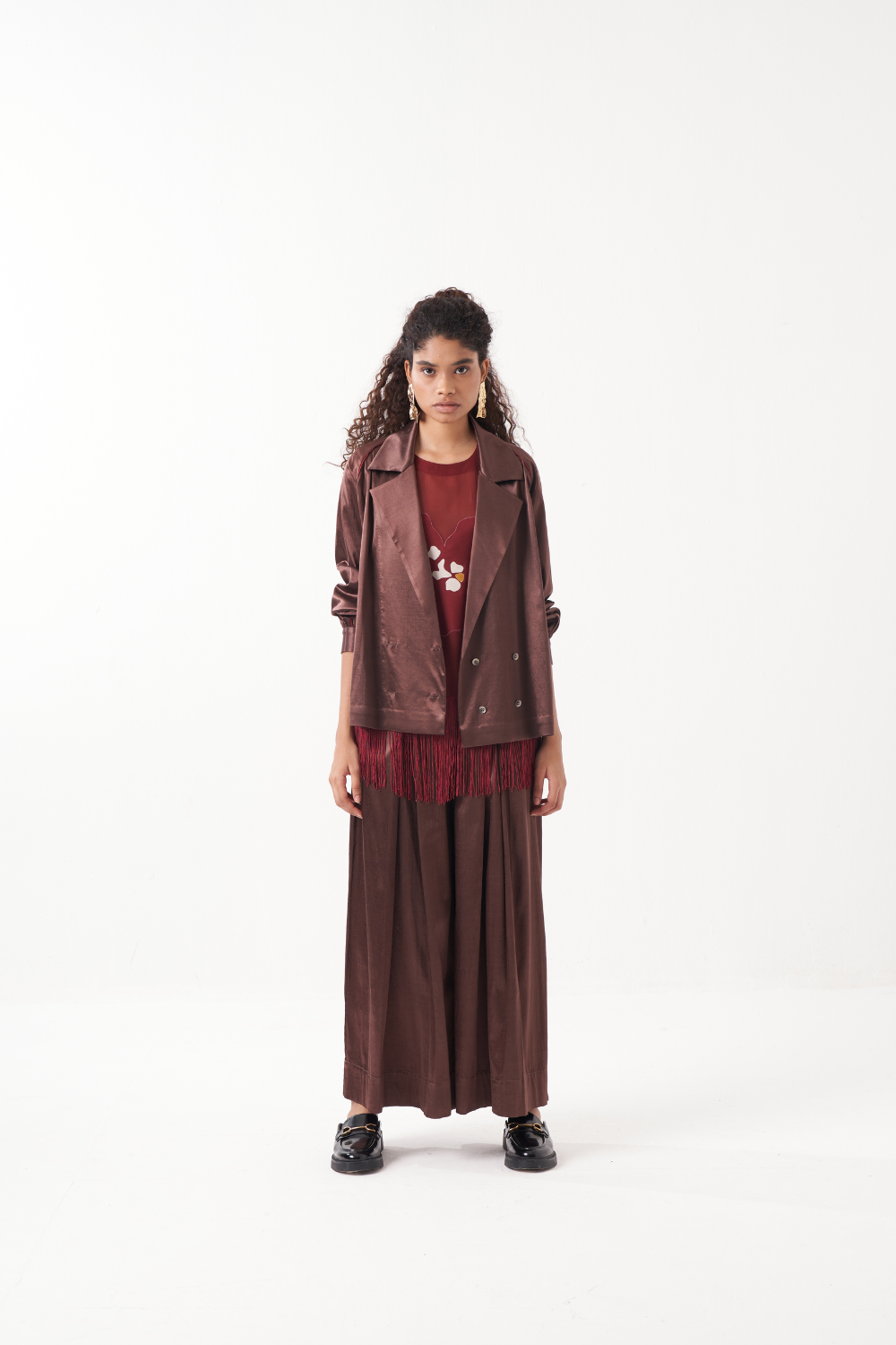 Product Type: GATHERED SLEEVE JACKET + FRINGE TOP + INVERTED BOX PLEAT BOTTOM