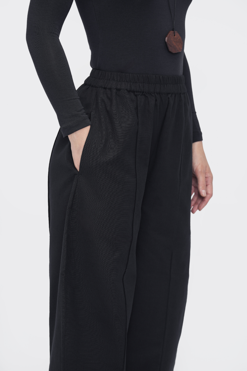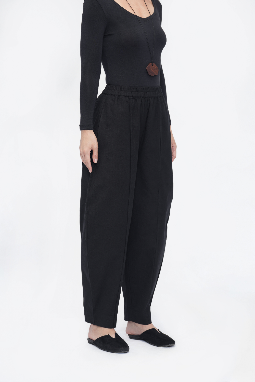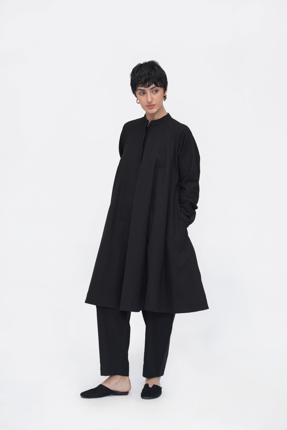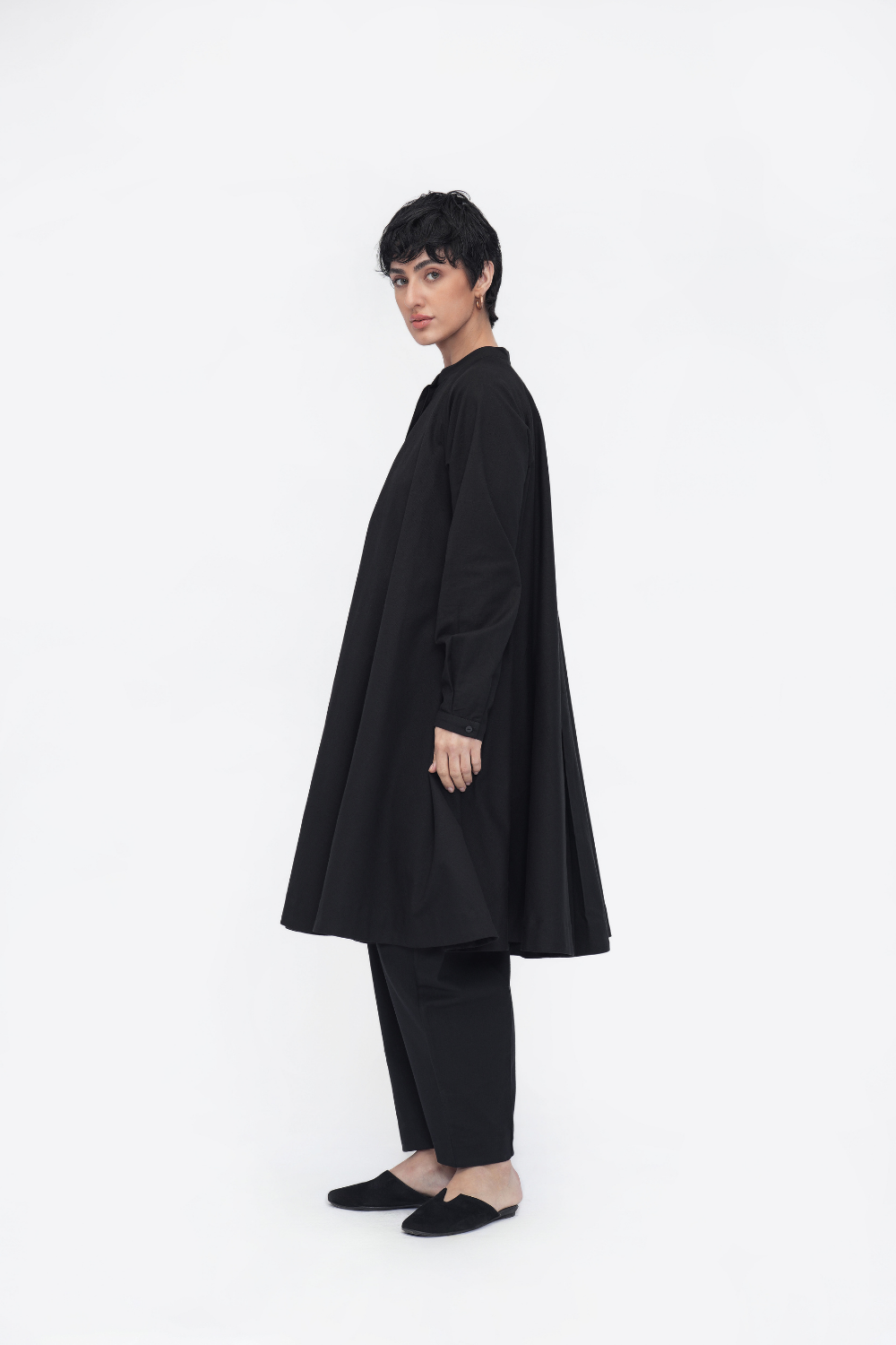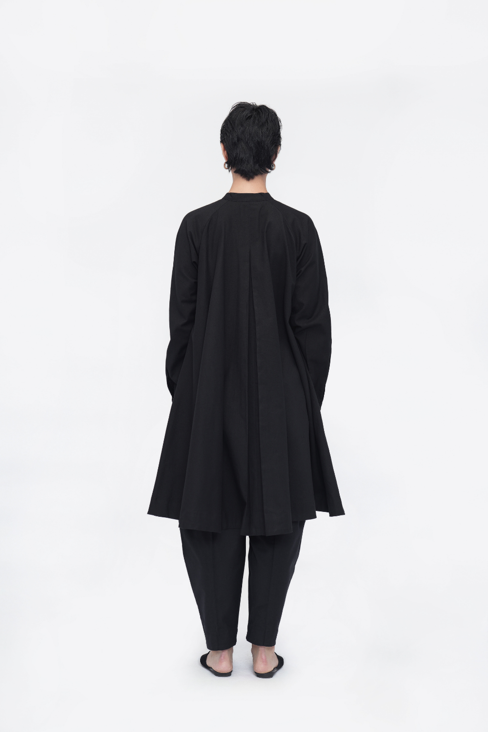 A knee-length women’s tunic in breathable Cotton Flex with a soft tent silhouette, round neck, raglan sleeves, and a concealed placket—elevated by subtle box pleats and practical side pockets. Paired with relaxed barrel-fit pants featuring an elasticated waistband, pintuck detailing, and side seam pockets. A quietly confident set for everyday ease. Top Comes in Size: ONE (2XS,XS,S), TWO (M,L,XL), THREE (2XL,3XL,4XL)
