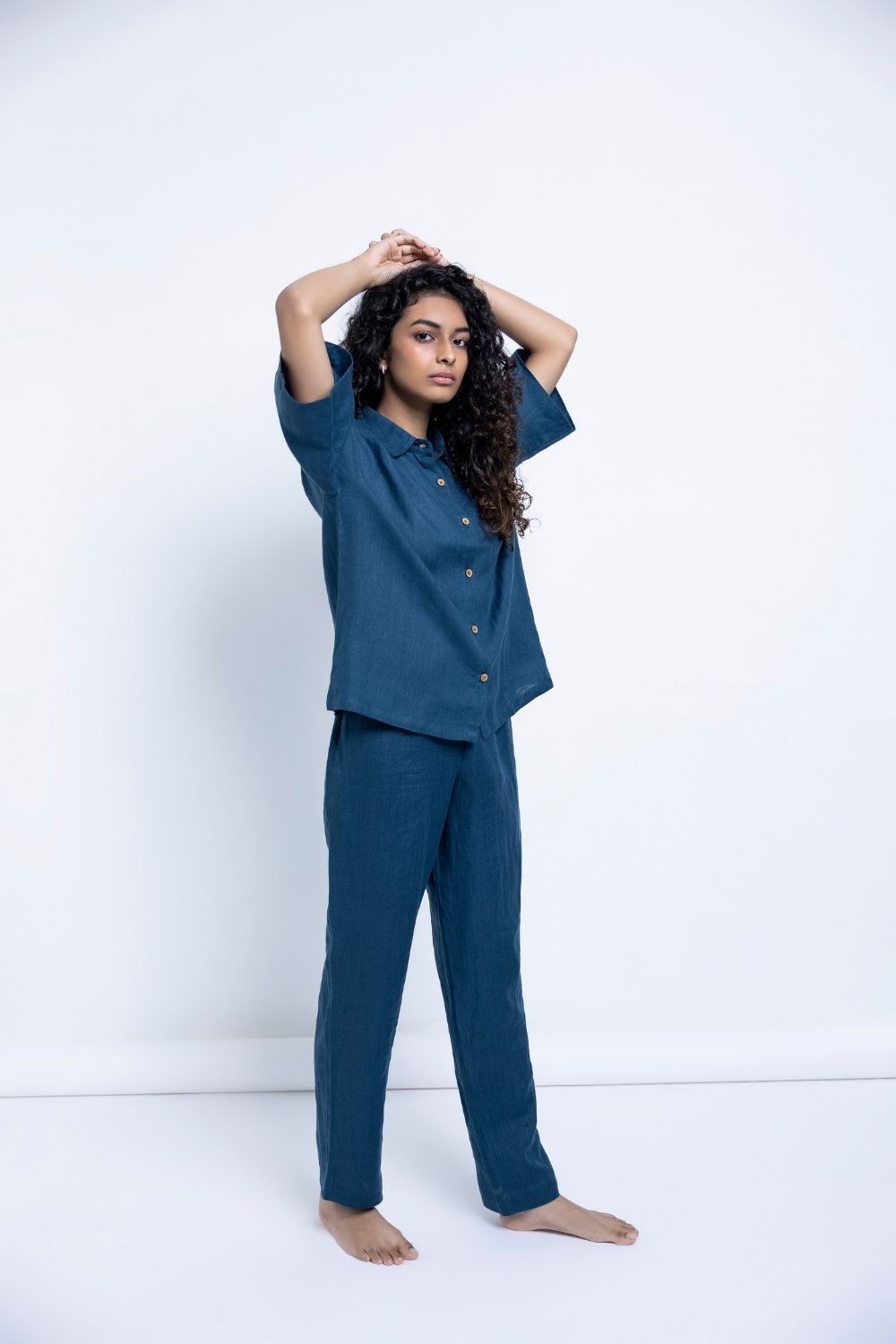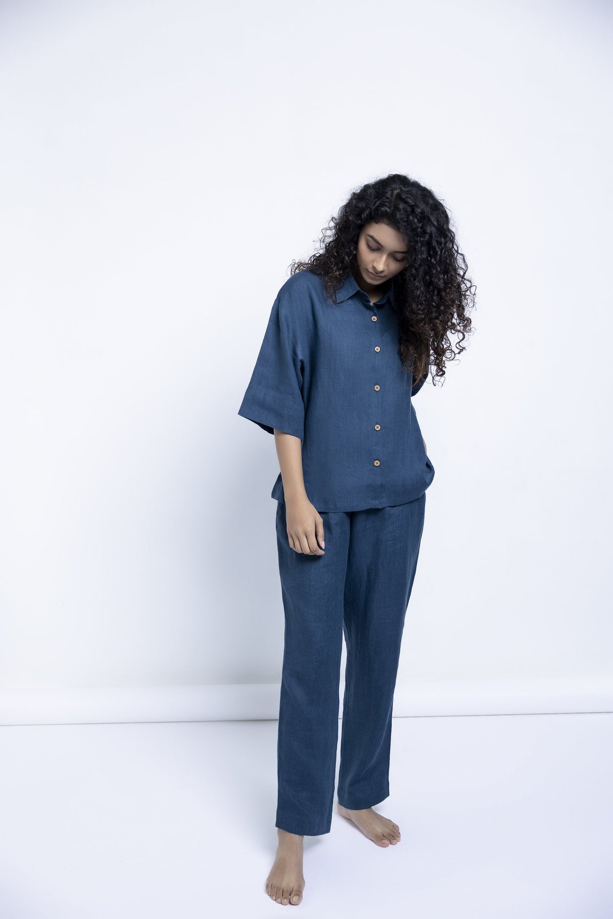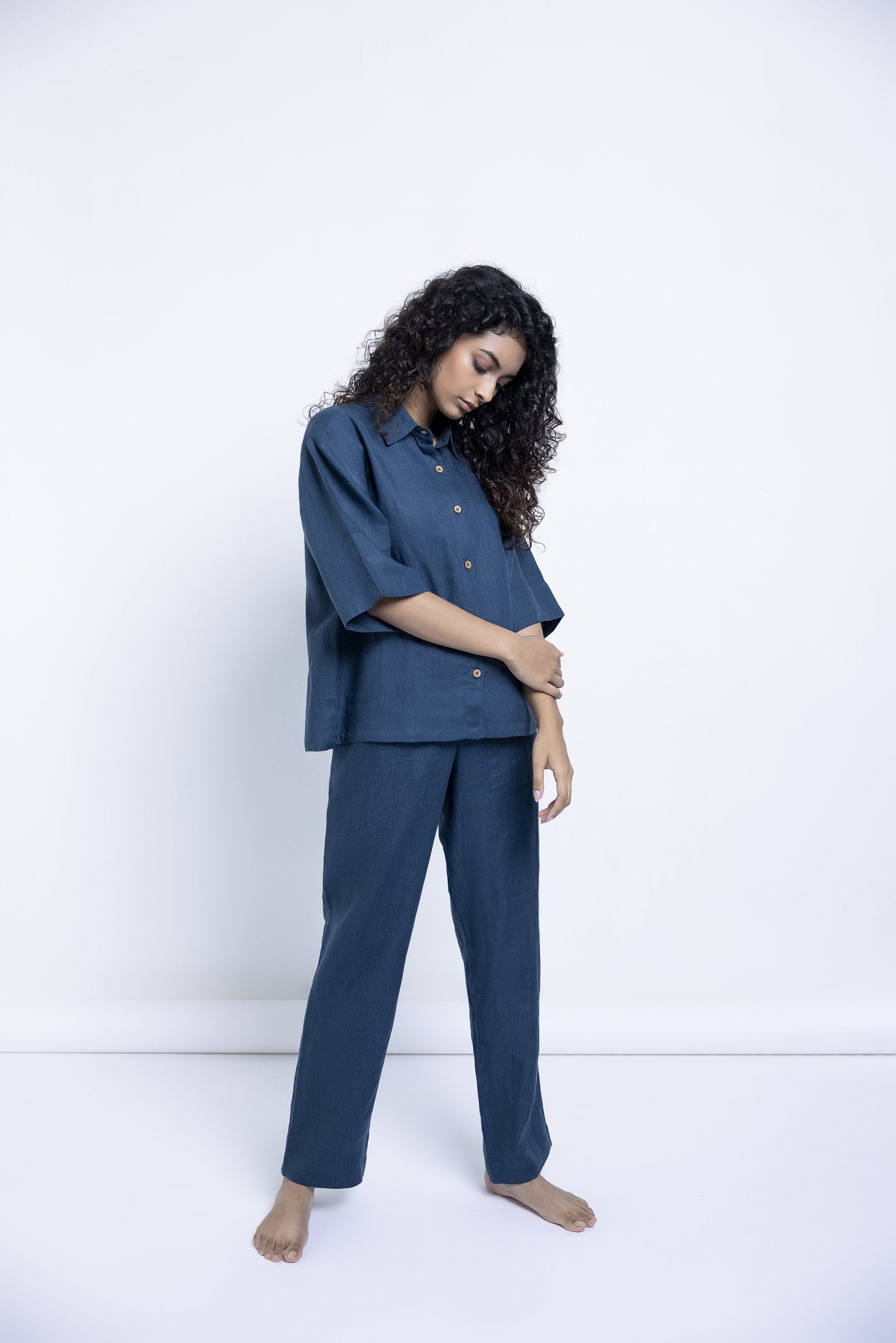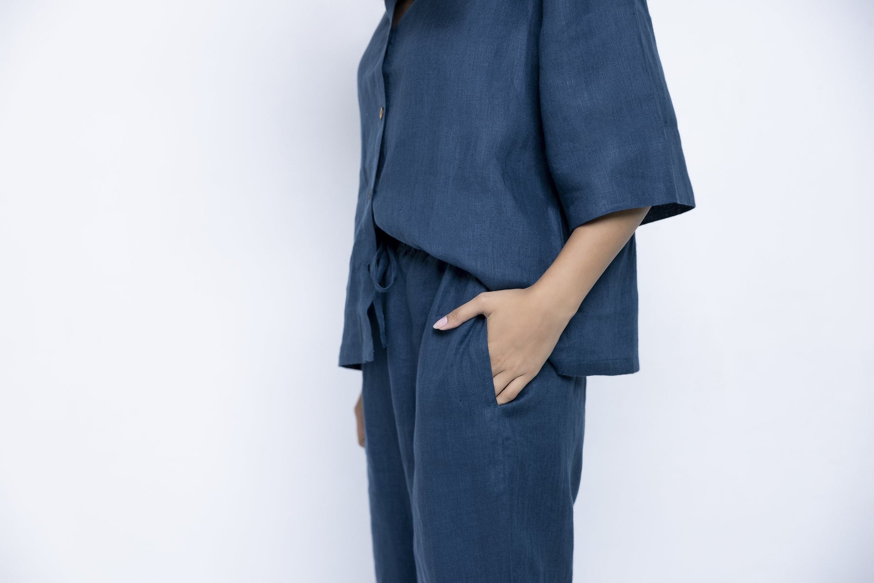 This pure linen shirt and pyjama set is so comfortable, it will sing you to sleep. Wear at night, but also while lounging through the day, G&T in hand, or while working from home. This versatile, easy-to-maintain set is created in shades of Indigo, Khaki, , and Undyed with details that appear slowly like little surprises - wooden buttons, drawstrings, pockets, best wishes.
