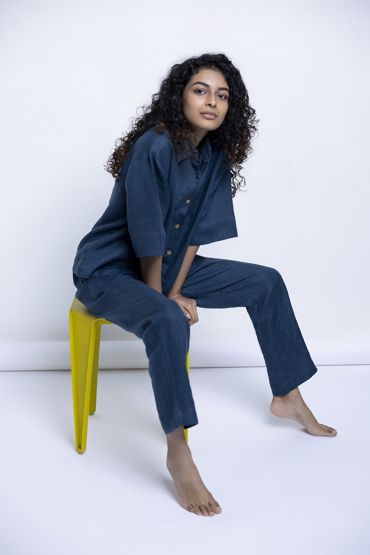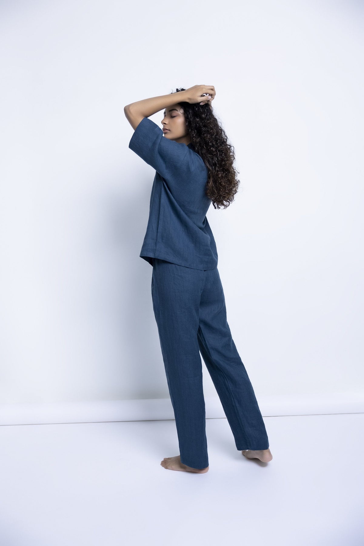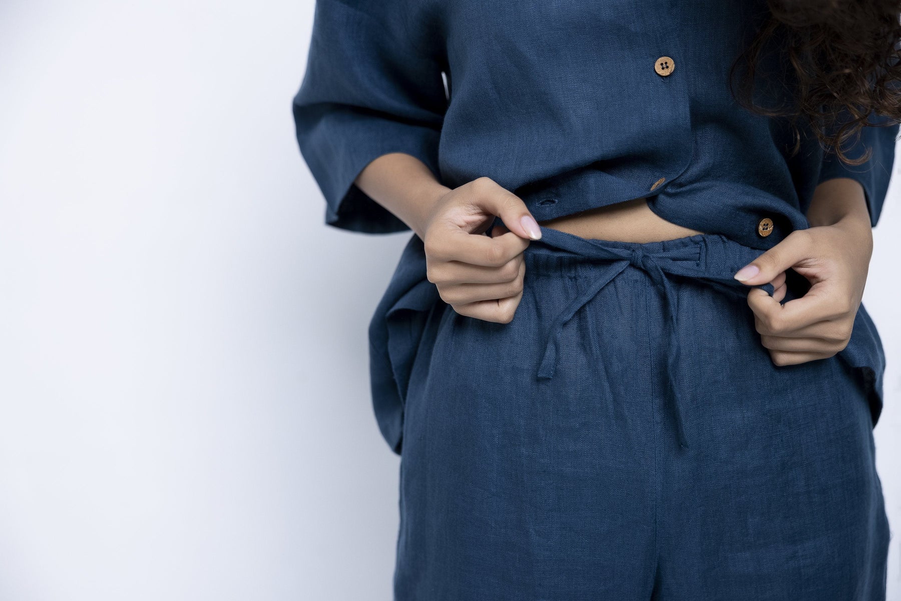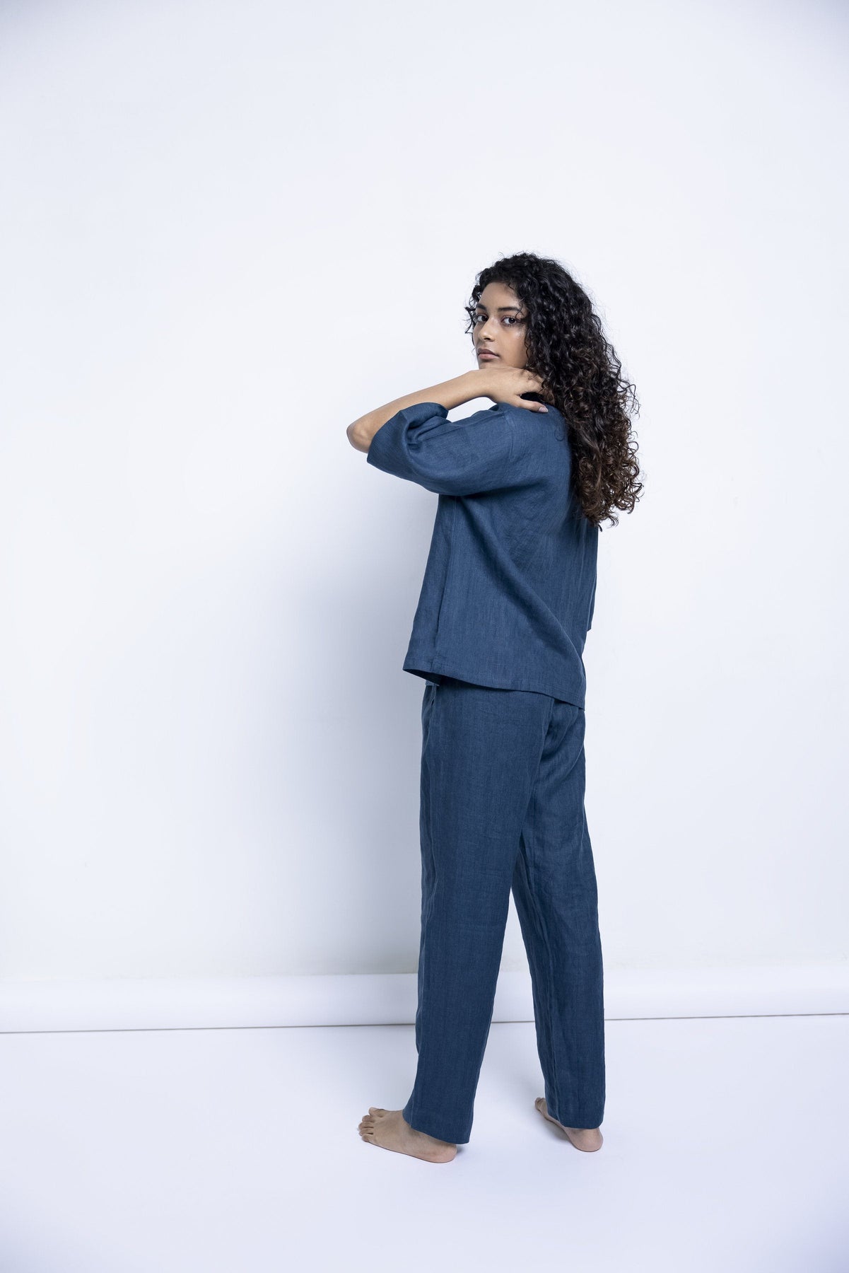 This pure linen shirt and pyjama set is so comfortable, it will sing you to sleep. Wear at night, but also while lounging through the day, G&T in hand, or while working from home. This versatile, easy-to-maintain set is created in shades of Indigo, Khaki, , and Undyed with details that appear slowly like little surprises - wooden buttons, drawstrings, pockets, best wishes.
