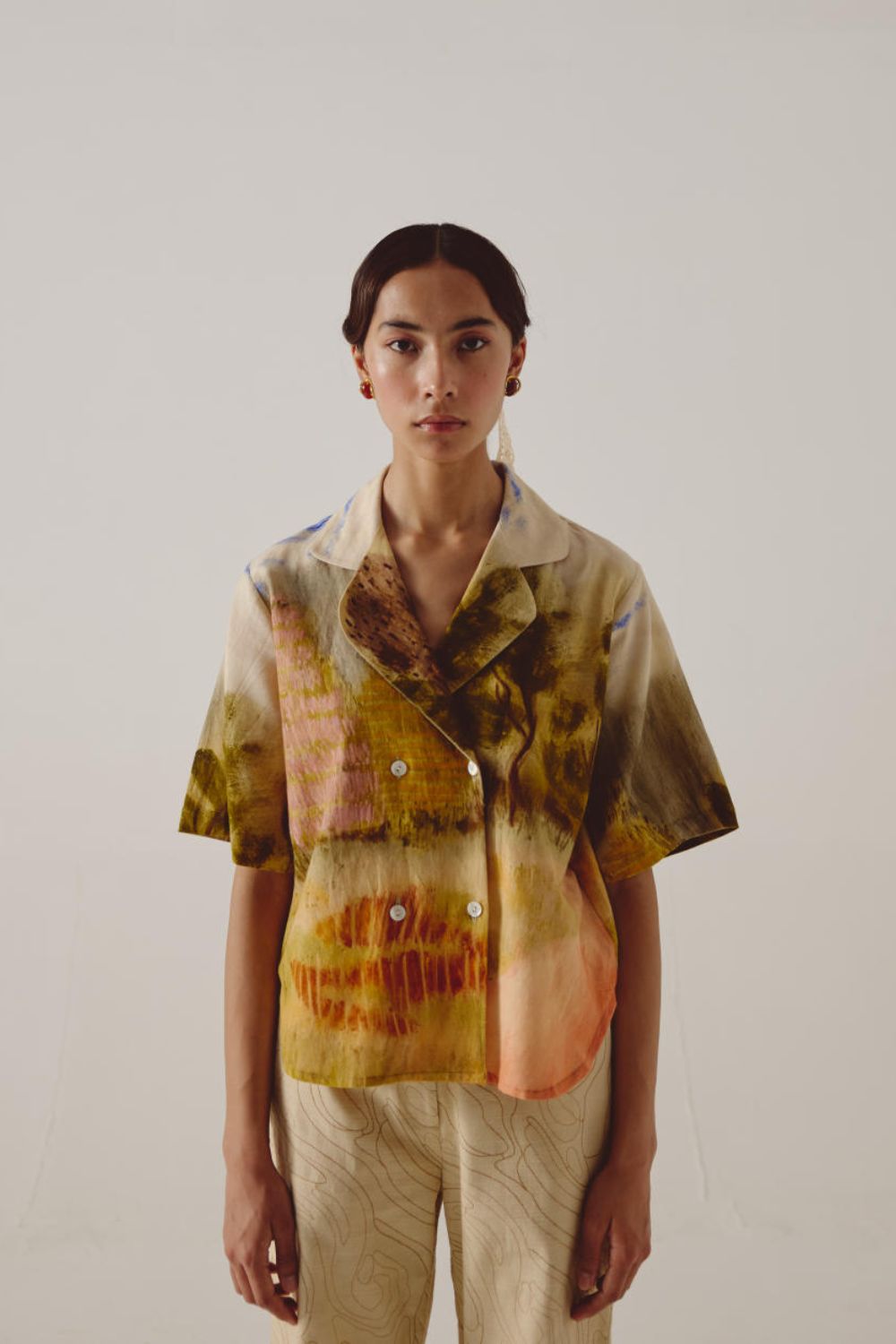 A classic style, promising comfort inspired by the retro era is the 60s shirt. With scenic escapades from nature, this shirt is made in a relaxed silhouette. With half sleeves and an overlap button panel, the shirt features wide open collars and a front opening with pearl buttons. The organic nature of the fabric being cotton assures breathability and falls light on the body naturally. The boxy silhouette can be tapered around the waist with a belt or a crossbody bag to accentuate the look.