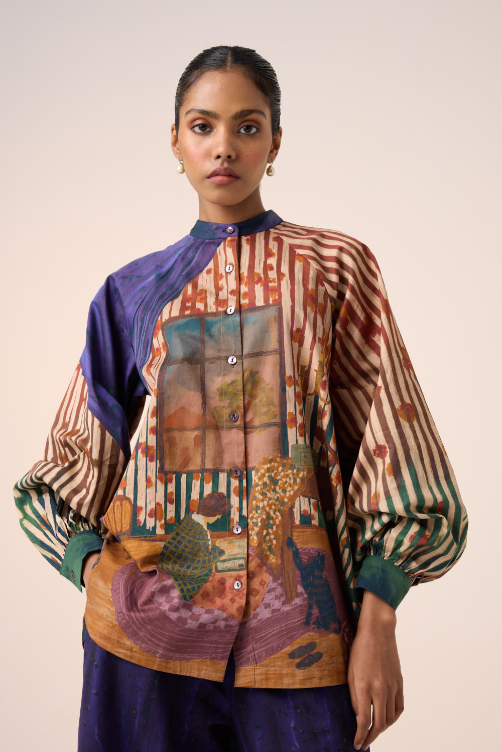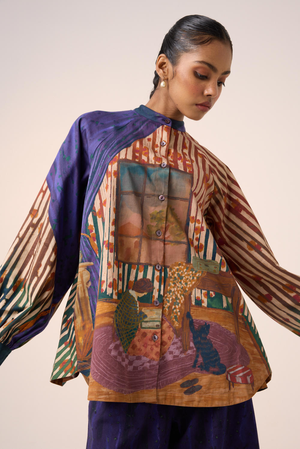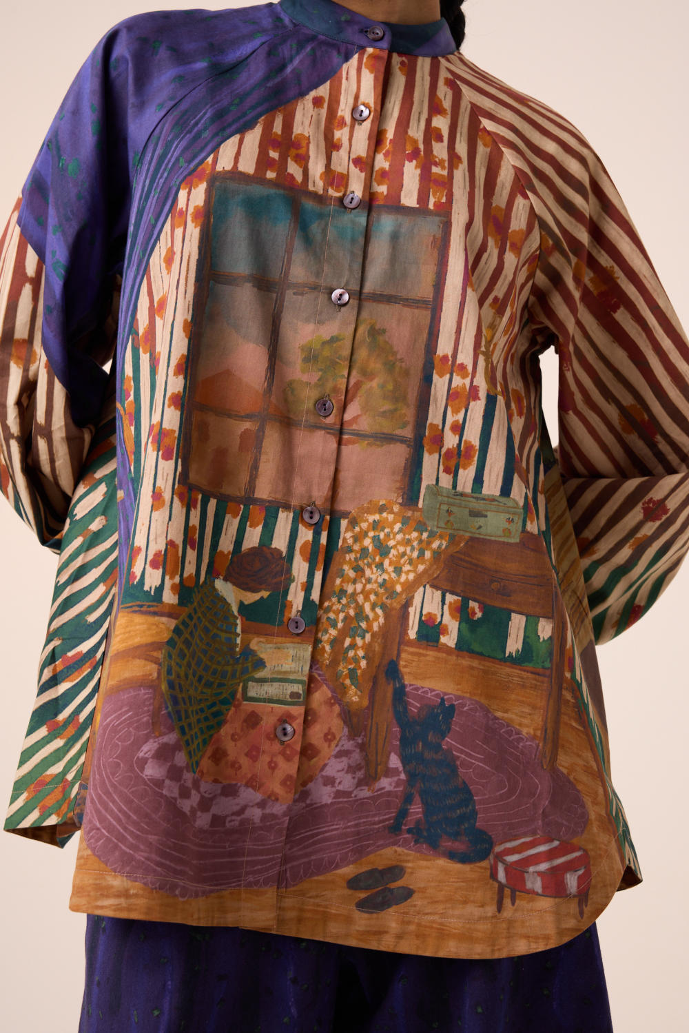 The A-line shirt is the perfect easygoing, carefree silhouette. This shirt is made in pure cotton fabric, in our calming home alone print. This shirt features raglan sleeves with button-down shirt detailing.