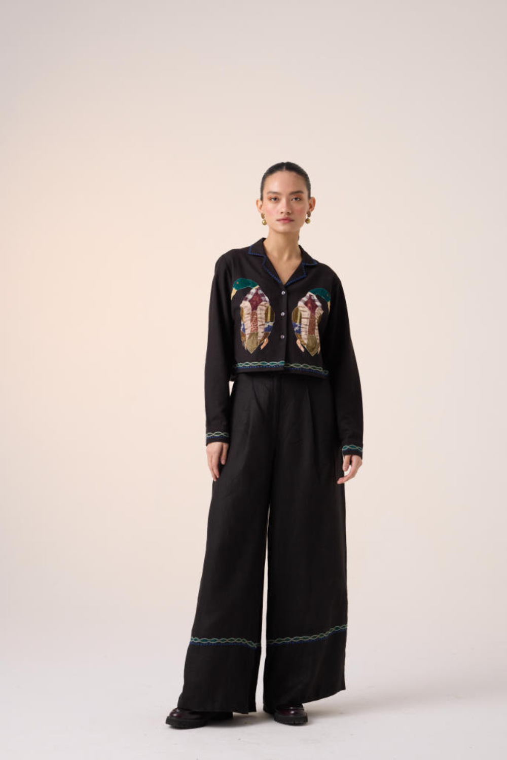 Calling out for a relaxed summer in breathy fabrics, the Crop shirt offers a quick fix for the need for a breathable, all-day comfort-driven outfit with a wide lapel boxy-fit Crop shirt. It features duck applique.