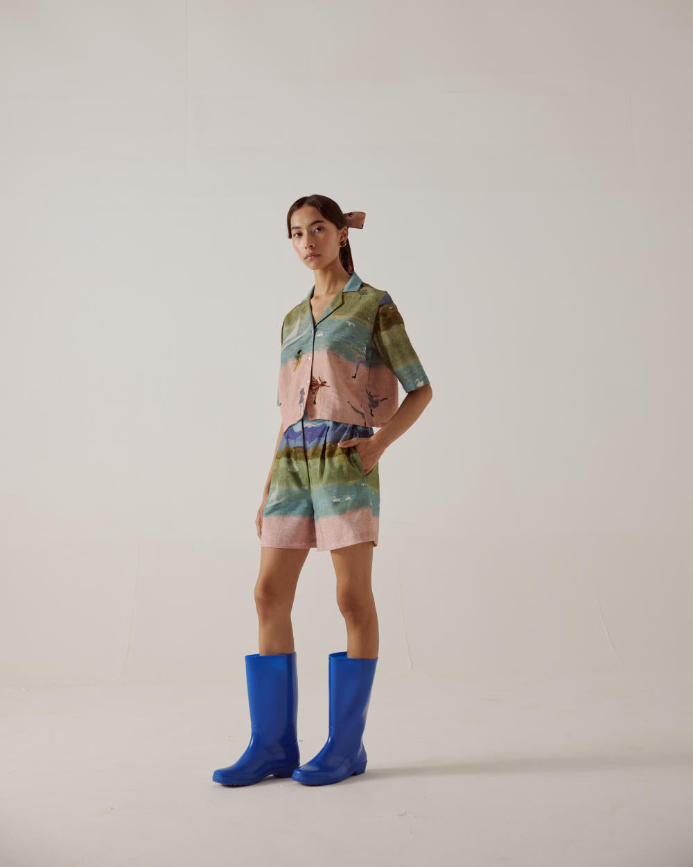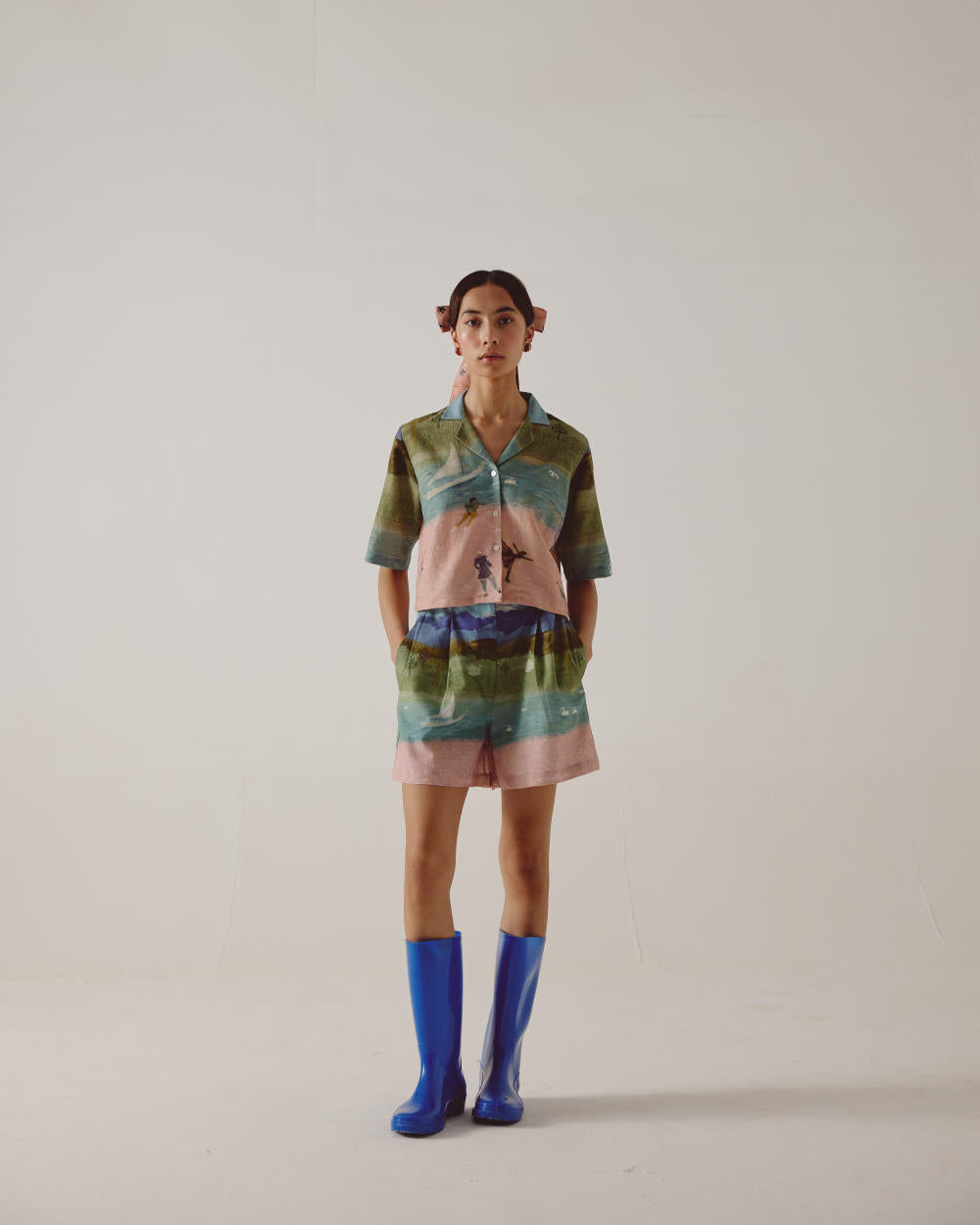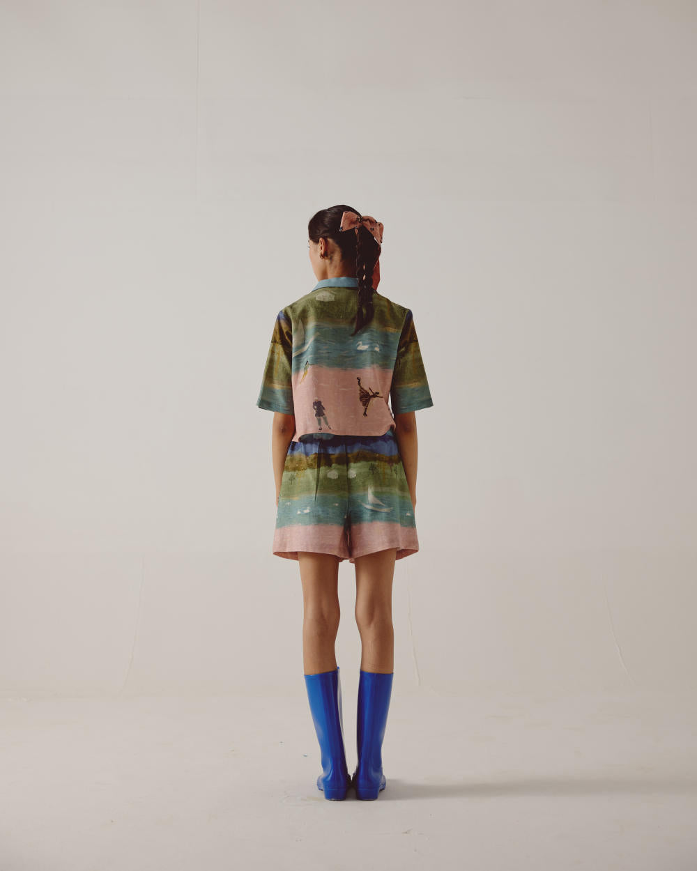 Crafted with meticulous attention to detail, this crop shirt is sure to become your go-to choice this season. Embrace the charm ofour captivating skater print. Each stitch tells a story, adding a touch of artisanal flair to your wardrobe.
