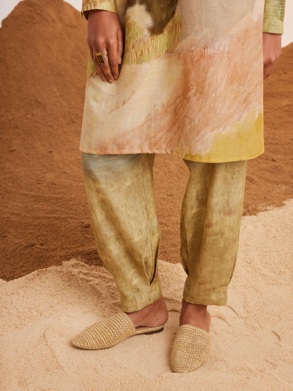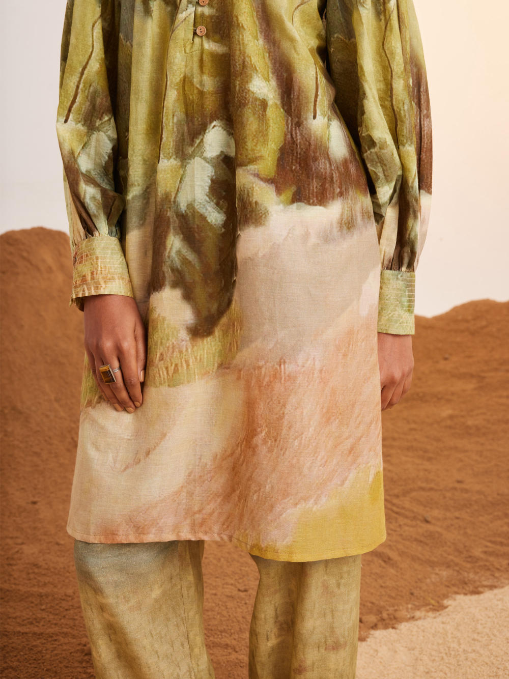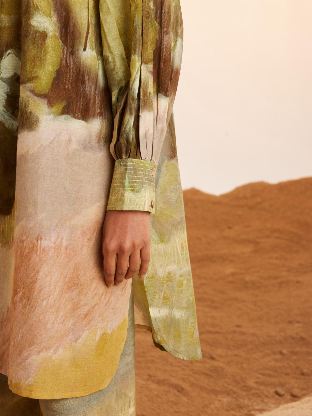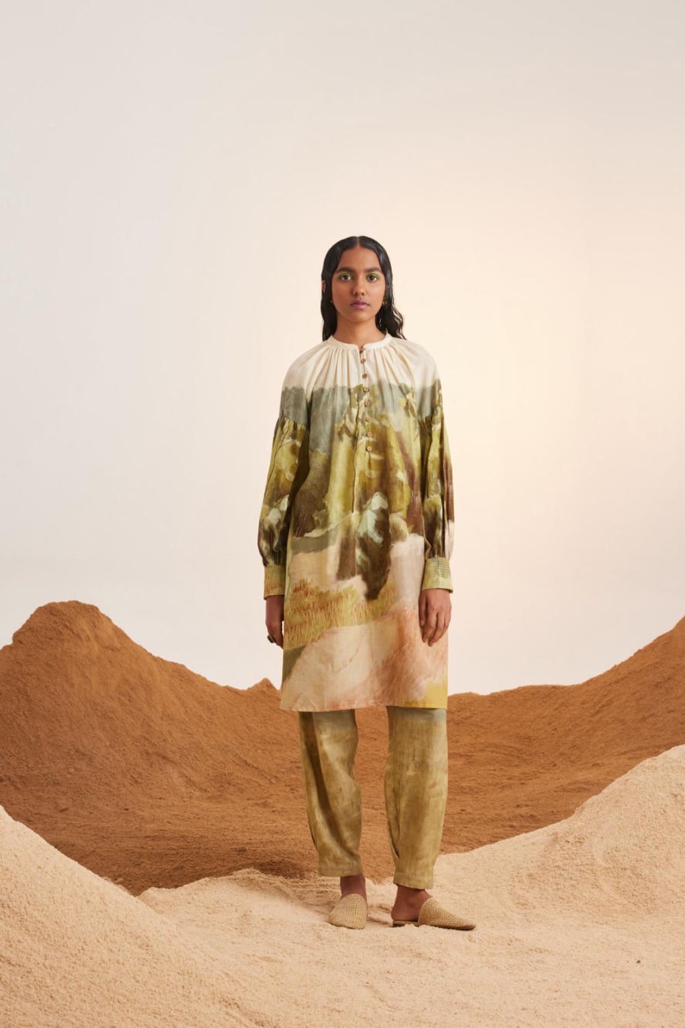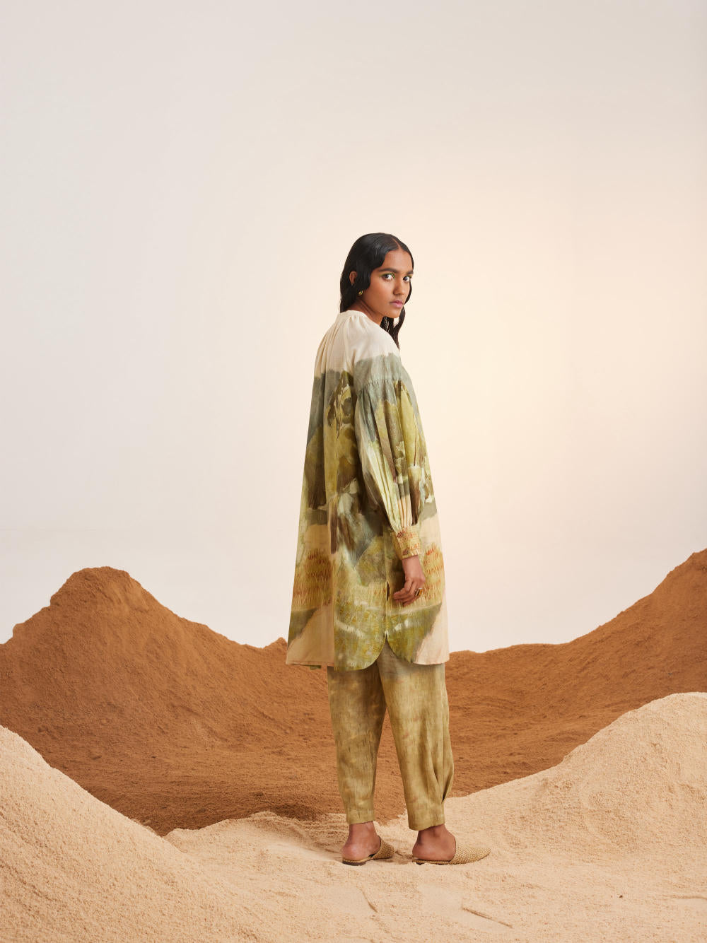 Essential Long Tunic set is our take on an artsy-elegant style which invariably makes it a must have for your wardrobe. Made in very soft cotton voile fabric in our soothing impression print, the tunic features gathers around the neck, with button fastening down the yoke. The pleat pants along with the tunic comes in same print and made in pure cotton fabric. It features the classic button and zip fastening in the front.