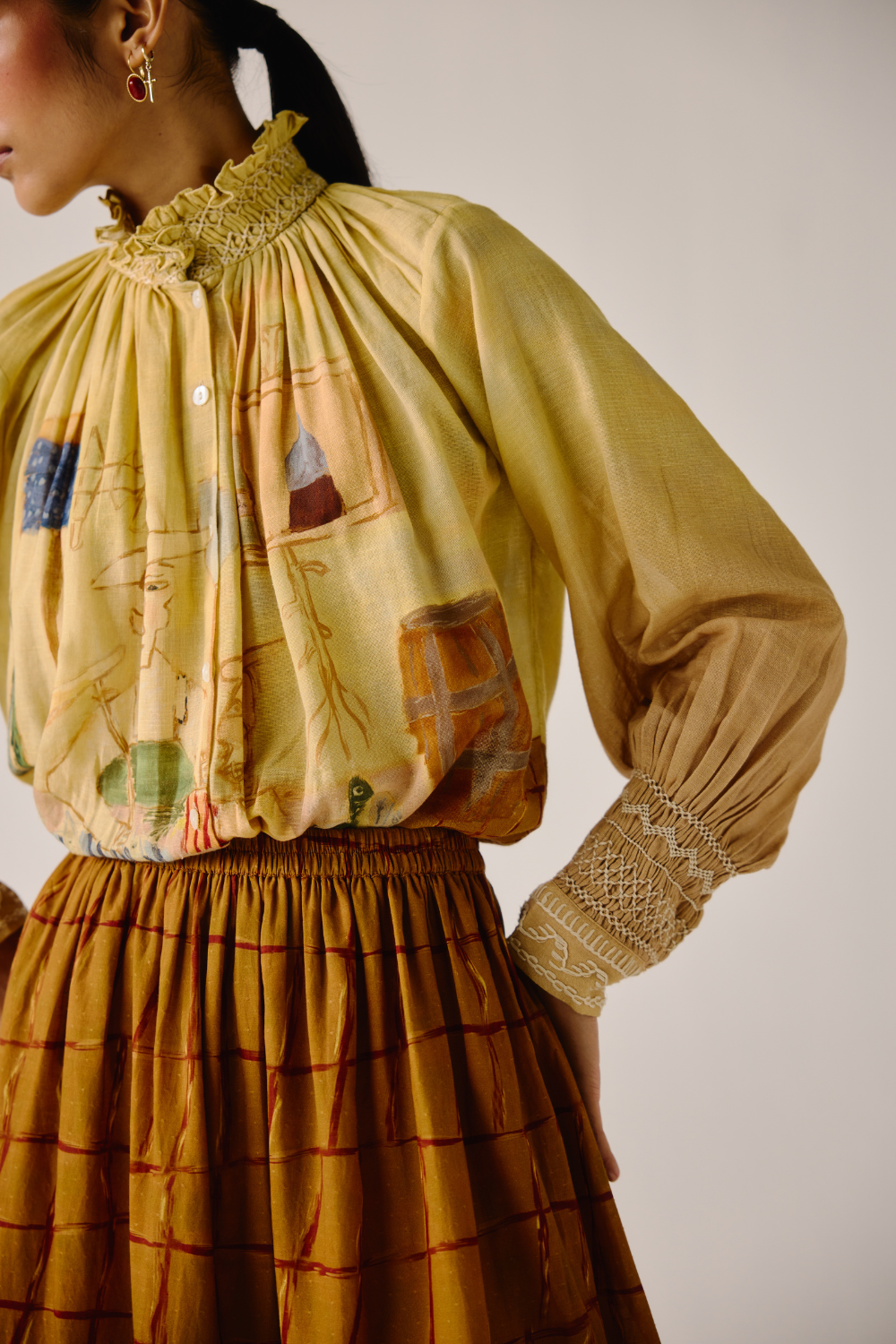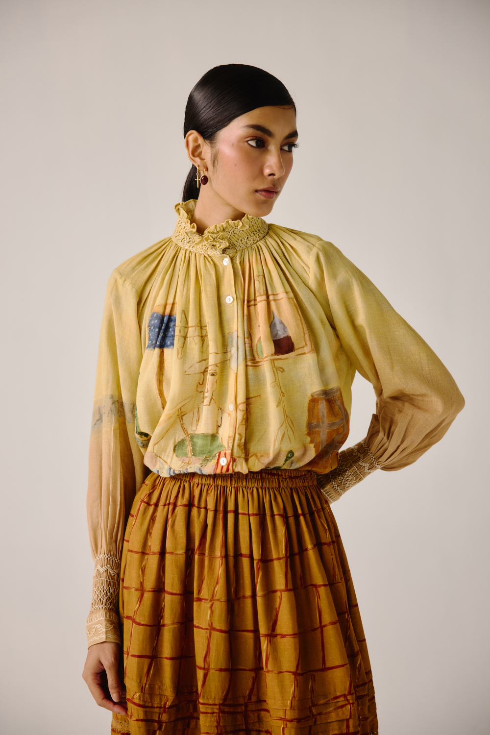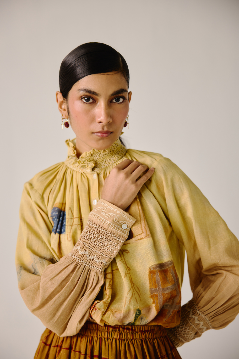 Details : Cropped Length, smocking details on the cuff & neck, front button fastening