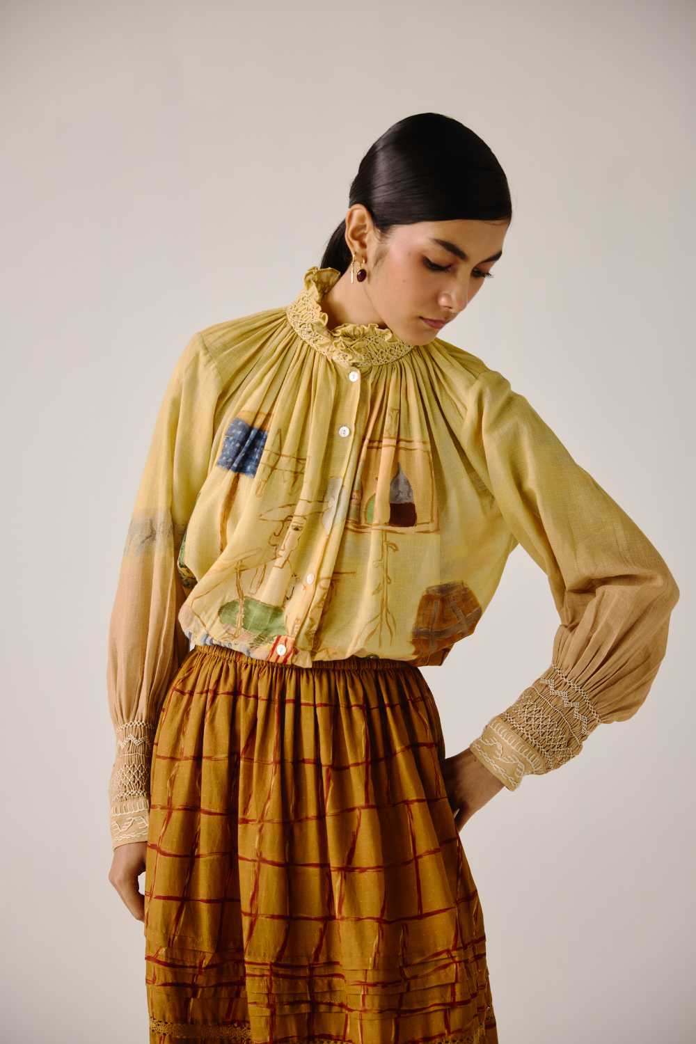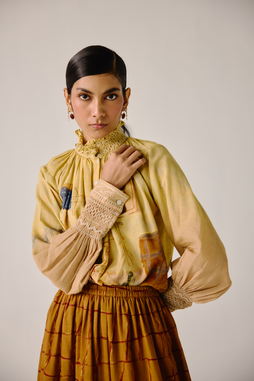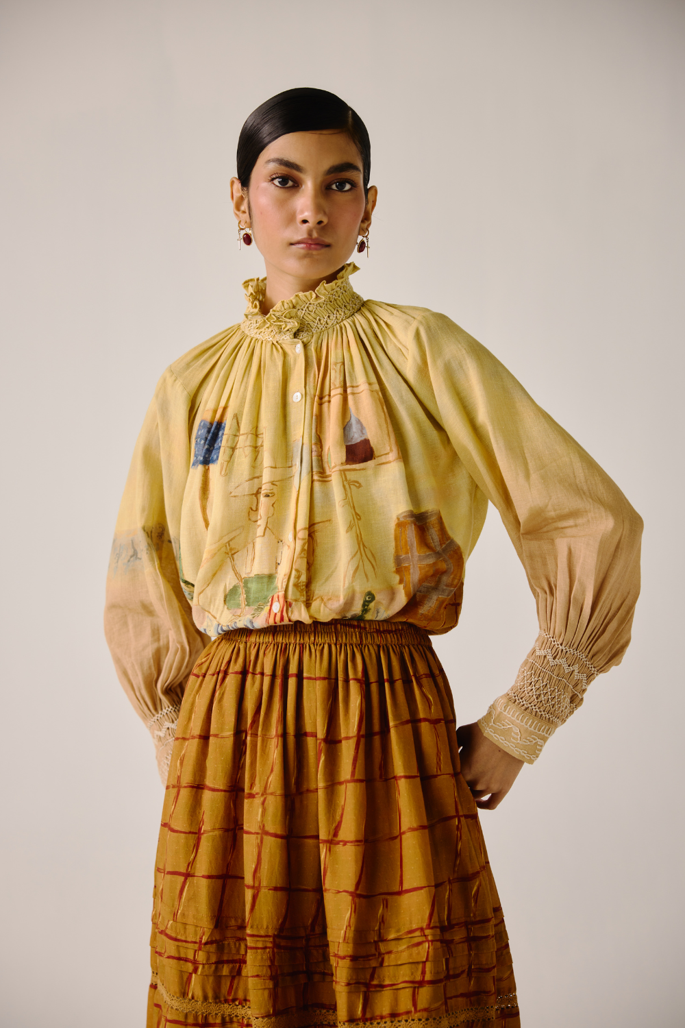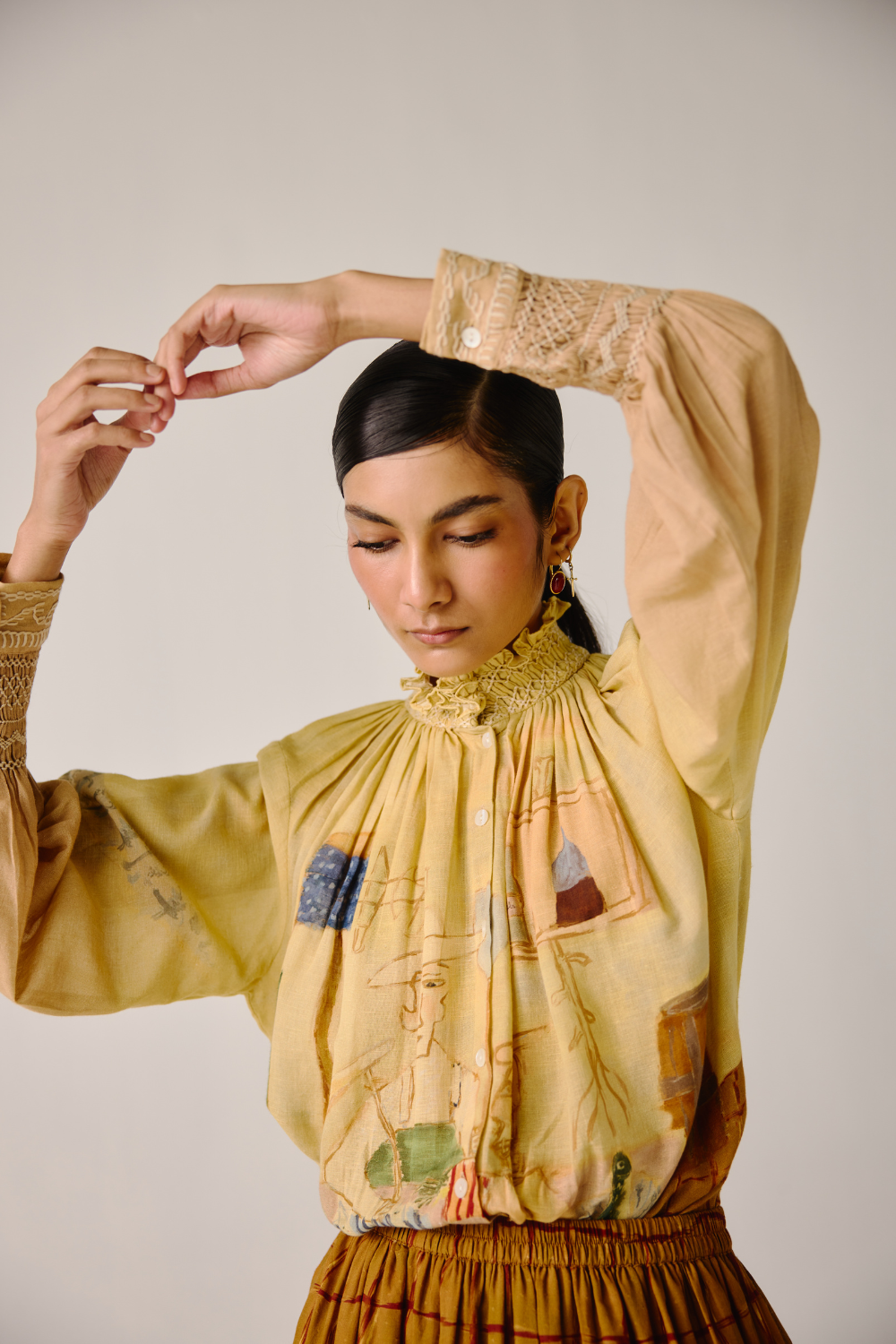 Details : Cropped Length, smocking details on the cuff & neck, front button fastening