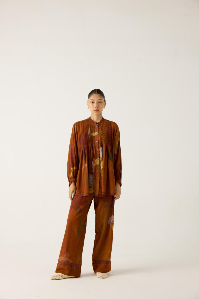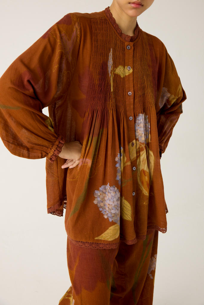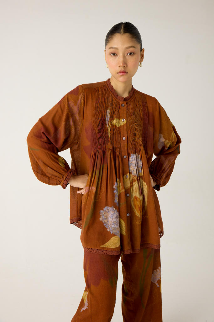 the Nova top is made from cotton in our foliage print, which is a button-down top. It features ruffled lace details on the neck, cuff and hem.