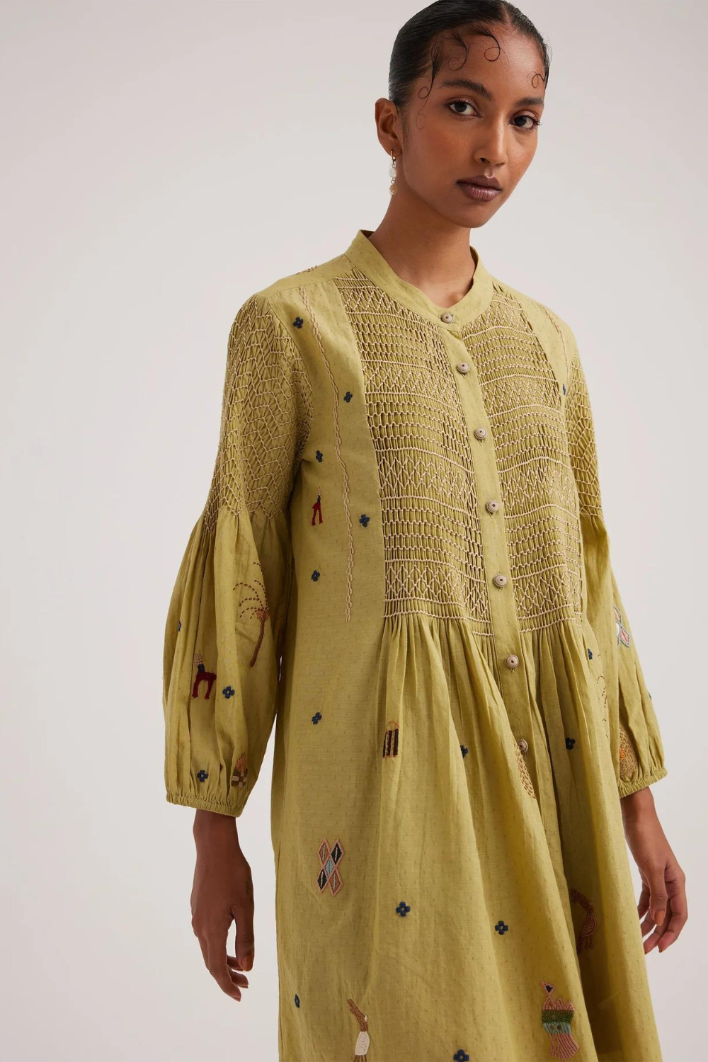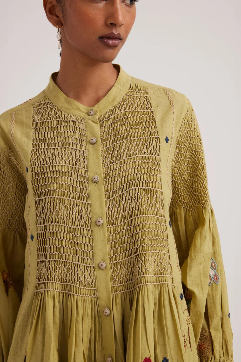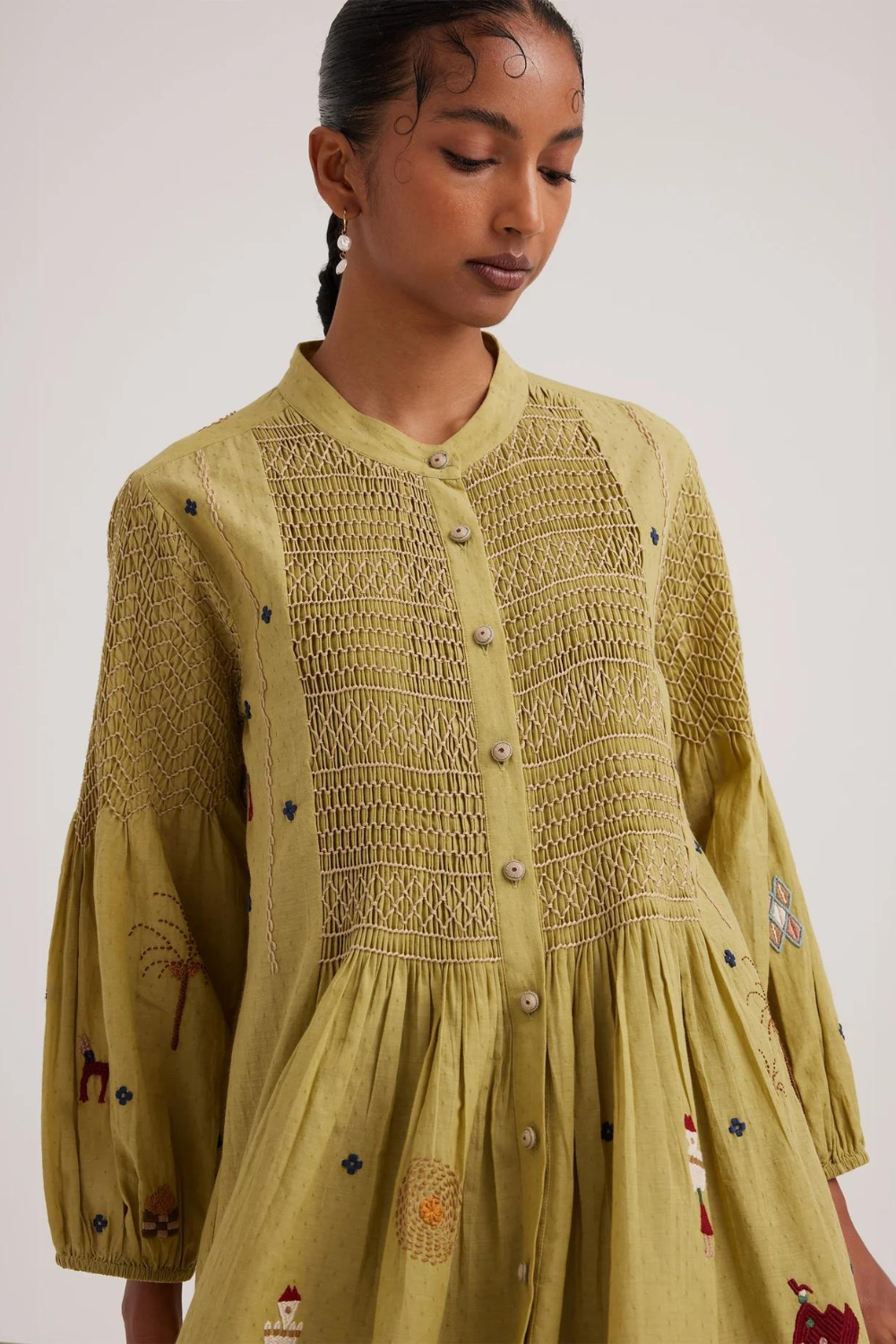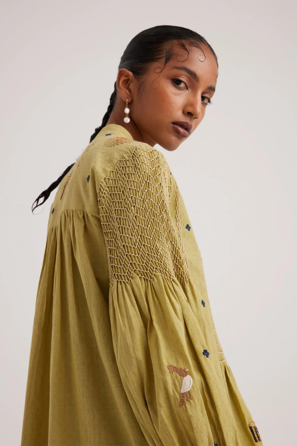 Buttoned up mid-length top with hand smocking details, our folk embroidery all over and gathers at the sleeve end. Made in soft breathable cotton, it is wearable across seasons.