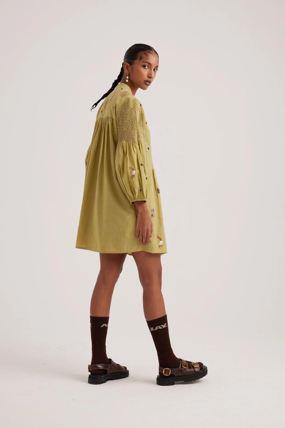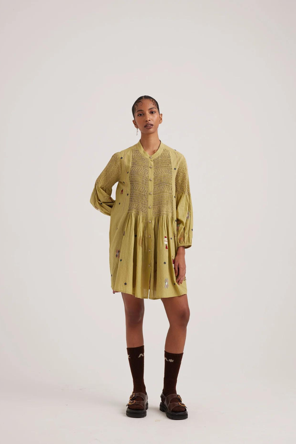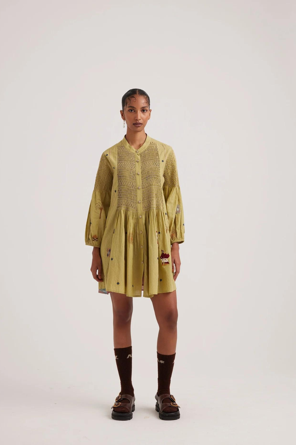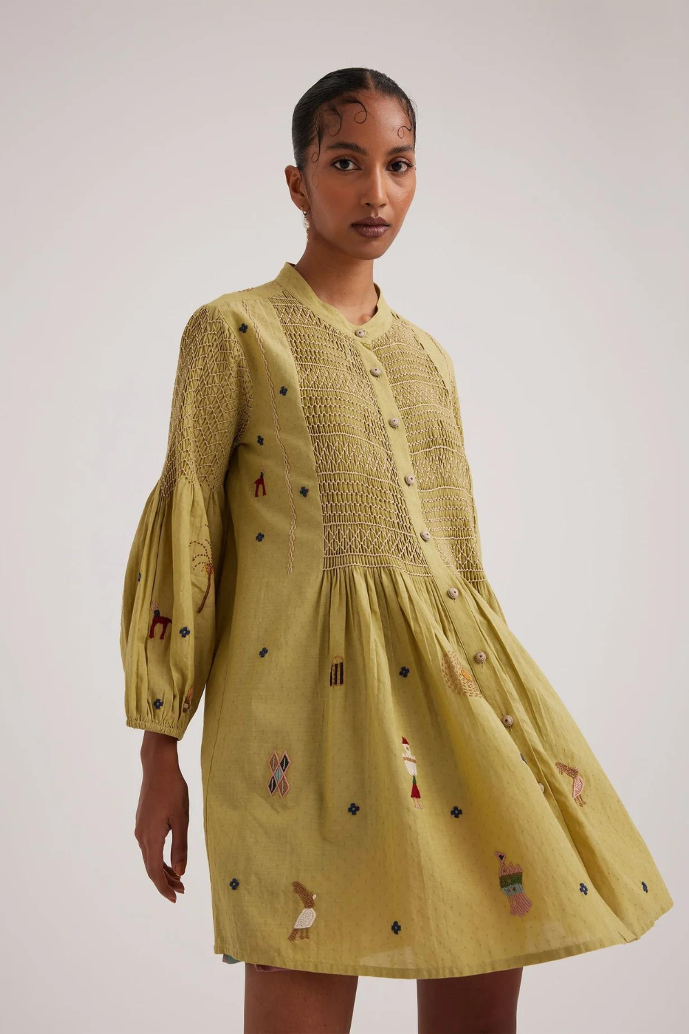Buttoned up mid-length top with hand smocking details, our folk embroidery all over and gathers at the sleeve end. Made in soft breathable cotton, it is wearable across seasons.