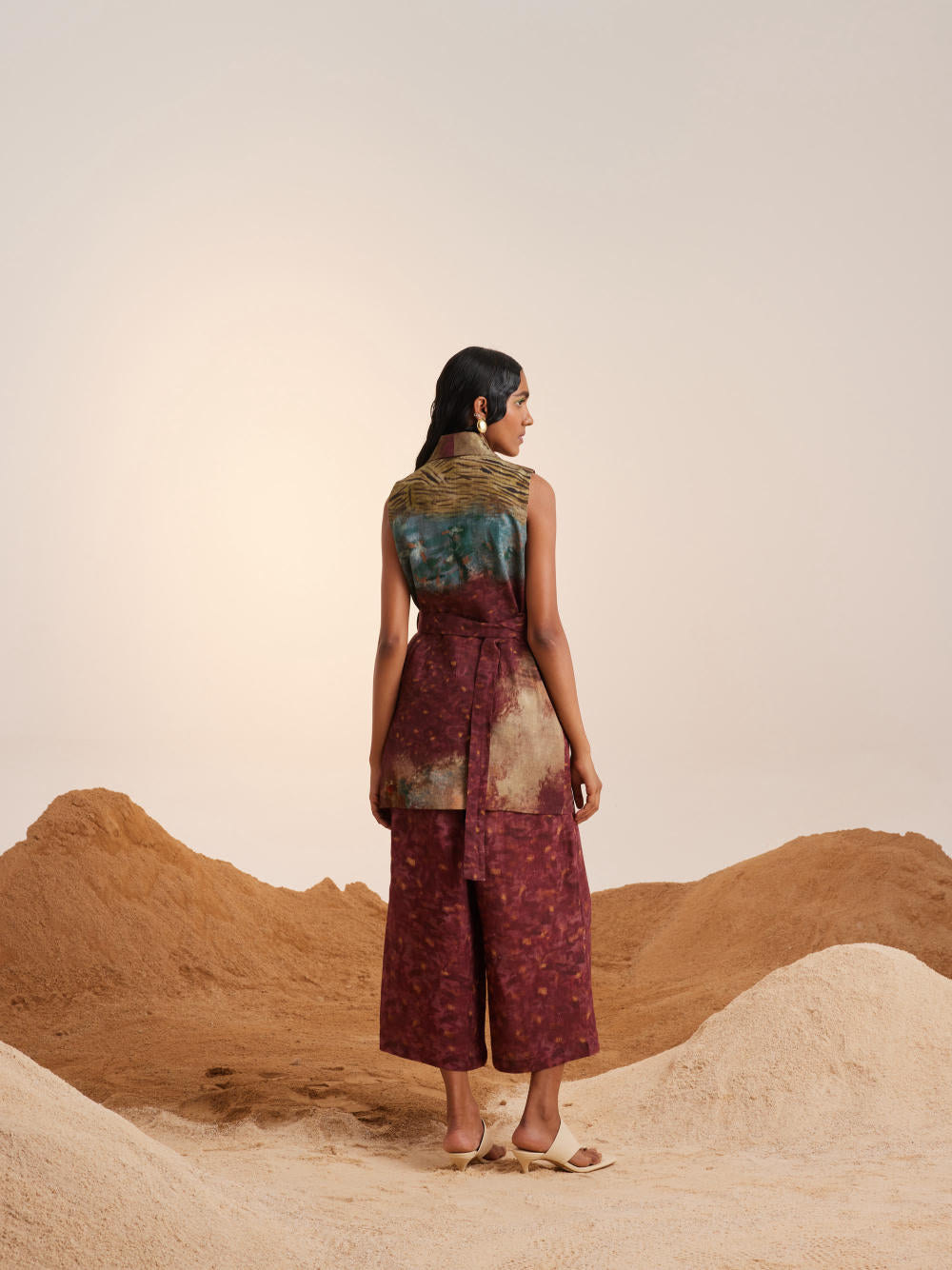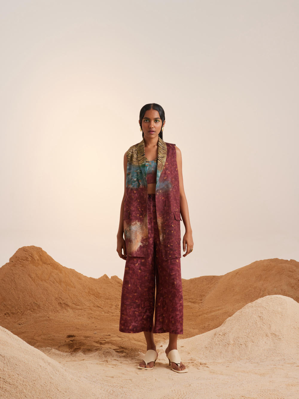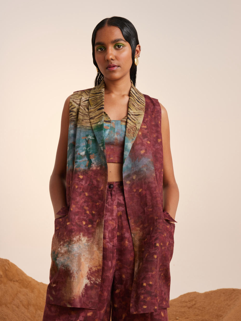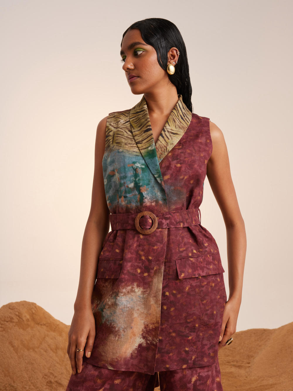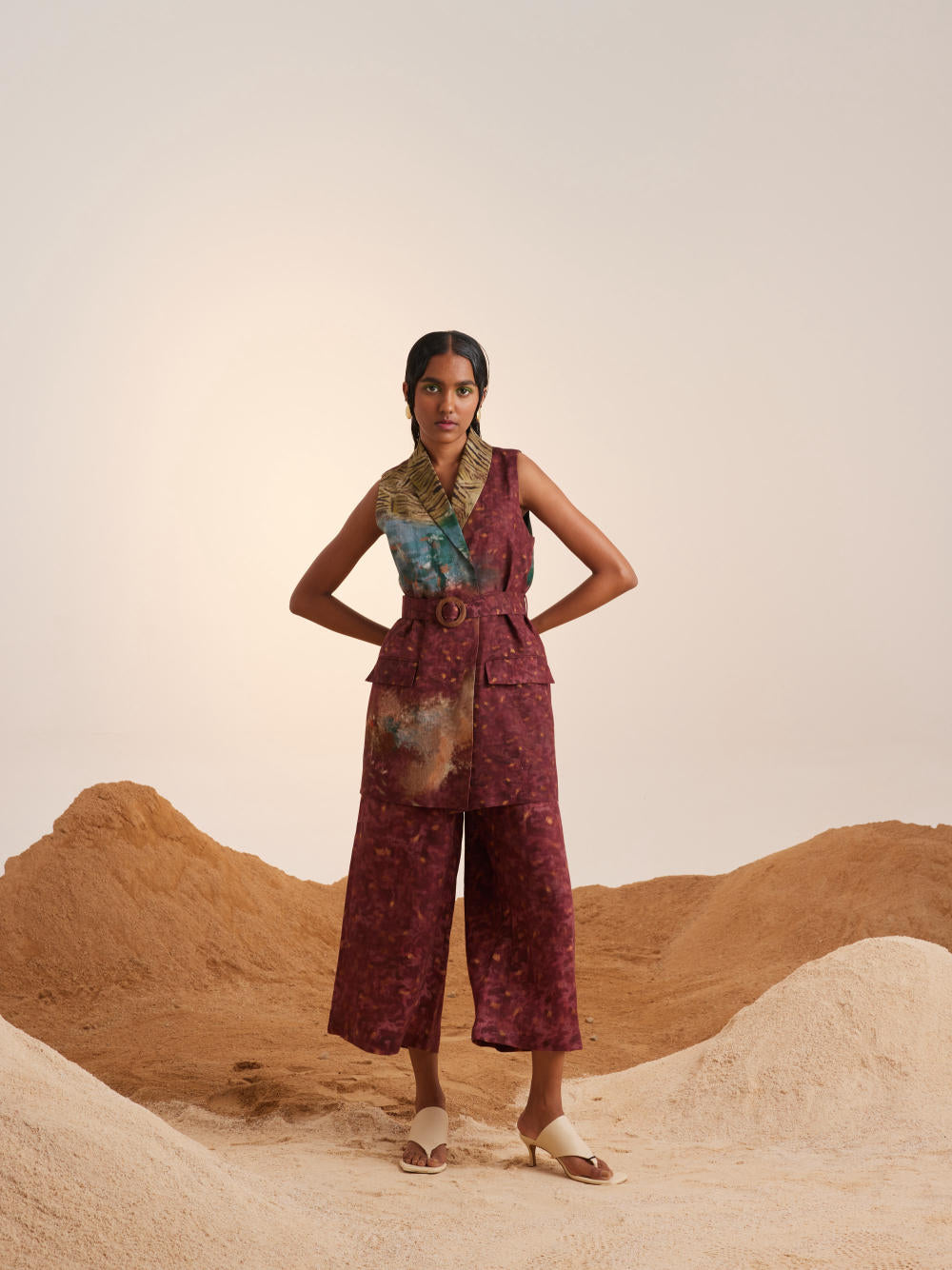 A chic silhouette all over consisting of a classic sleeveless cut blazer with crsip lapels made in pure handwoven linen fabric in our artsy Grain print. It comes with a belt to go aorund the waist for a cinched look. Tha pants are made in pure handwoven linen fabric in the same print as the blazer. It has a button fastening in the front.