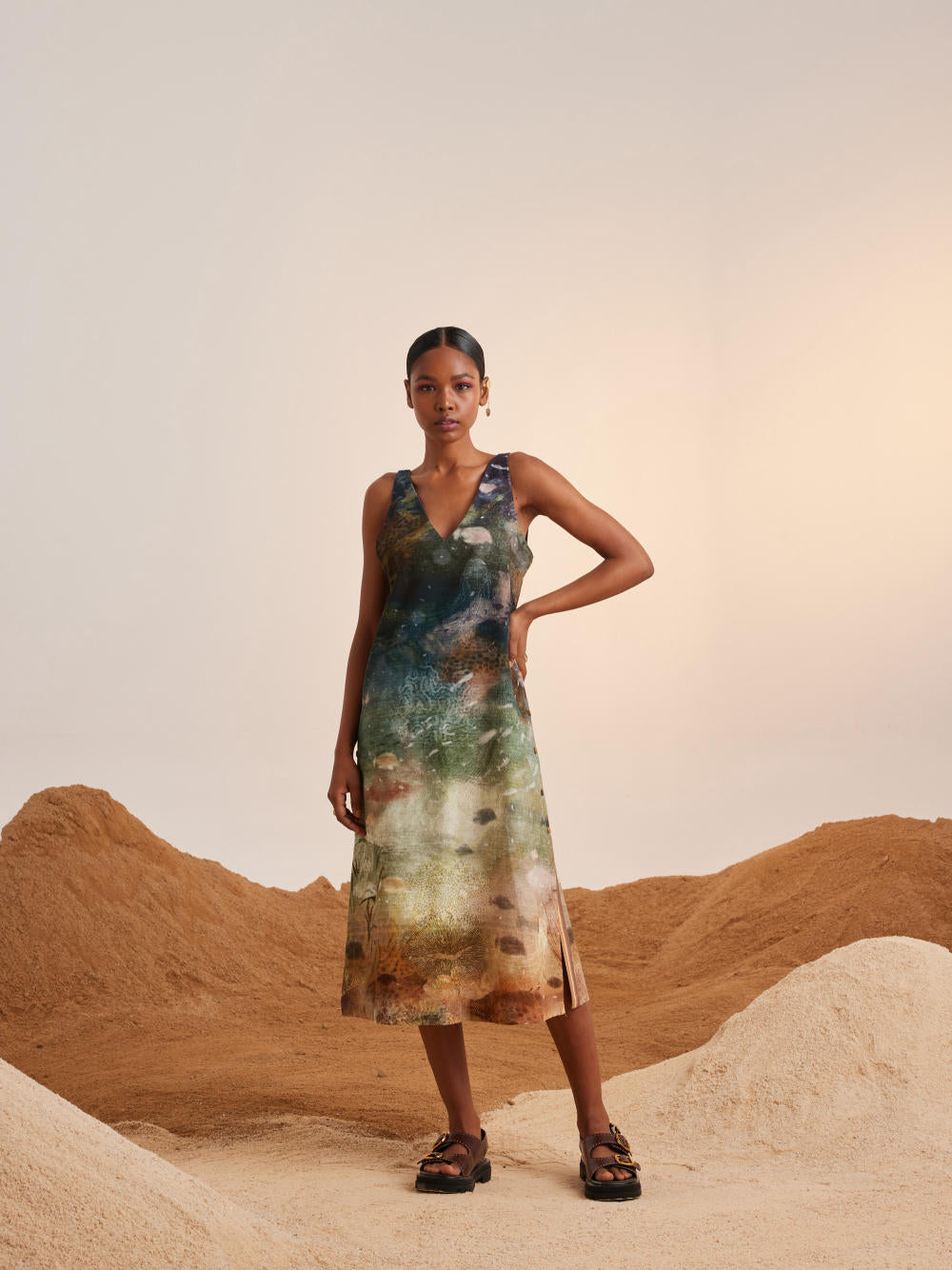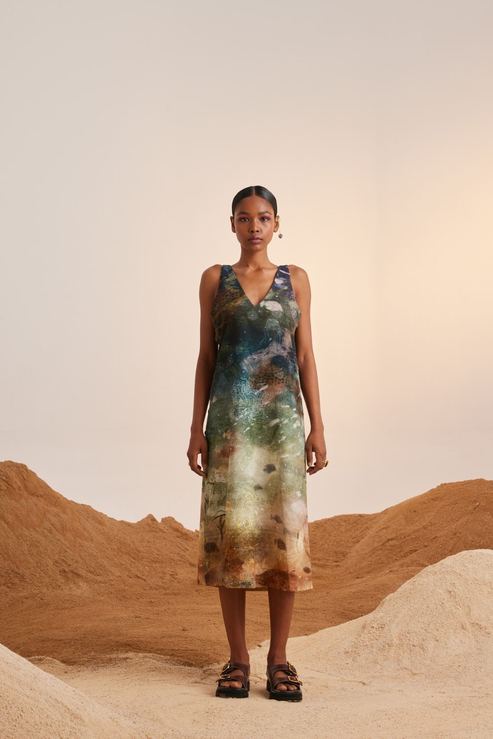 A sleeveless cotton dress featuring two patch pockets at front, and single button closure at back. Wear it as a separate or with our ruffle top inside.