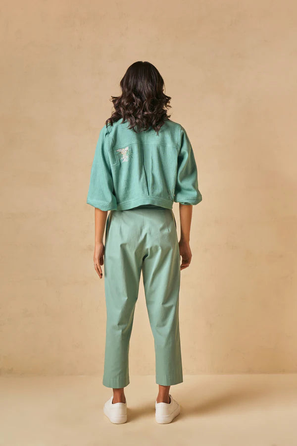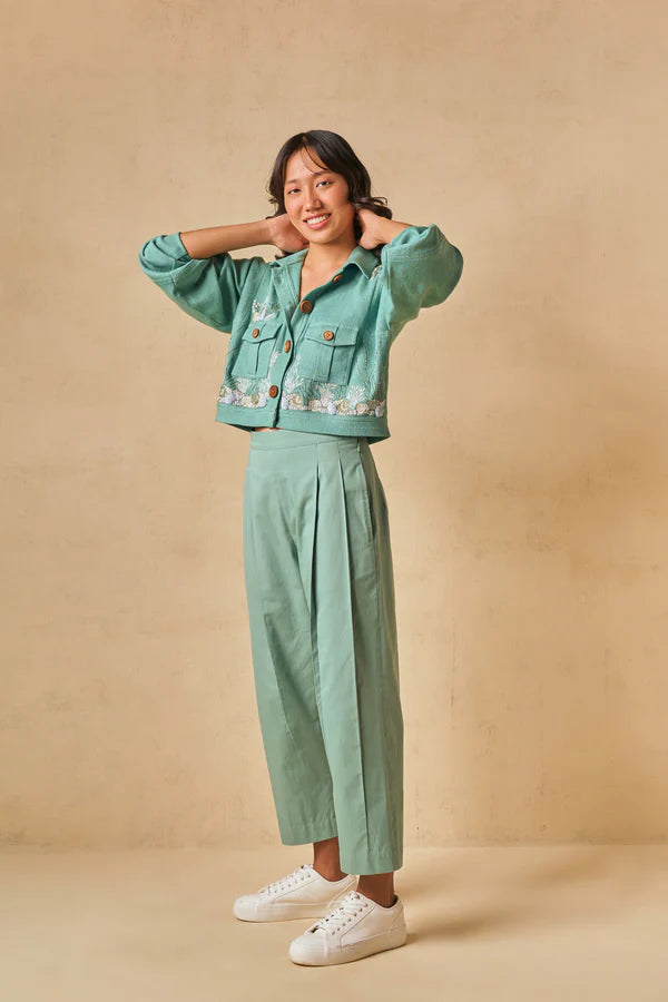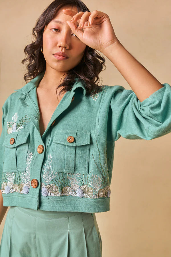 Regular fit, long-sleeve crop jacket that buttons at the front, crafted in azo-free dyed handpsun and handwoven organic cotton. This piece is also machine and hand embroidered with ocean-inspired motifs. Our cropped jacket is the perfect staple, an easy, effortless addition to any look that gives it some extra green flair.