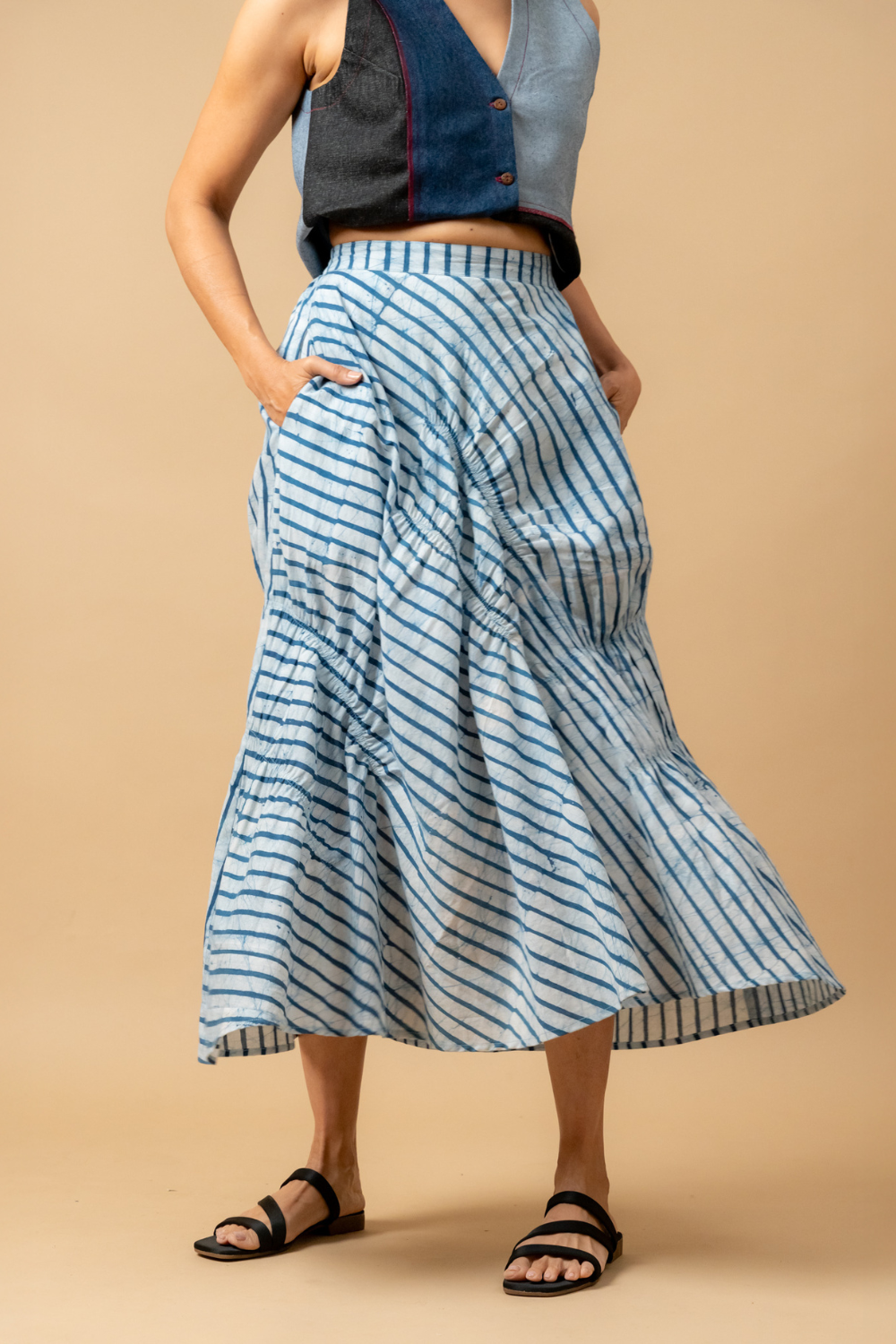 Description: Deconstructed skirt with gathers and back elastic with inseam side pockets.