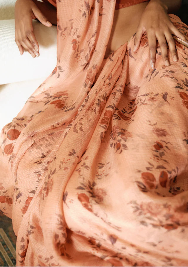 This exquisite saree is crafted from the finest Kota Silk fabric, making it incredibly lightweight and breathable. The beautiful floral print adds a touch of elegance and sophistication to the saree with Chanderi Blouse, making it perfect for any occasion.