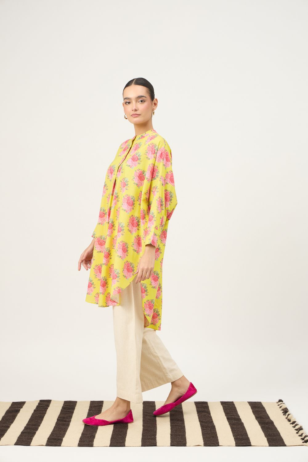 This ensemble features a Yellow Cotton Floral crafted in a lightweight, Pure Cotton, adorned with romantic rose Bunch. The kurta has a relaxed, short kurta with flowy three-quarter sleeves. Paired with it is a cream Pants, tailored in a breathable cotton that adds graceful movement and balance to the look.