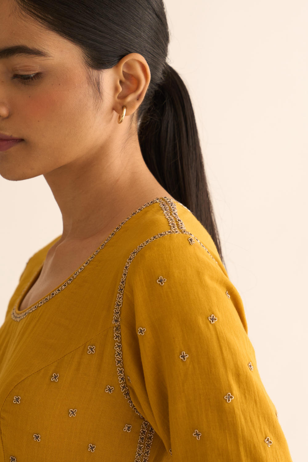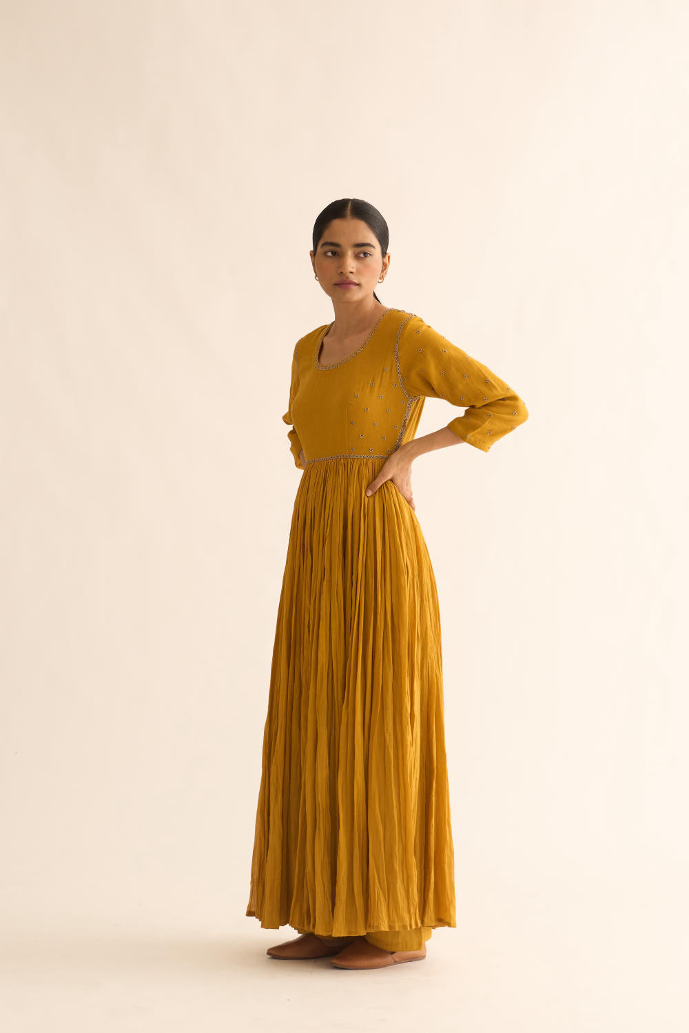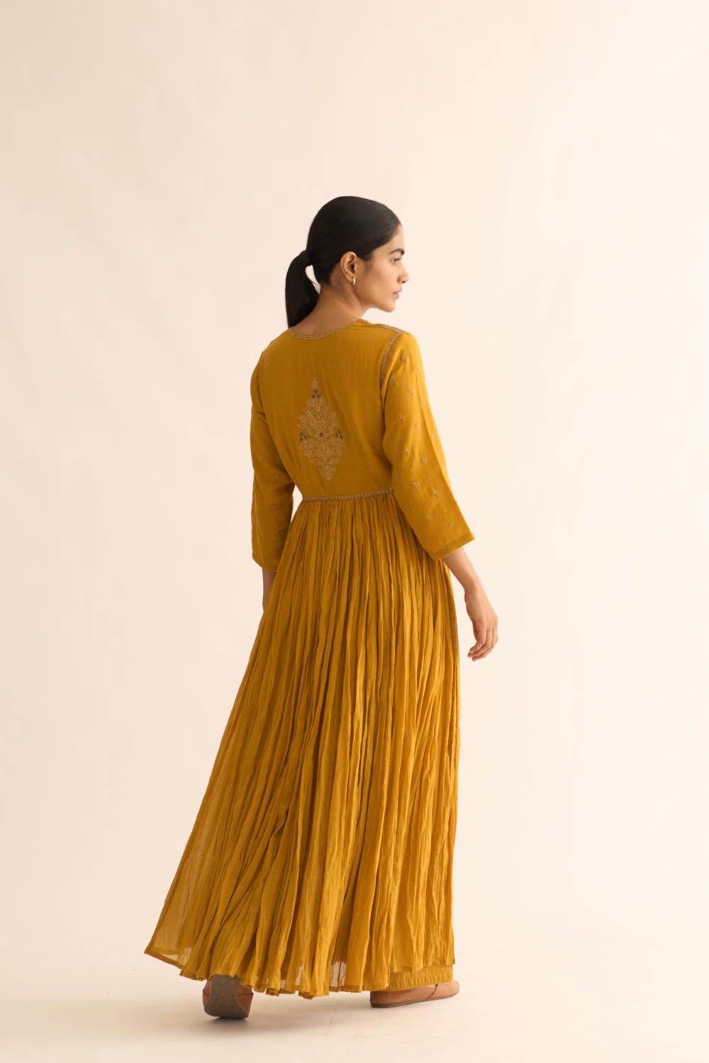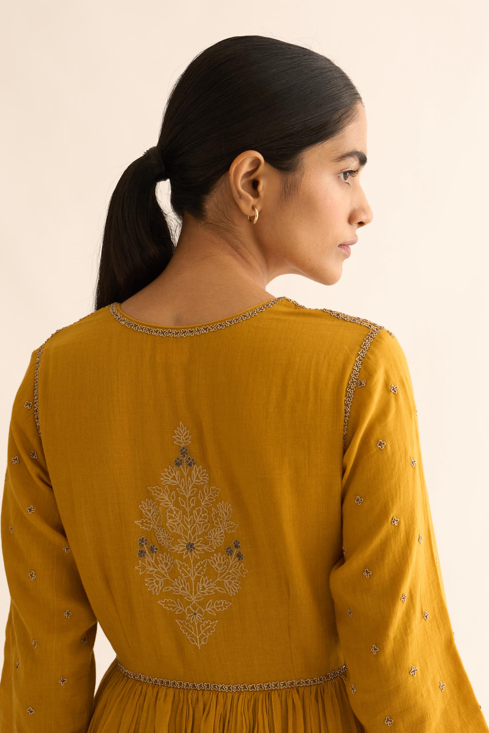 Featuring mustard cotton kalidar kurta with zari detail on neck with floral buta on back and also has detailed floral motif on sleeves along with cotton straight pants.