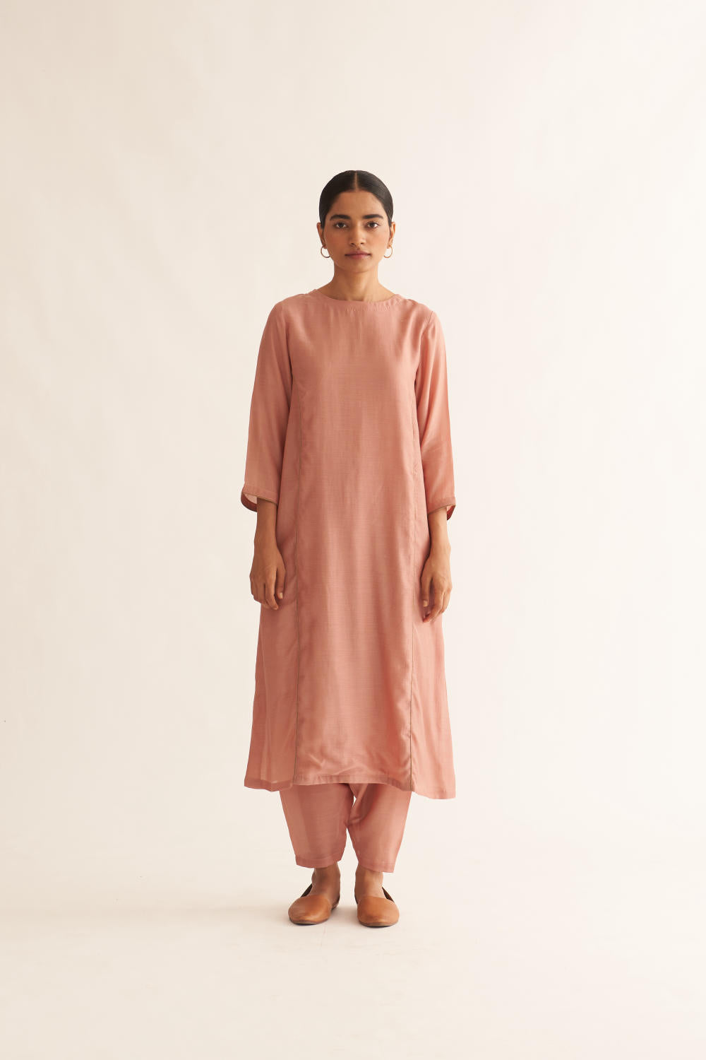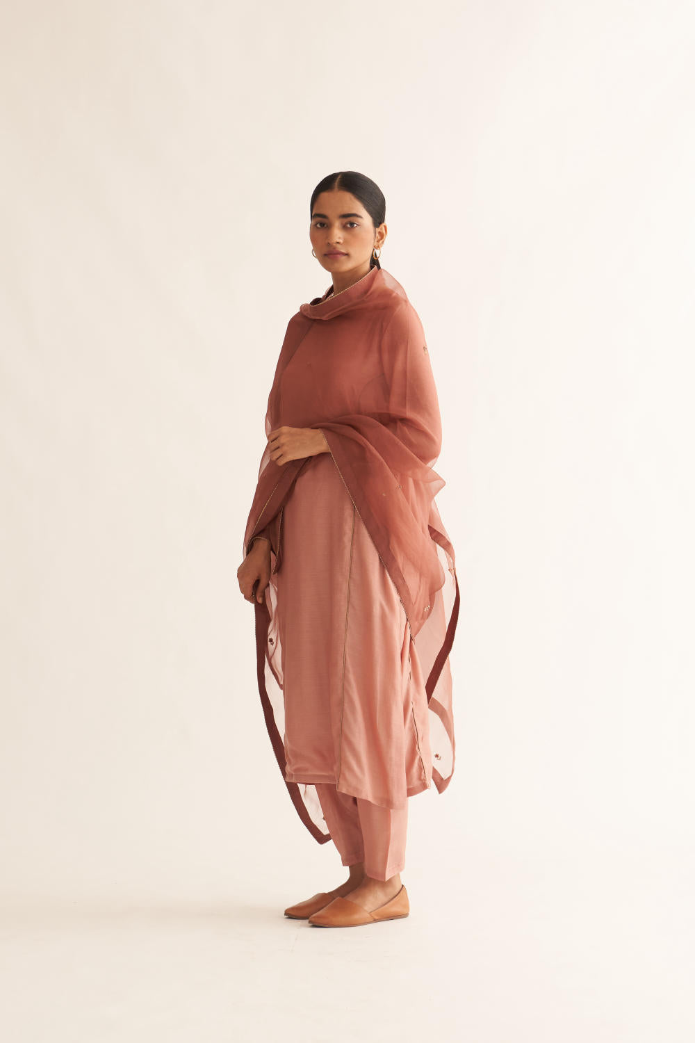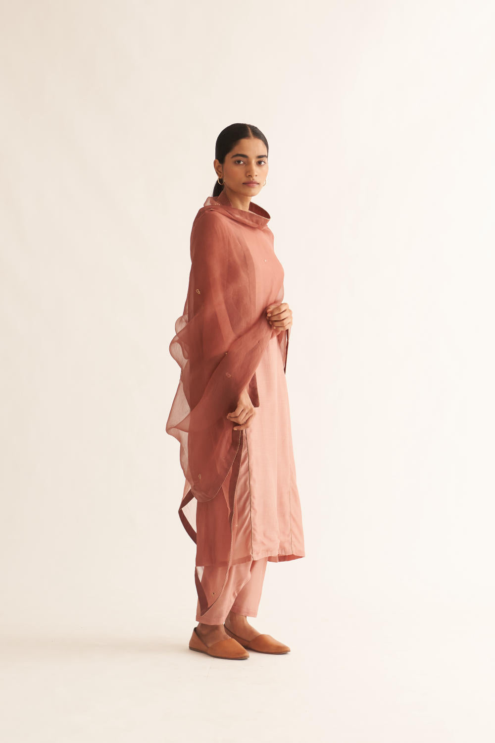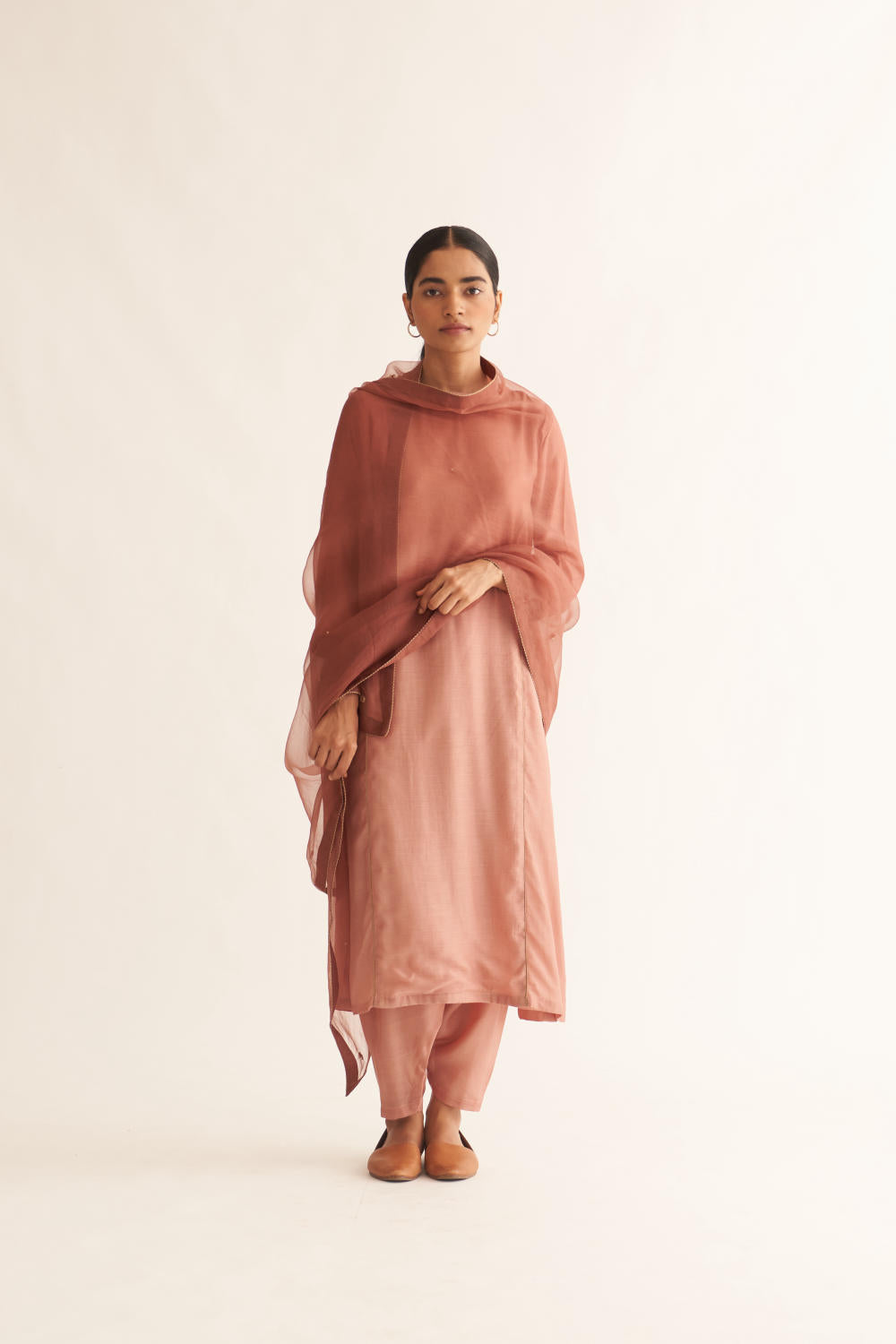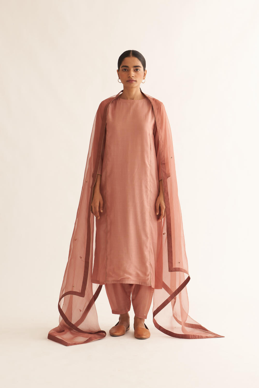 Featuring old rose kurta in Cotton silk with salwar and Hand embroidered Dupatta in Organza with golden zari buta all over.