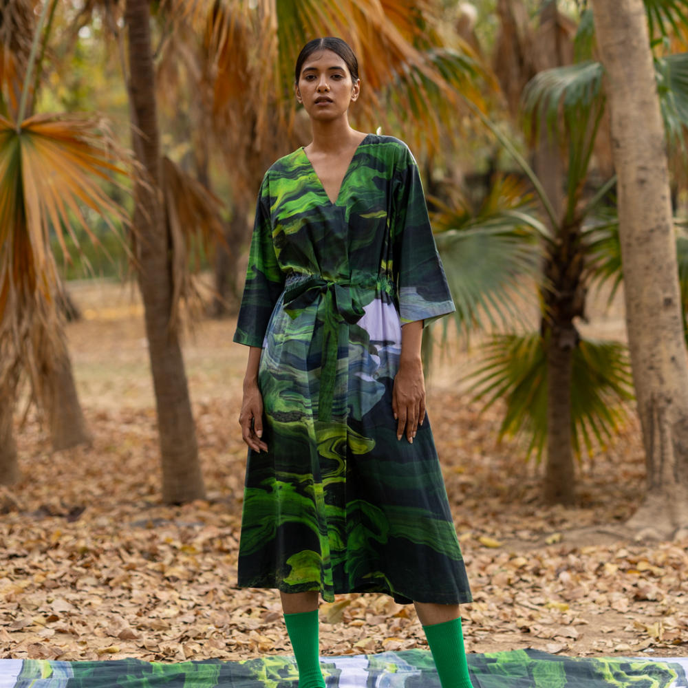 Description: Oversized fit printed dress with adjustable belt at waist and side pockets.