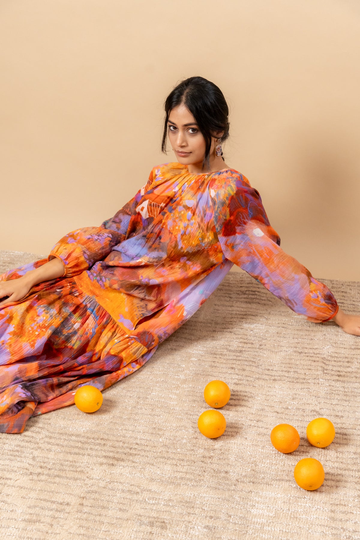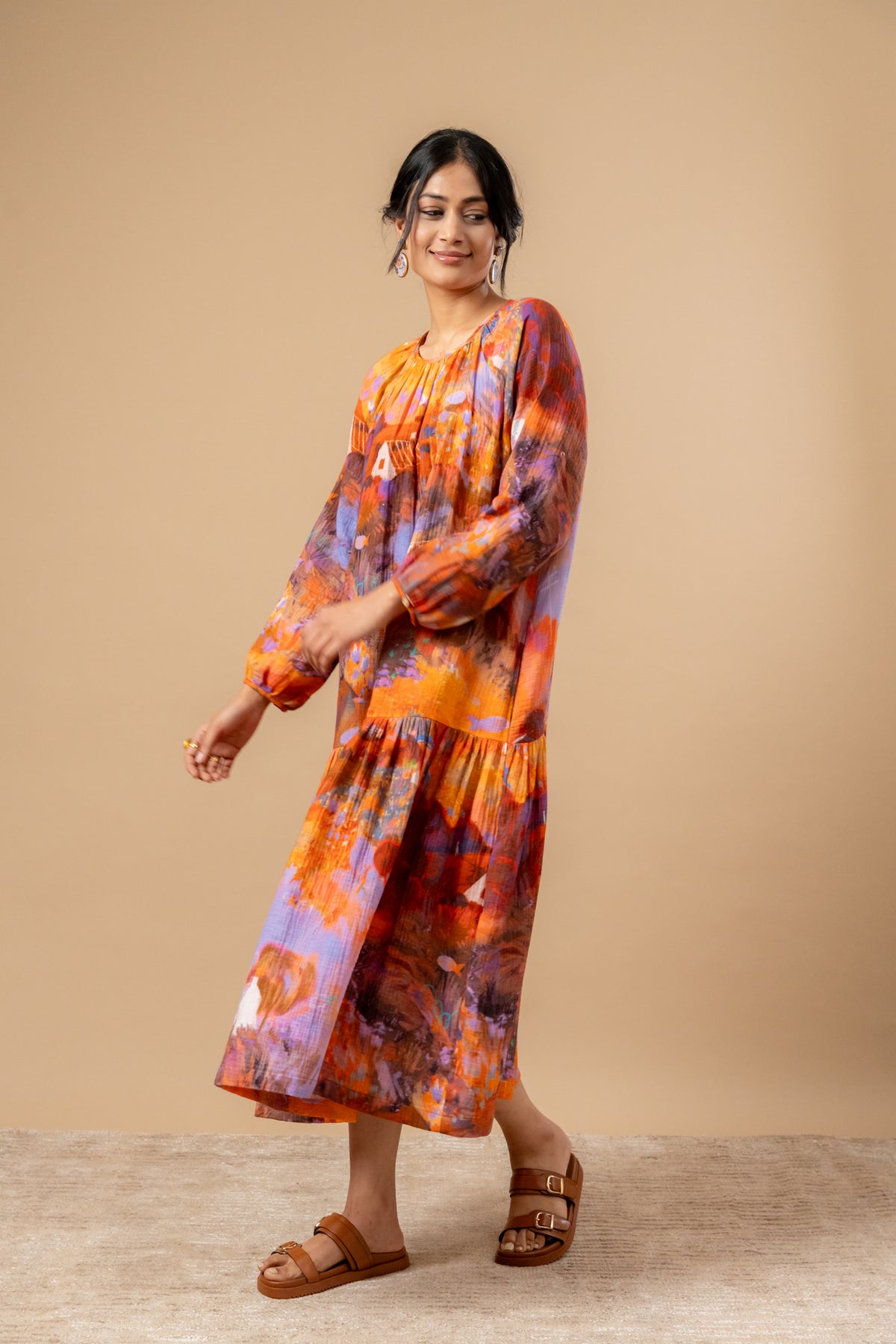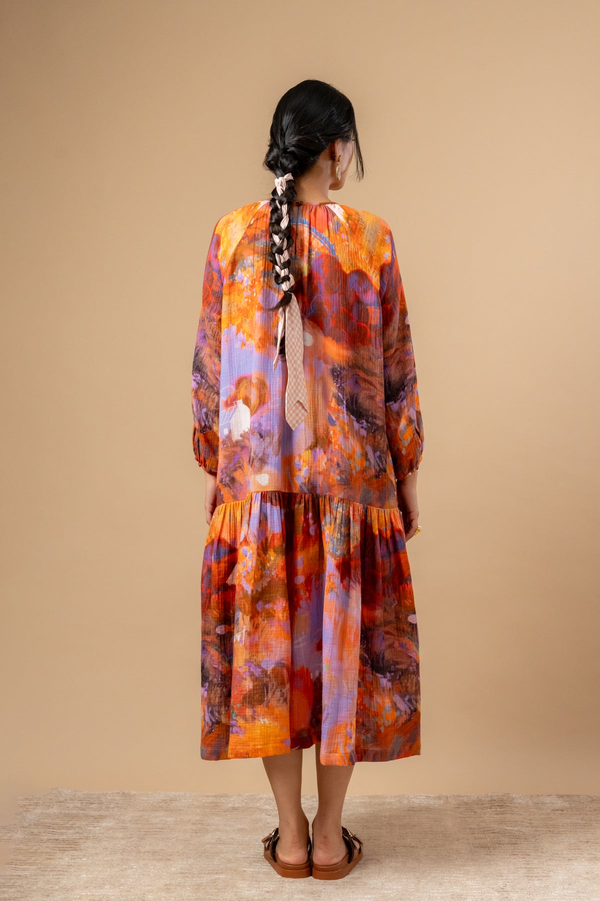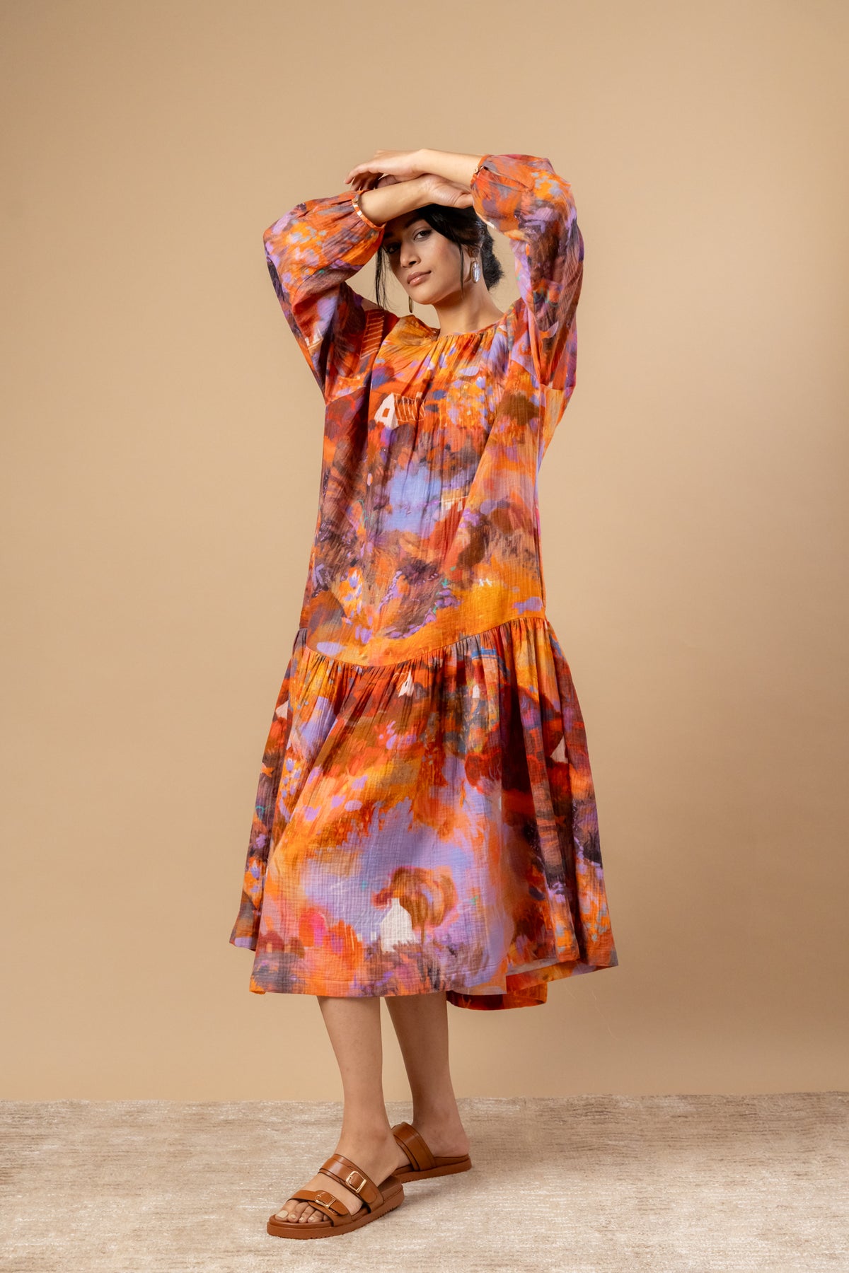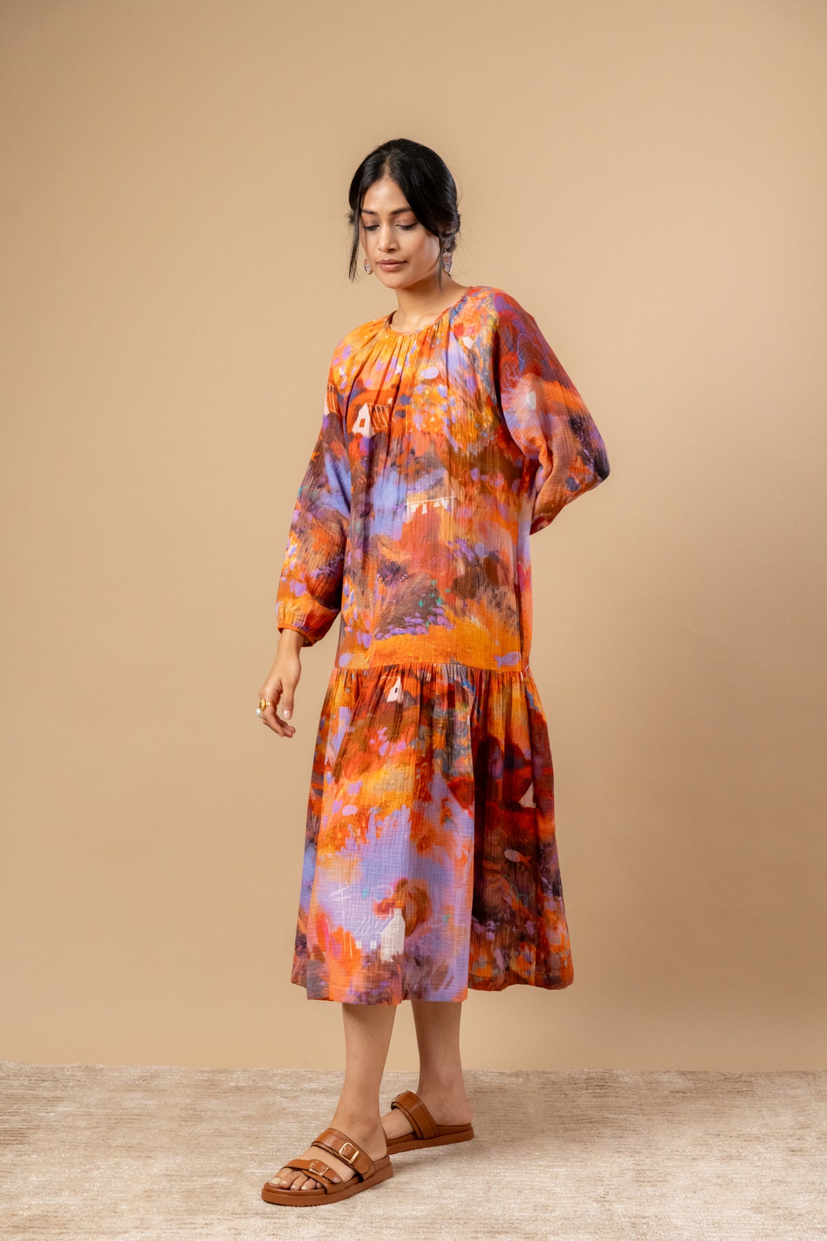 Description: Neck gathered, loose-fitted dress with hand-painted doodle print on organic cotton, dress comes with side pockets.