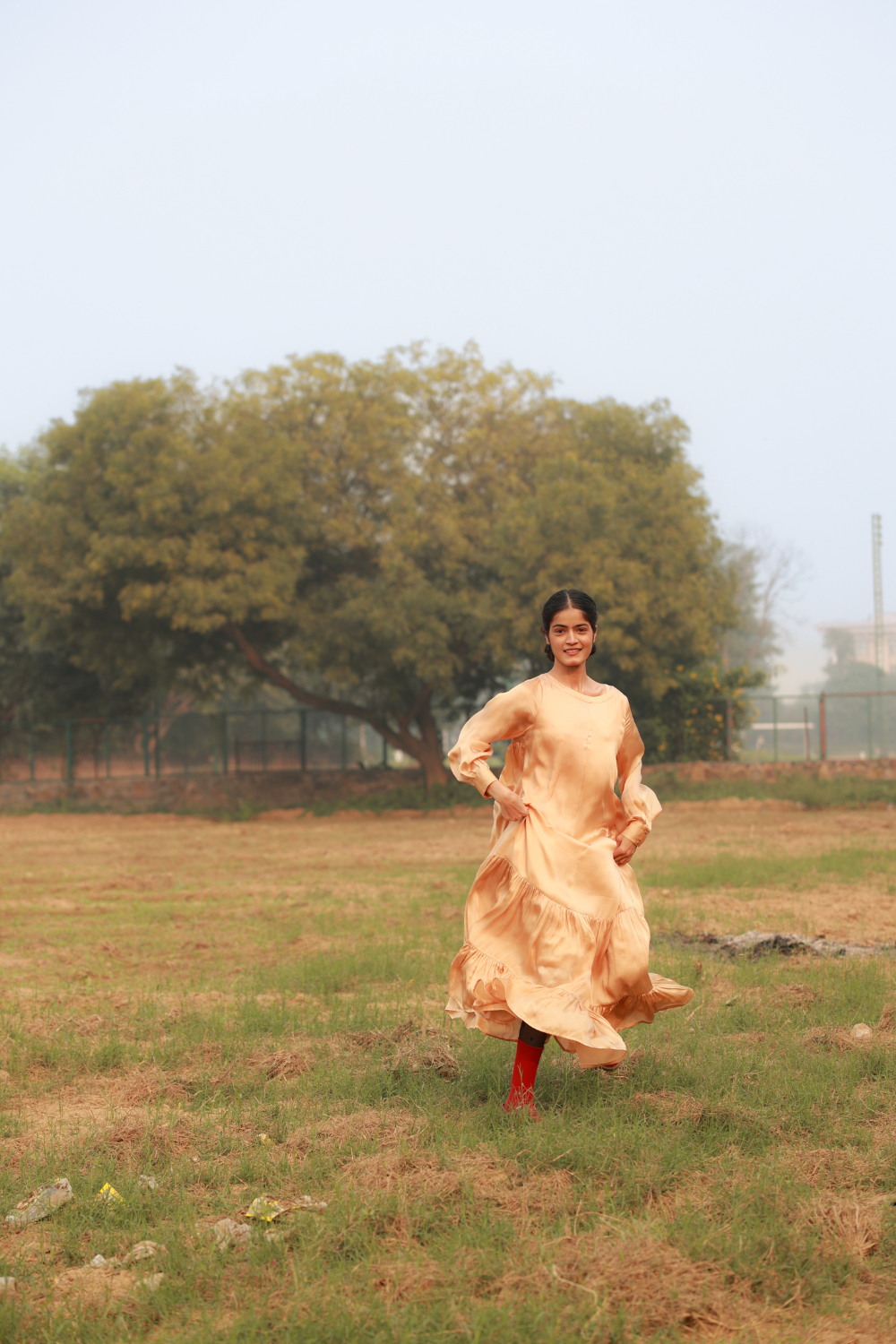 Exaggerated flowy dress with frills at the bottom and gathers at the back. The dress comes with side pockets and can be styled in many ways.