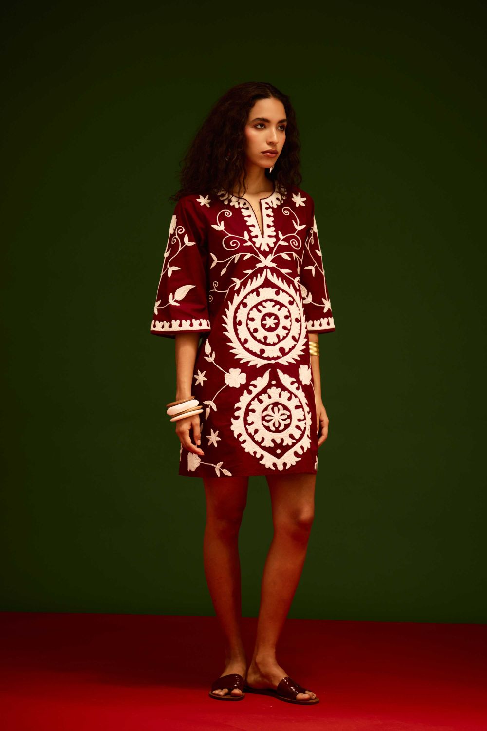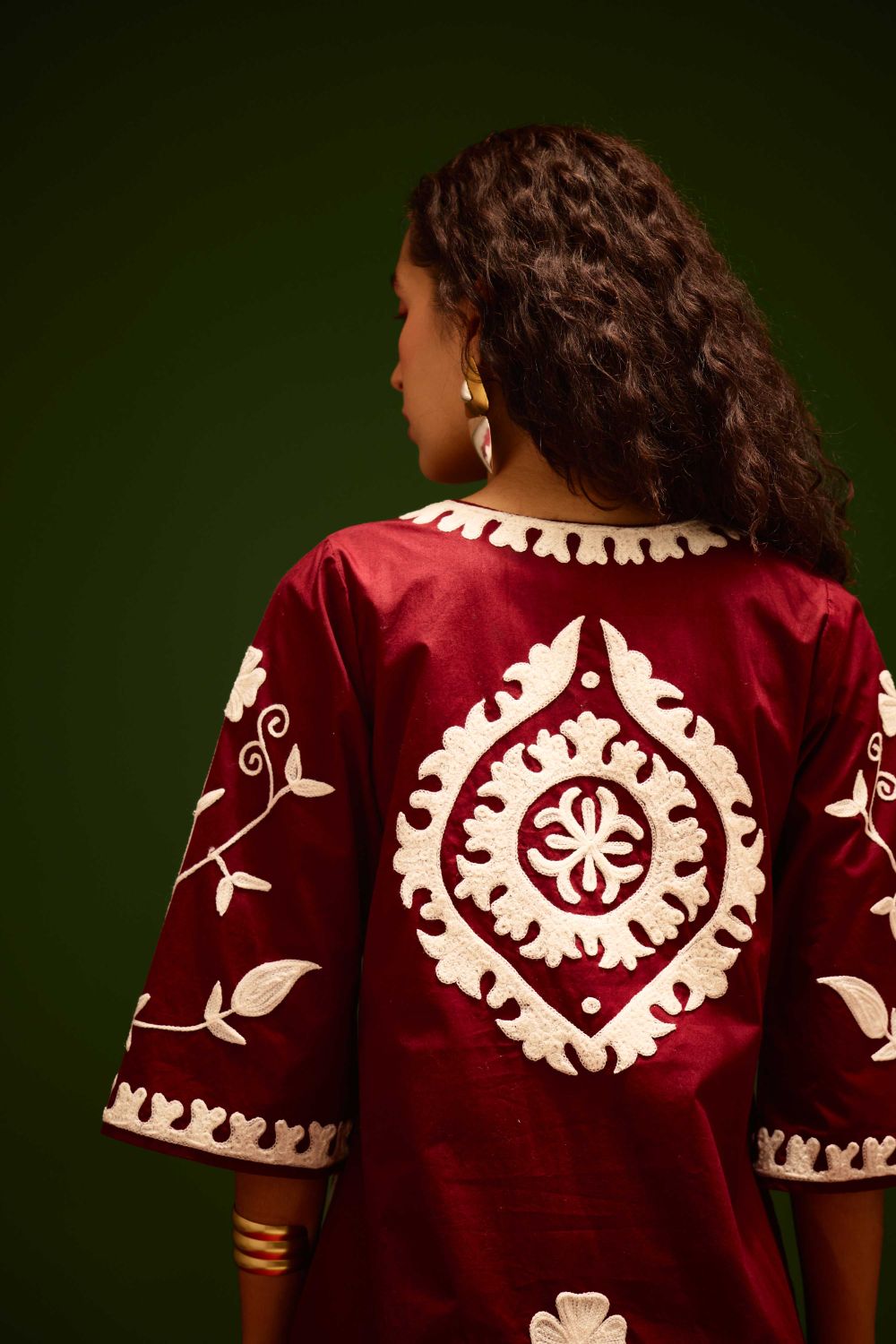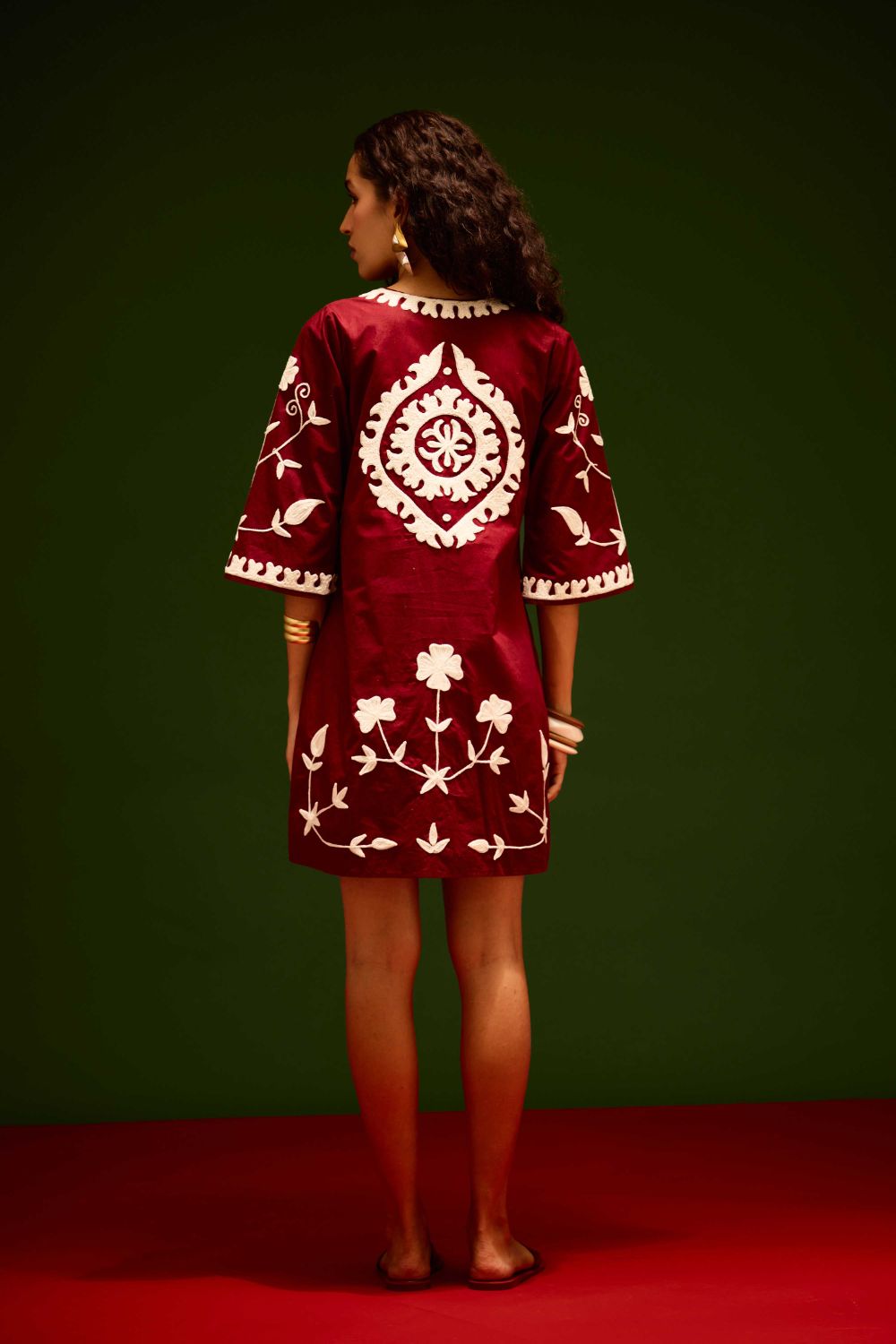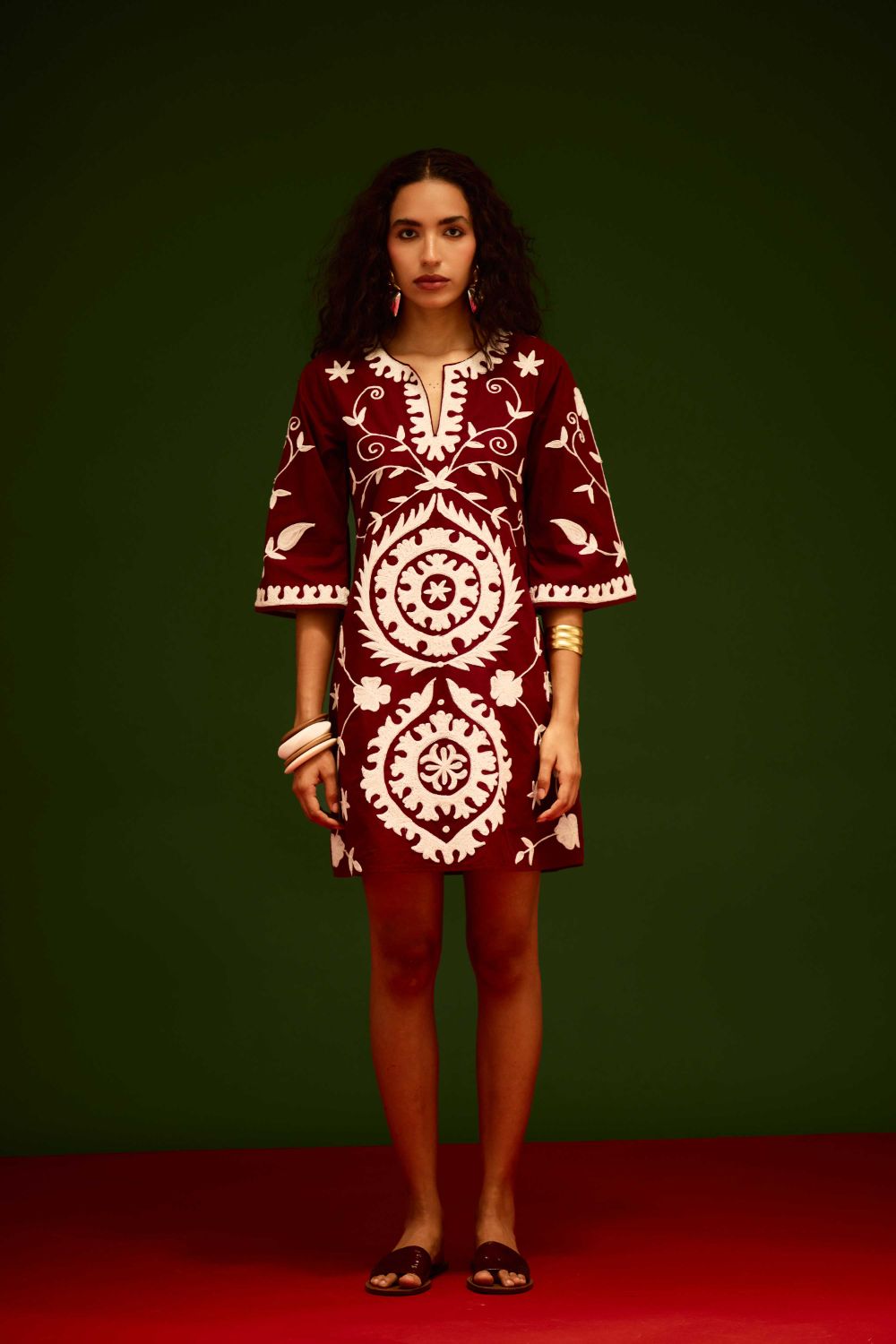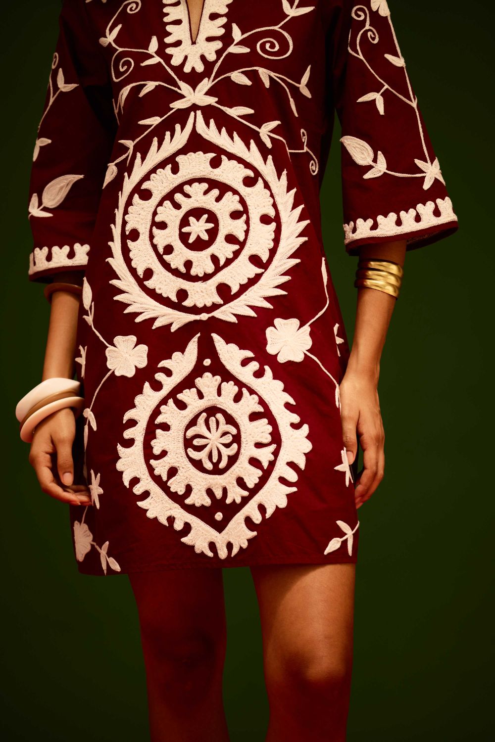 Burgundy Wine Cotton Dress with Ivory Wave Thread Embroidery