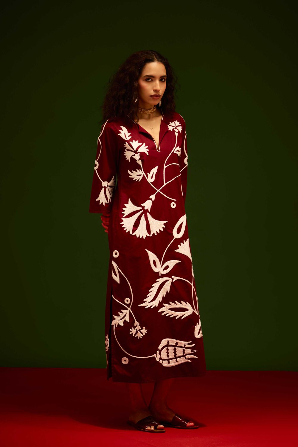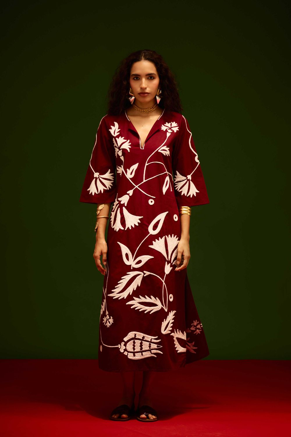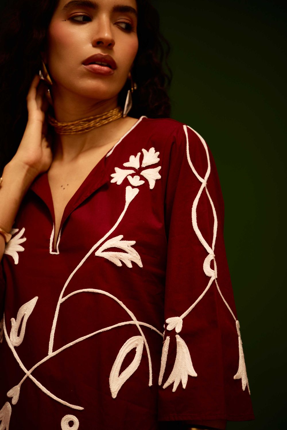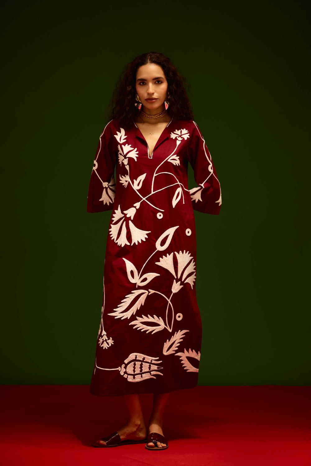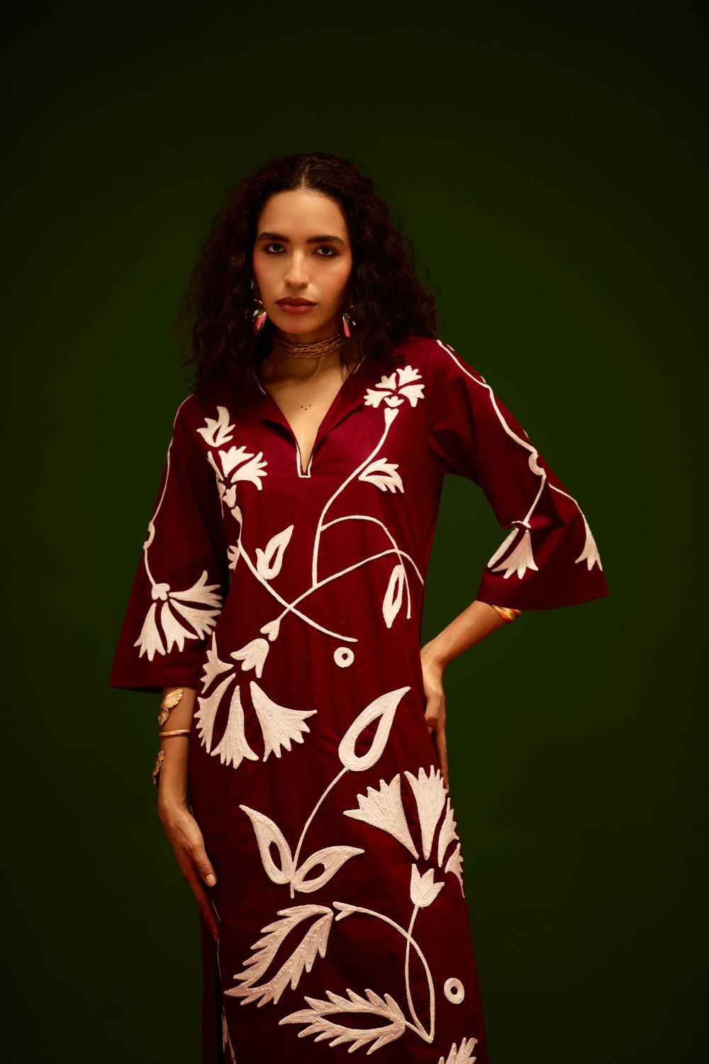 Burgundy Wine Cotton Maxi Dress with Ivory Botanical Thread Embroidery