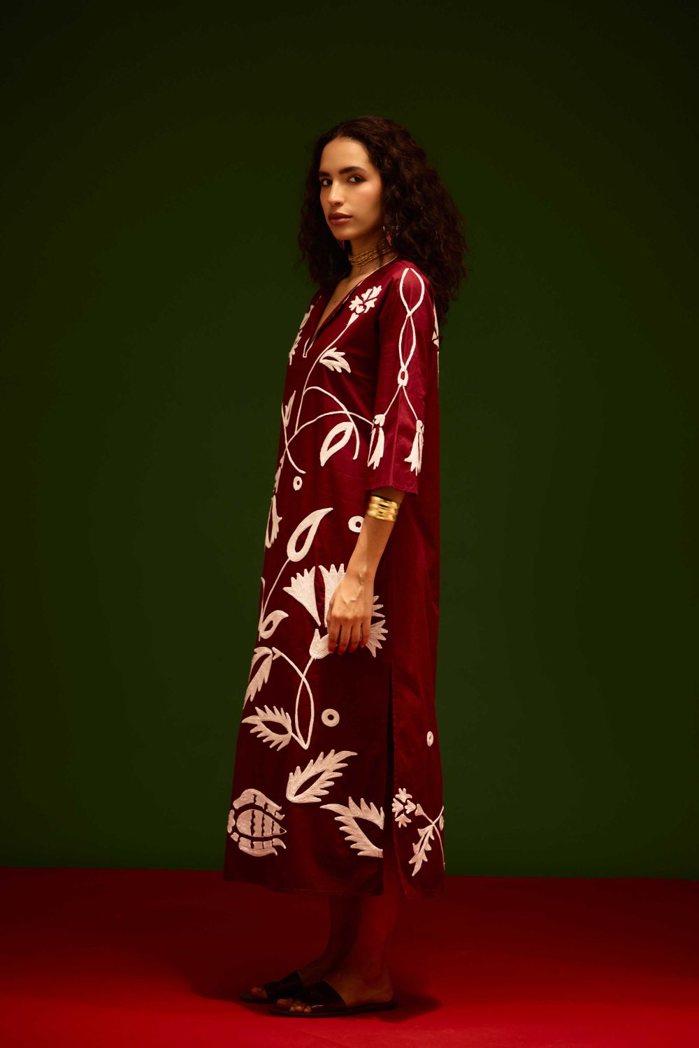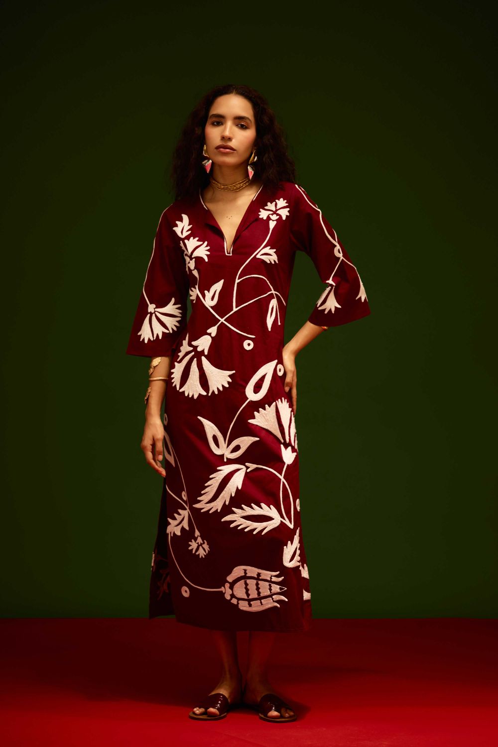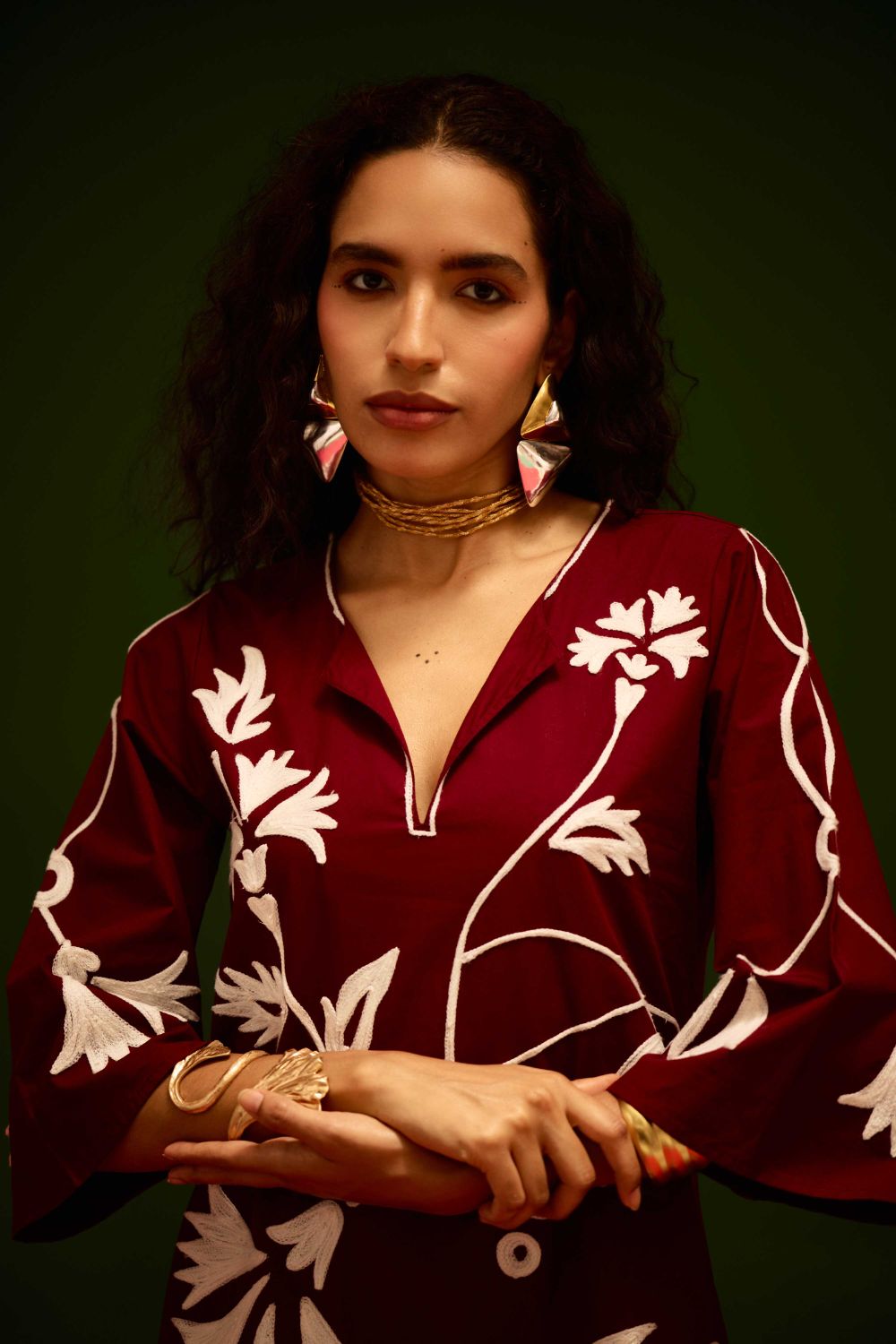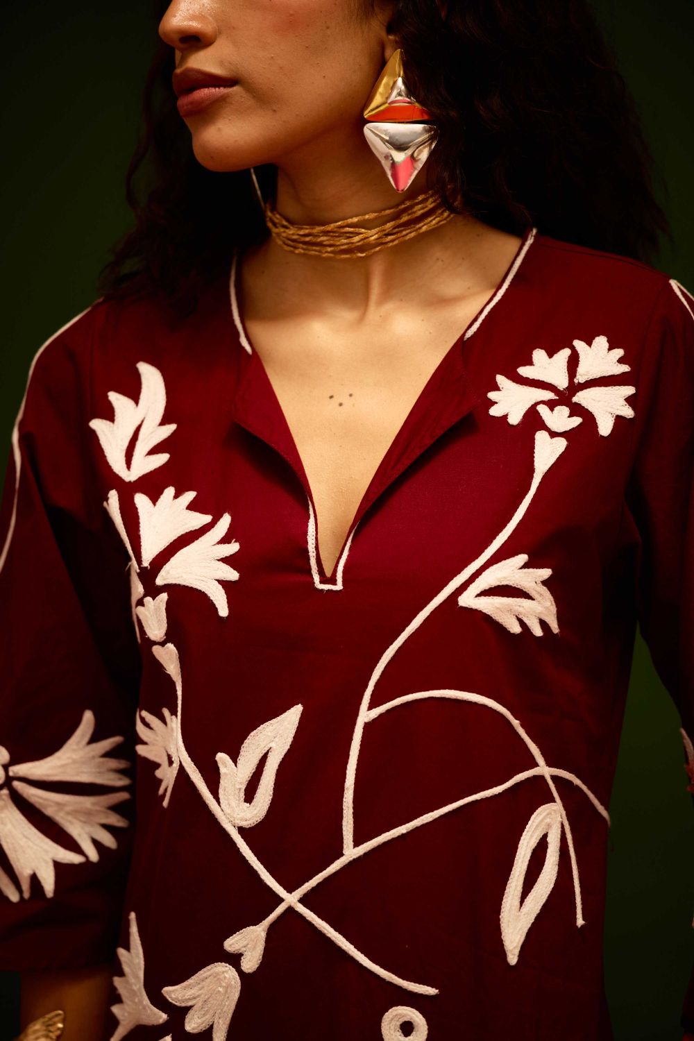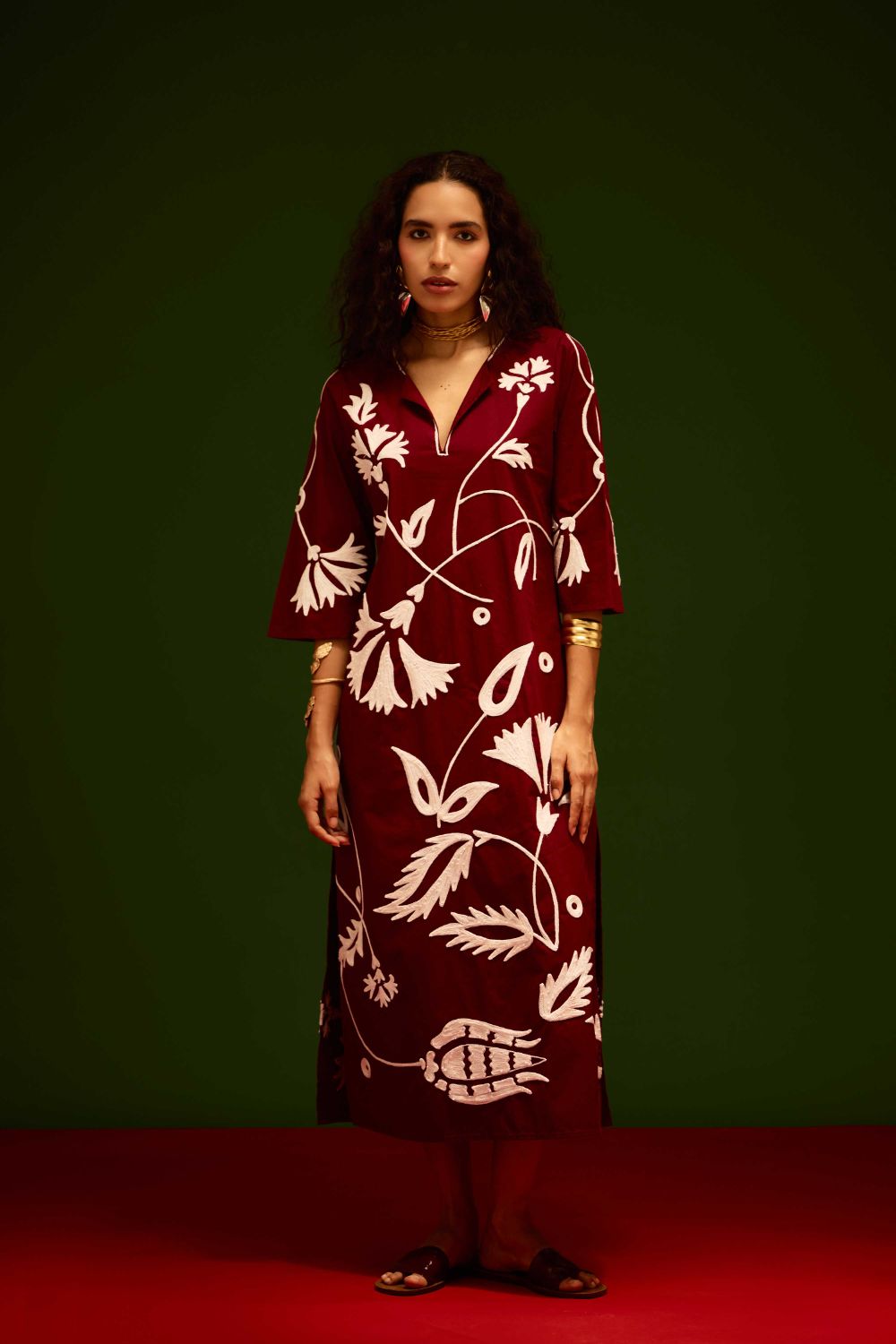 Burgundy Wine Cotton Maxi Dress with Ivory Botanical Thread Embroidery